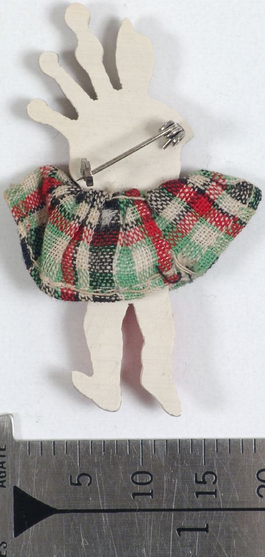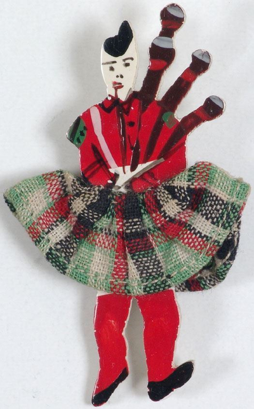 This is a great vintage hand-painted pin. It is made of some sort of plastic and has an older-style pin mechanism. There's no indication whether this Scottish fellow actually came from Scotland. SIZE: Approx. 2 1/2" high x 1 1/4" wide.