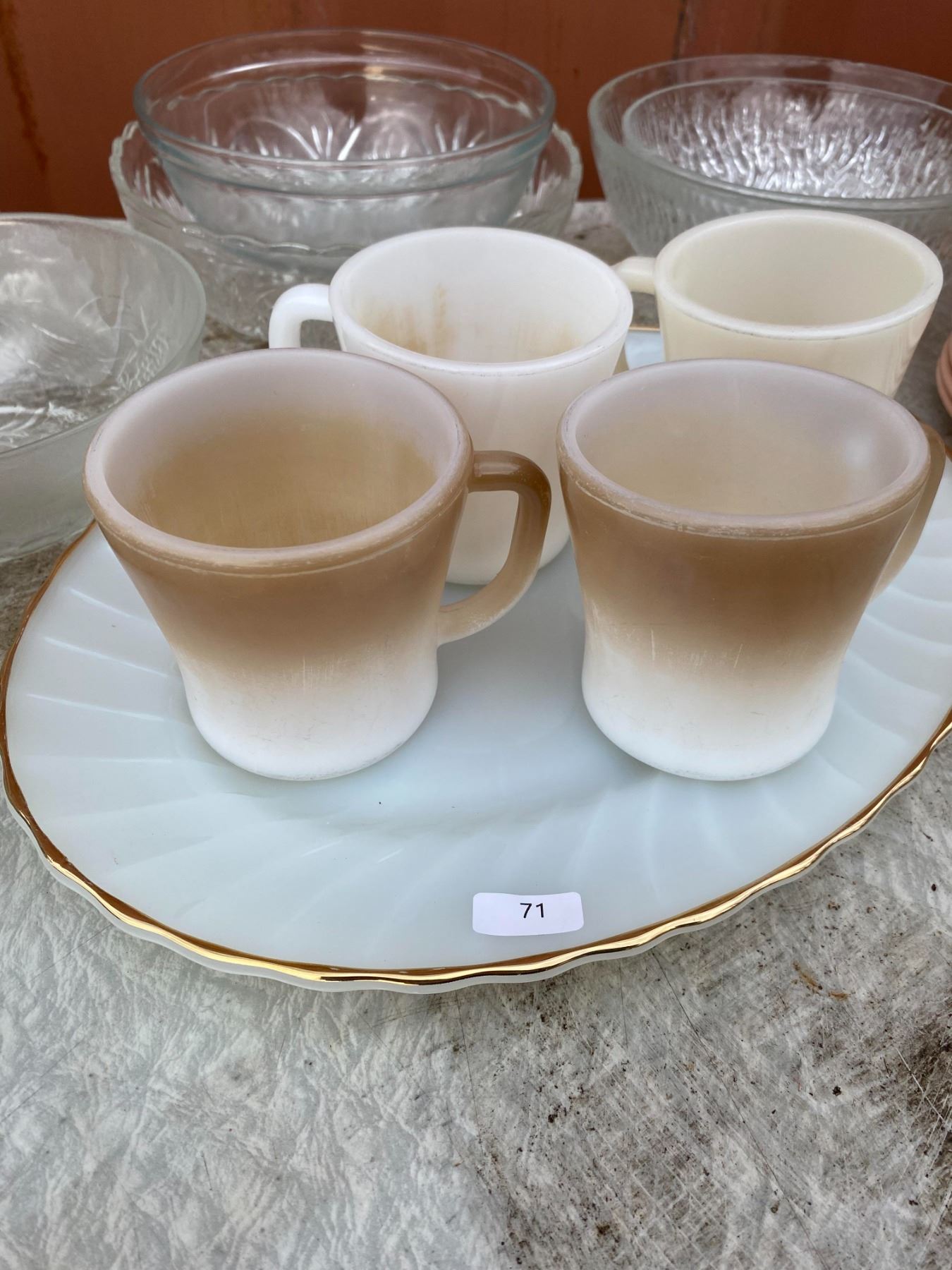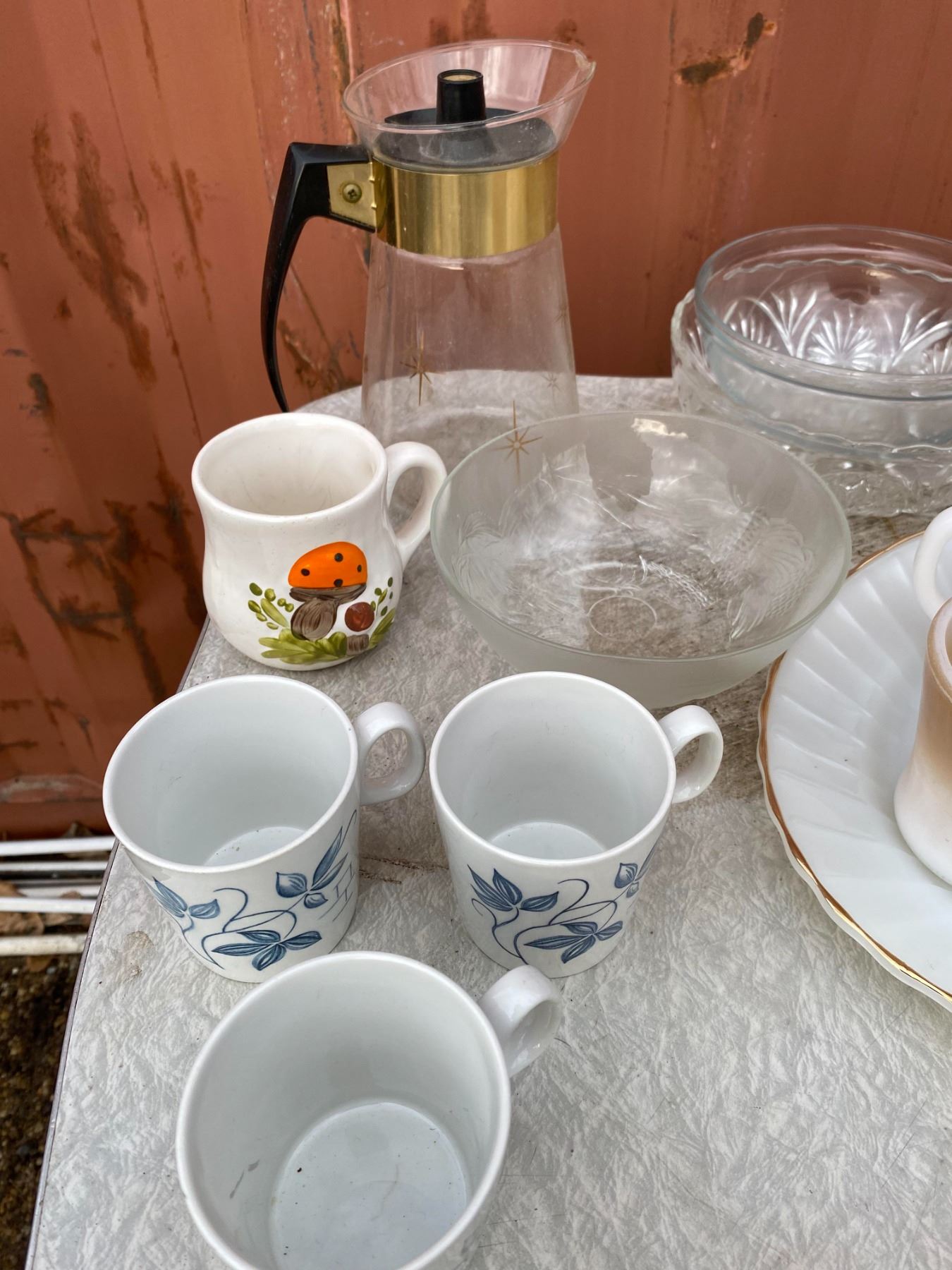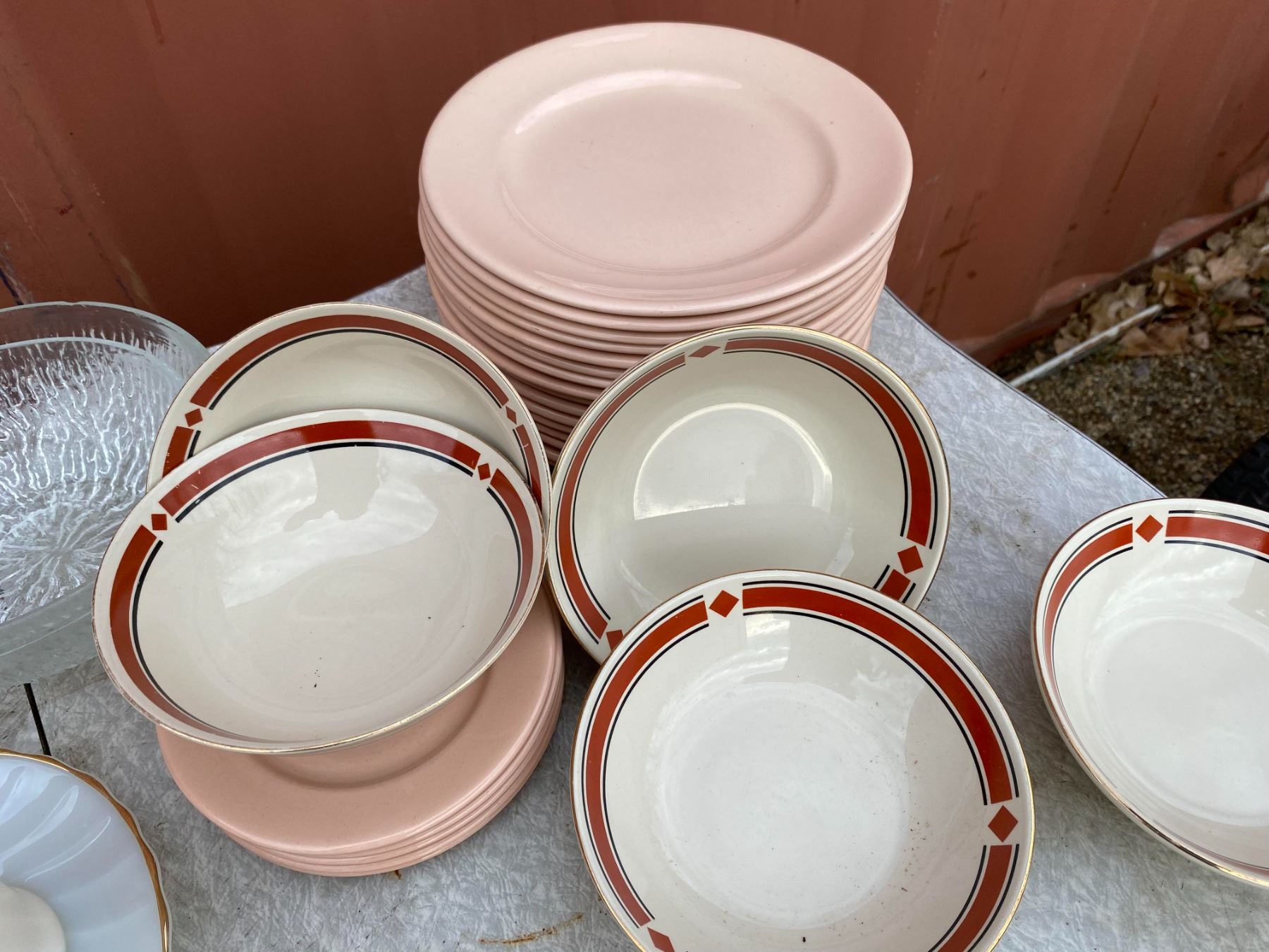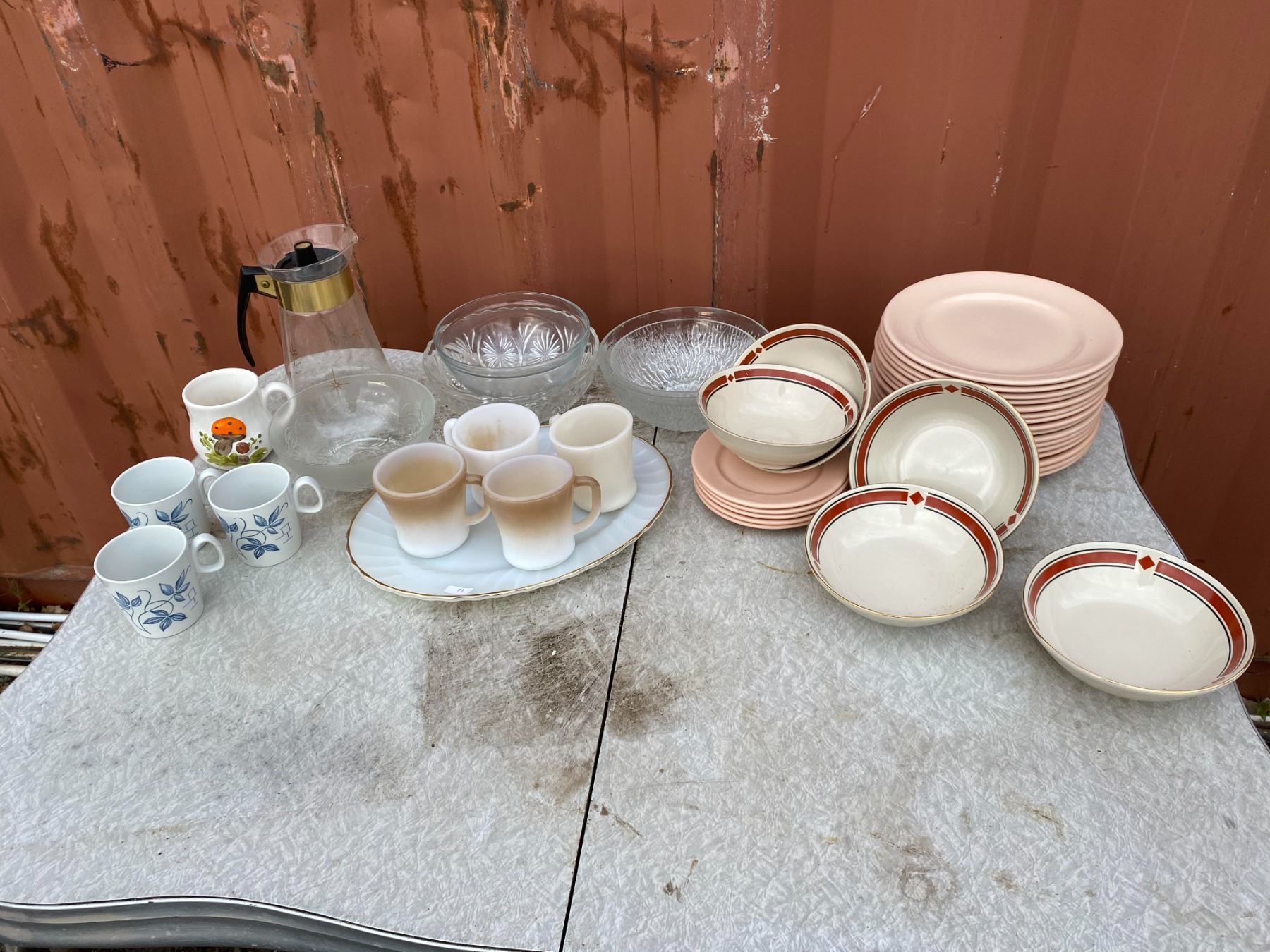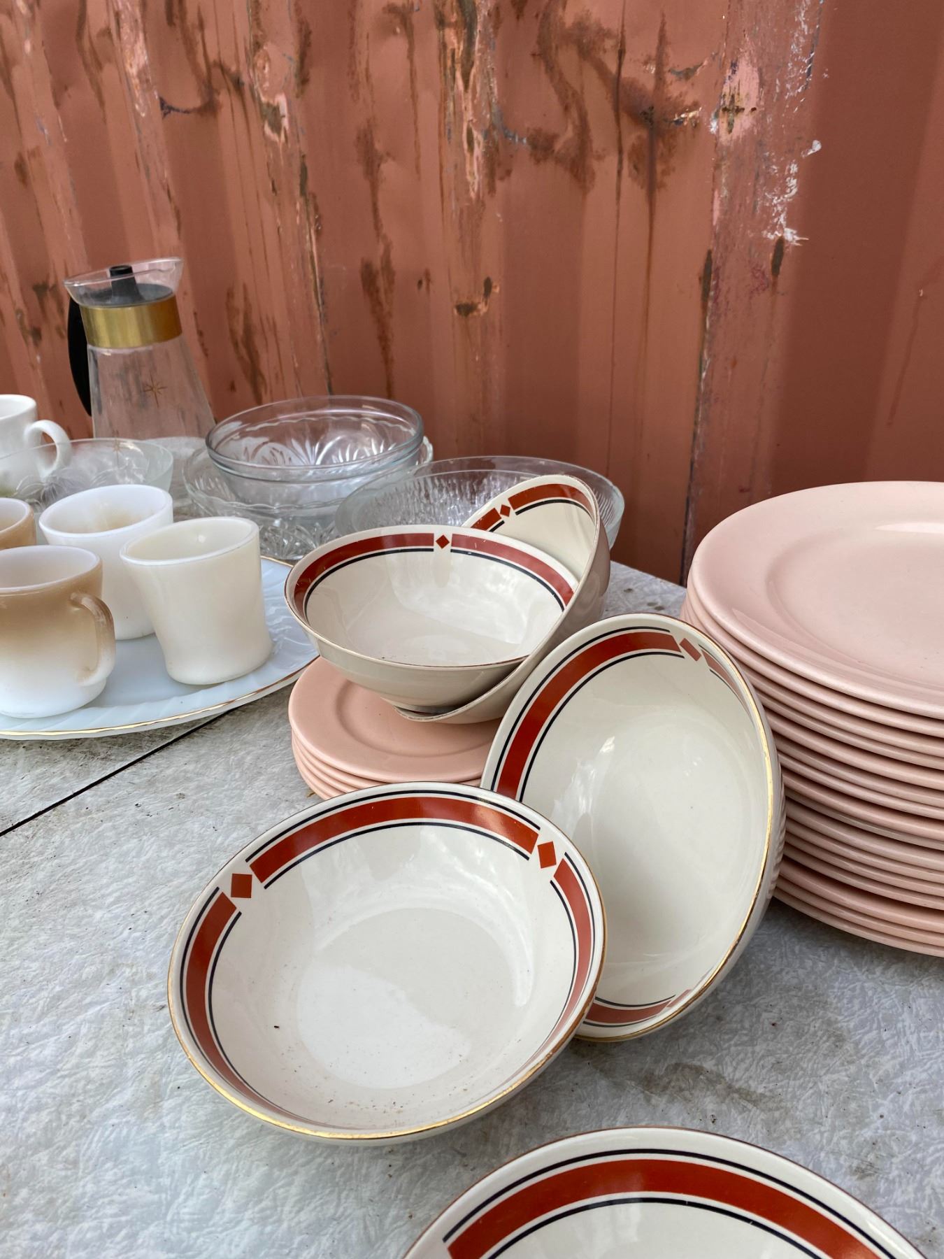 Assorted vintage dishware including pink plates, patterned bowls, Fire King mugs, glass bowls, and a retro coffee carafe. Ideal for cottage decor, daily use, or resale, with light age wear throughout.