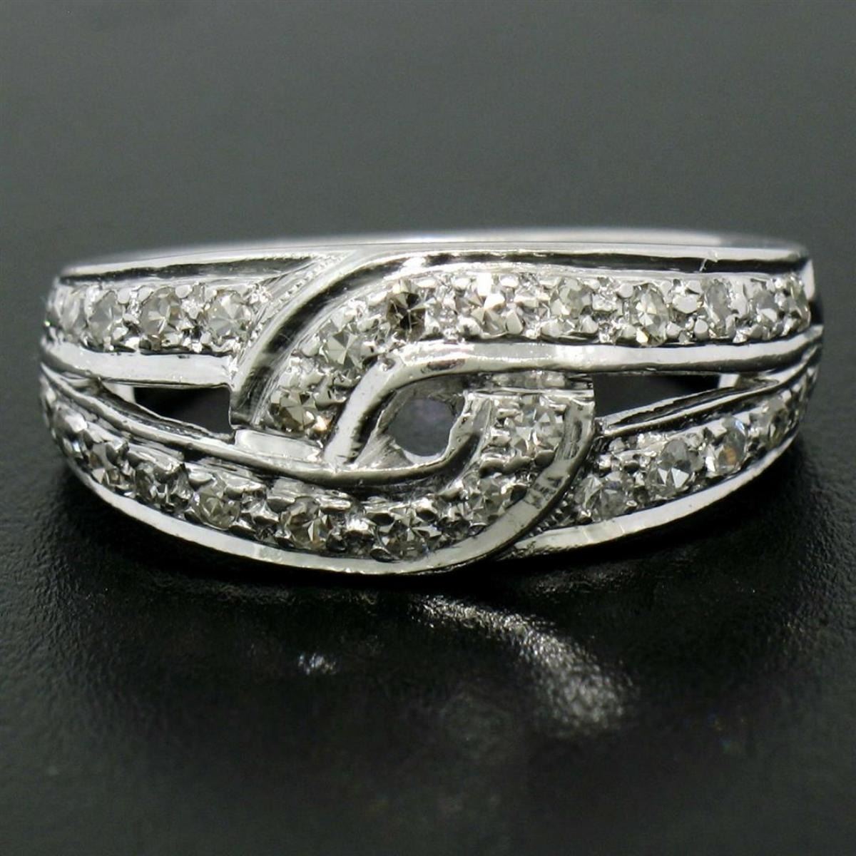 Vintage Platinum 0.50ctw Round Single Cut Pave Diamond Interlocking Band Ring. A vintage solid 950 platinum band ring featuring 28 round single cut natural diamonds (G/H - VS1/VS2; 0.50ctw). The ring is size 5.5, weighs a total of 7.51 grams, and measures 8.75mm wide.