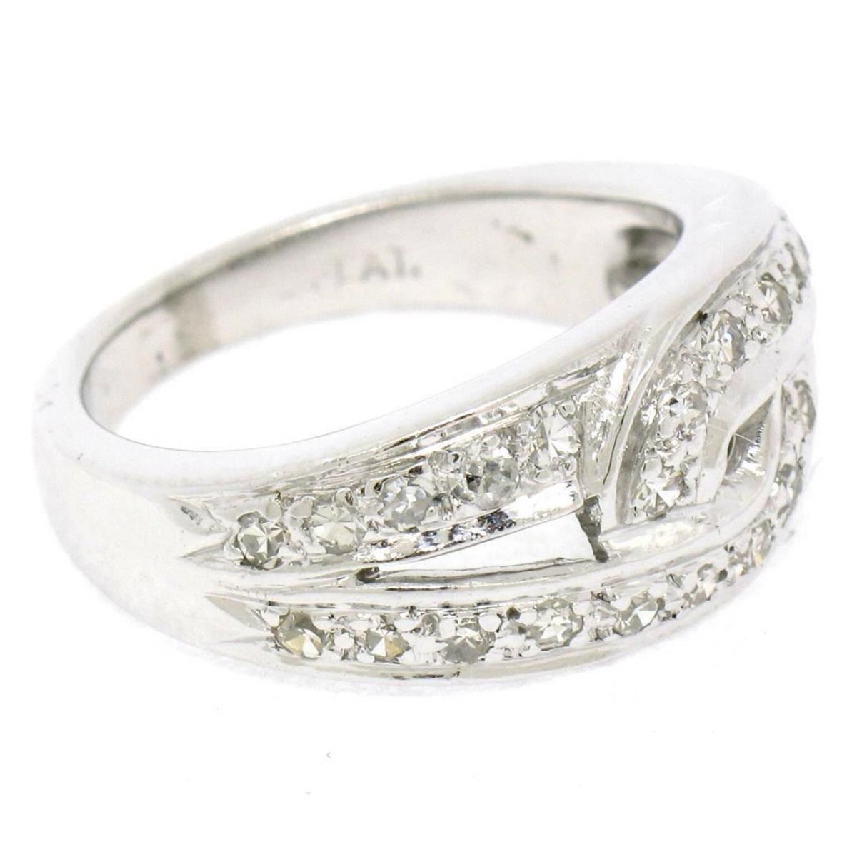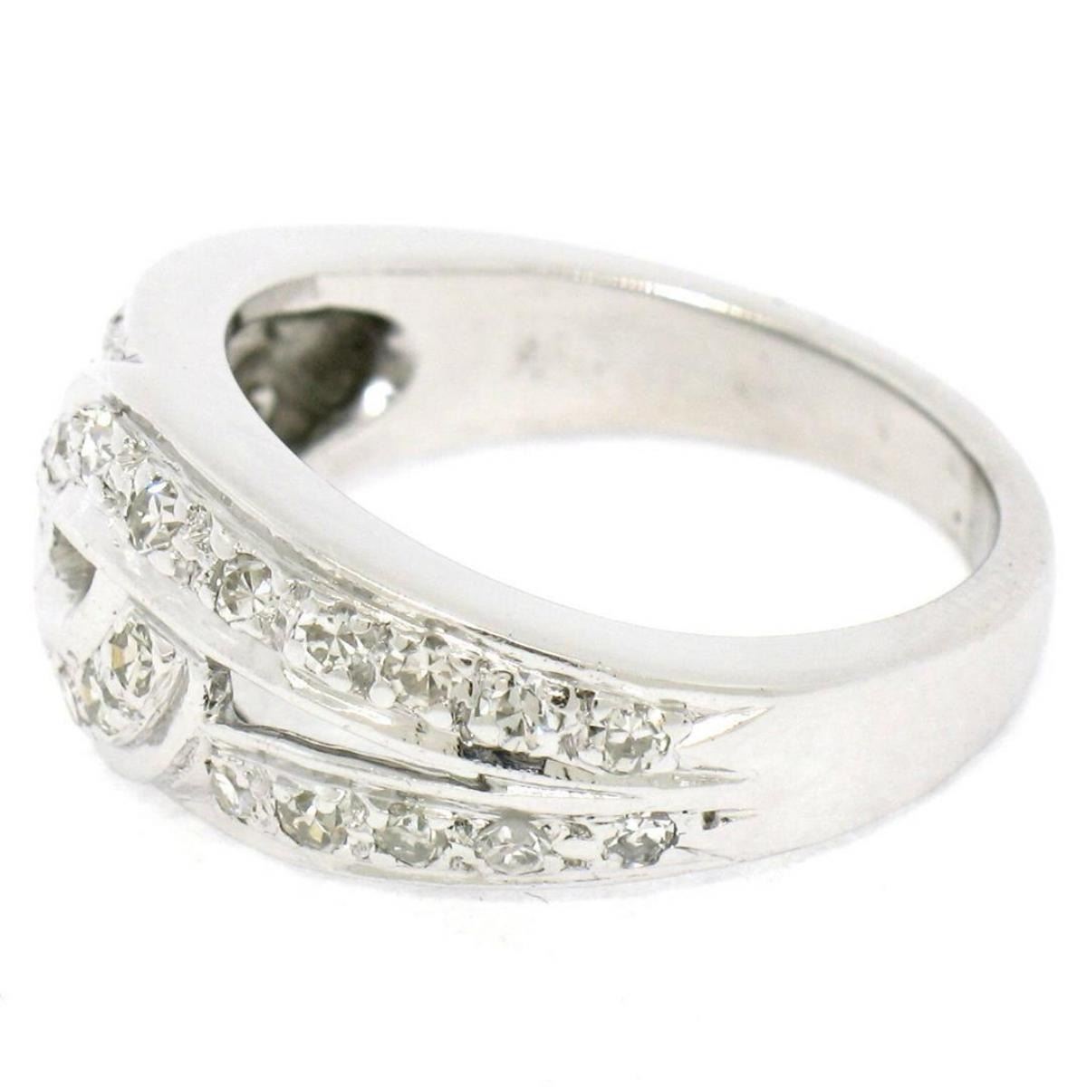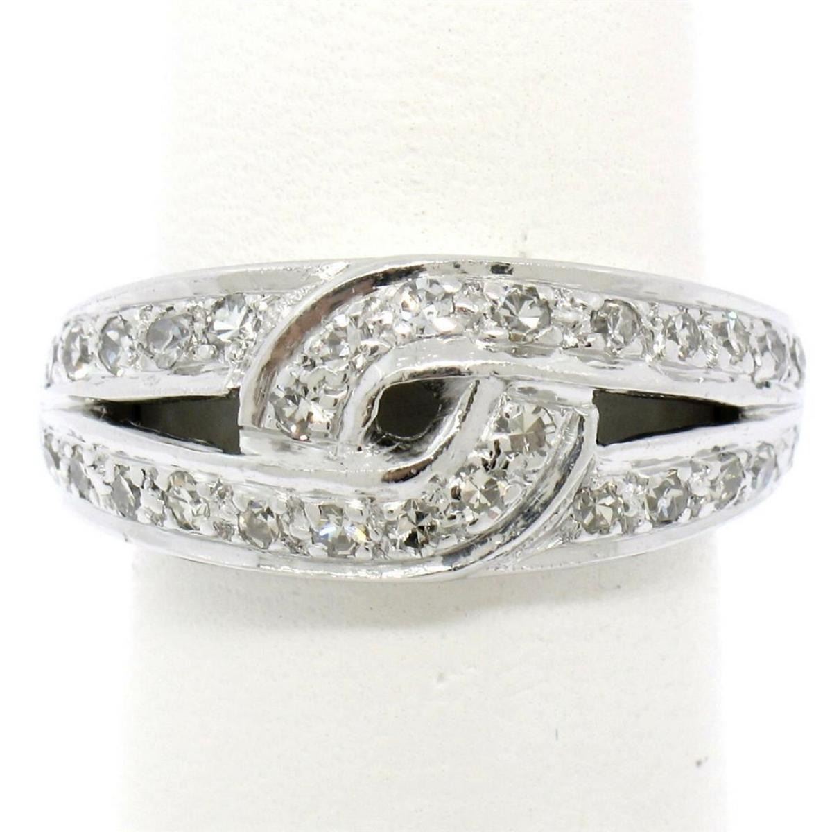 Vintage Platinum 0.50ctw Round Single Cut Pave Diamond Interlocking Band Ring. A vintage solid 950 platinum band ring featuring 28 round single cut natural diamonds (G/H - VS1/VS2; 0.50ctw). The ring is size 5.5, weighs a total of 7.51 grams, and measures 8.75mm wide.