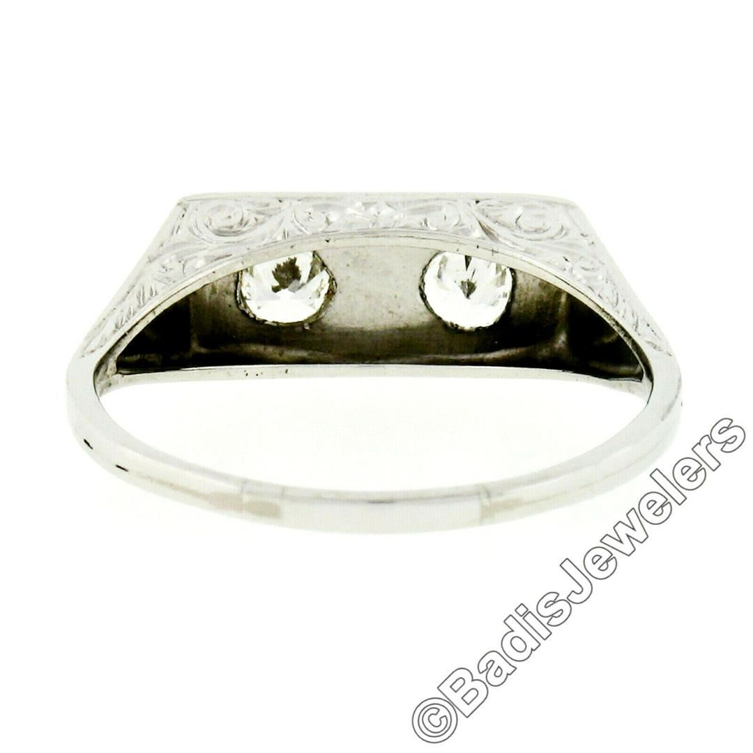 A hand engraved vintage platinum band ring featuring a pair of round transitional cut diamonds (H/I - VS2/SI1; 0.52ctw). The ring is size 8.5, weighs a total of 3.87 grams, and measures 6.65mm wide.