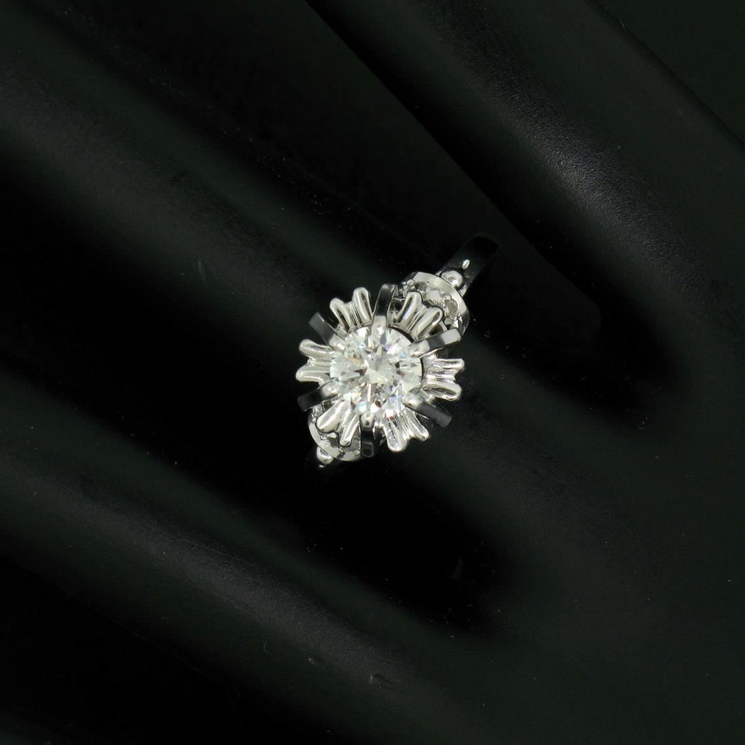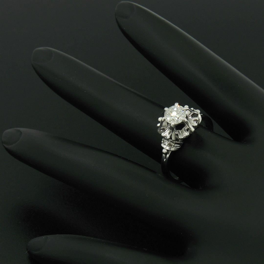 A like new vintage platinum ring featuring a 0.65ct round transitional cut diamond (G - SI1) accented by 0.03ctw of round single cut diamonds (G/H - SI1). The ring is size 6.5, weighs a total of 5.02 grams, and measures 10.6mm wide.