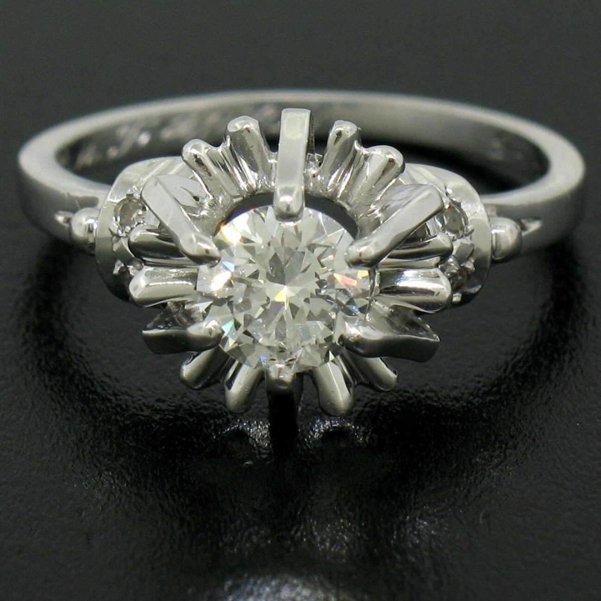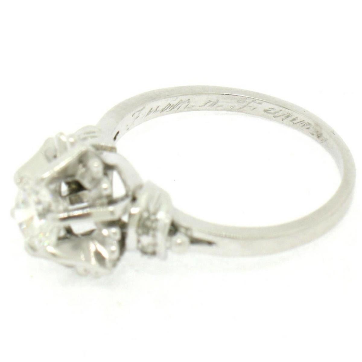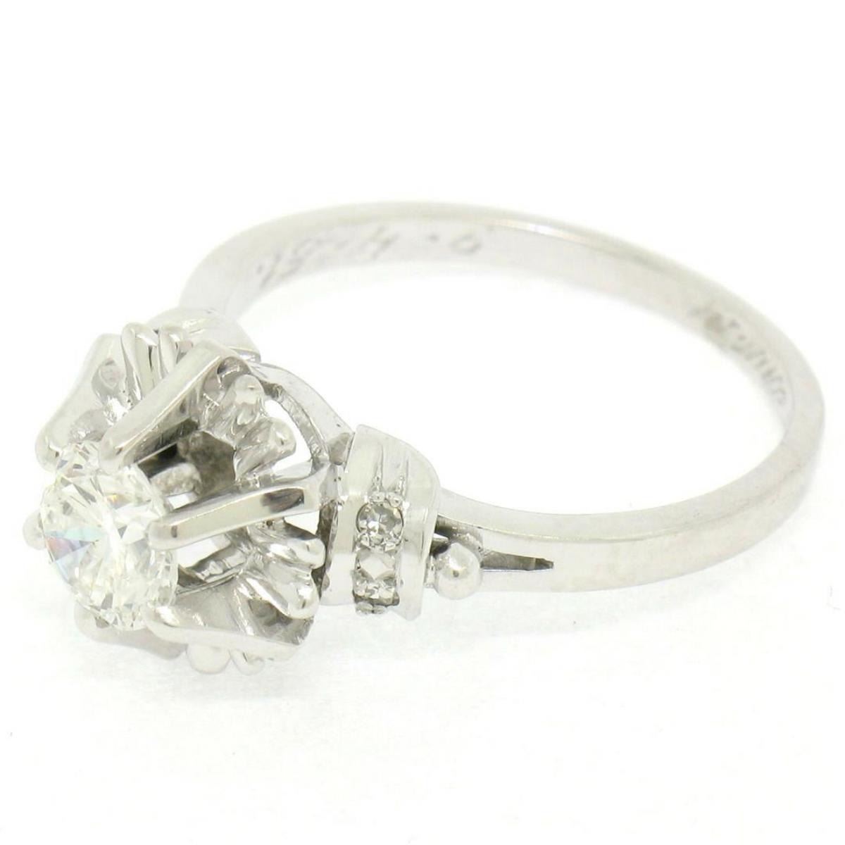 A like new vintage platinum ring featuring a 0.65ct round transitional cut diamond (G - SI1) accented by 0.03ctw of round single cut diamonds (G/H - SI1). The ring is size 6.5, weighs a total of 5.02 grams, and measures 10.6mm wide.