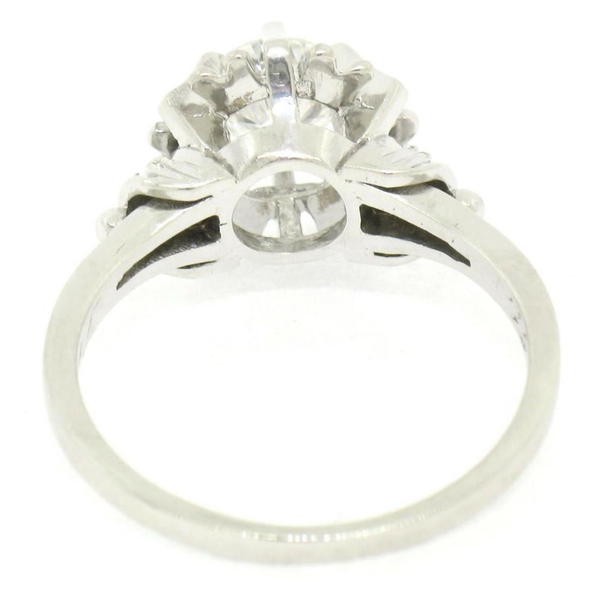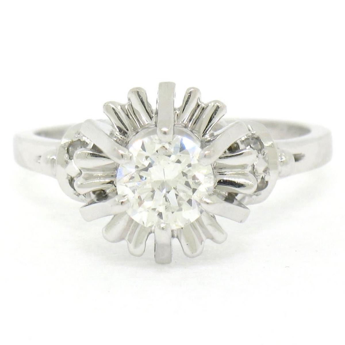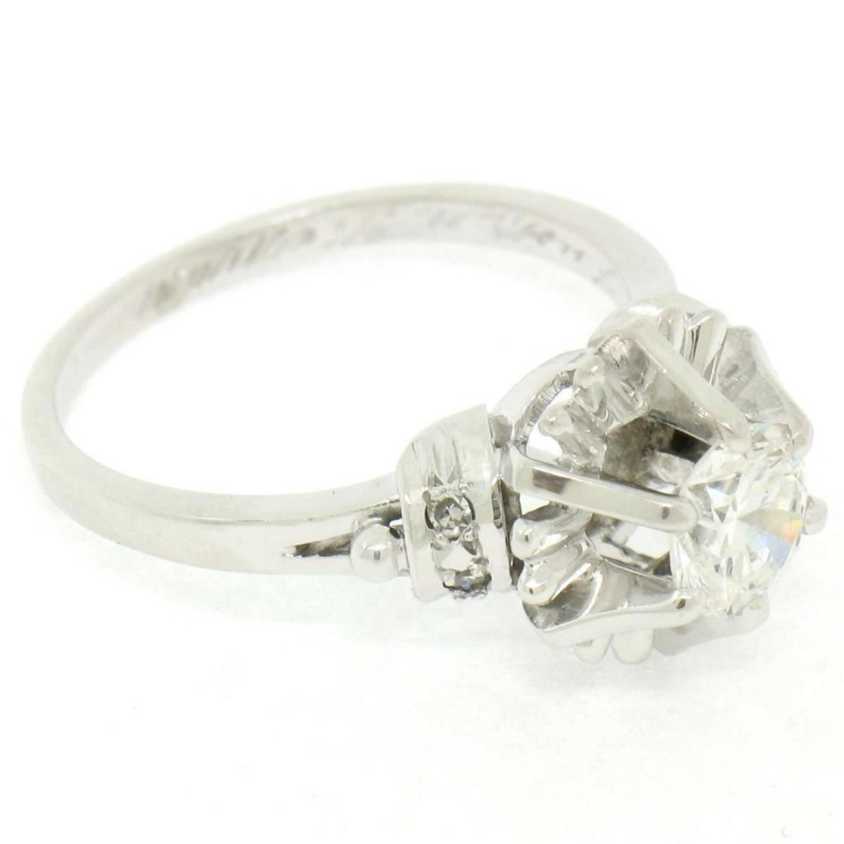 A like new vintage platinum ring featuring a 0.65ct round transitional cut diamond (G - SI1) accented by 0.03ctw of round single cut diamonds (G/H - SI1). The ring is size 6.5, weighs a total of 5.02 grams, and measures 10.6mm wide.