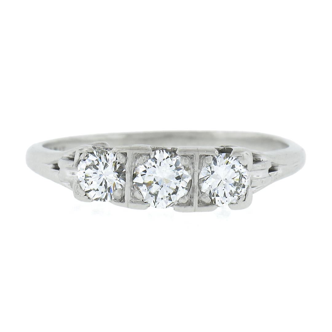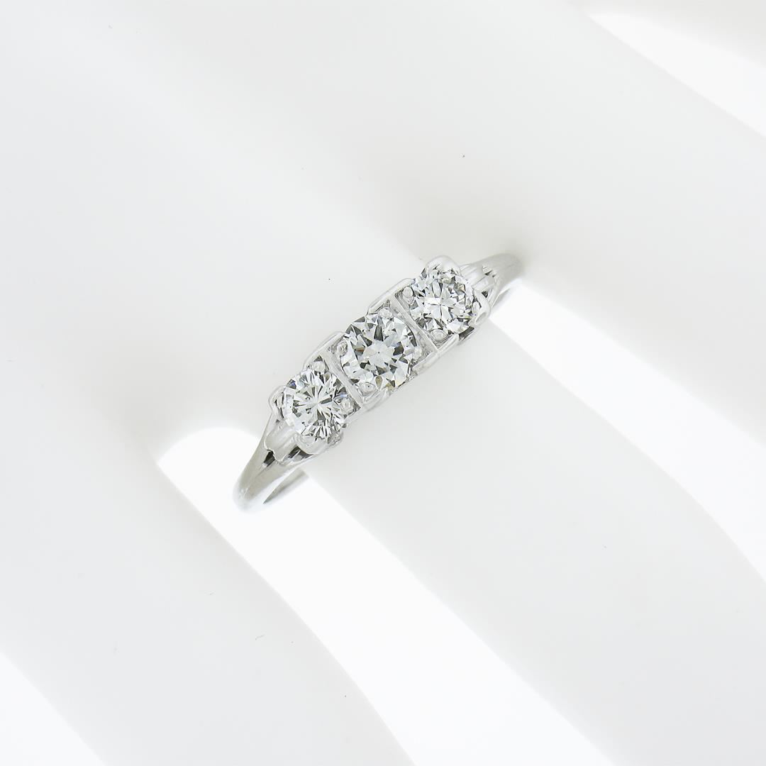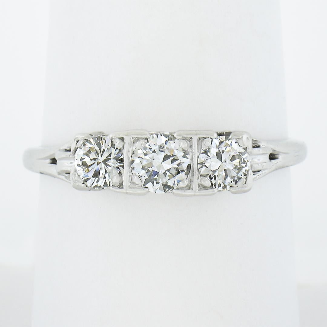 A vintage solid paltinum band ring, featuring 3 old transitional cut natural diamonds (F/G - VS1/VS2 ; 0.80ctw). The ring is size 9.5, weighs a total of 4.79 grams, and measures 4.8mm wide.