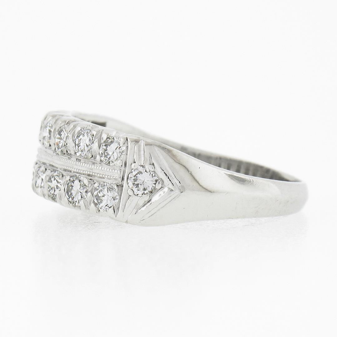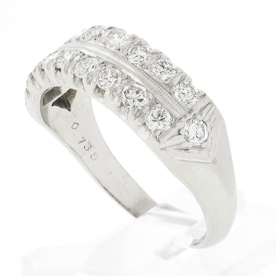 A vintage solid platinum band ring, with 18 round brilliant cut natural diamonds (F/G - VS1/VS2 ; 1ctw). The ring is size 7.5, weighs a total of 7.31 grams, and measures 6.6mm wide.