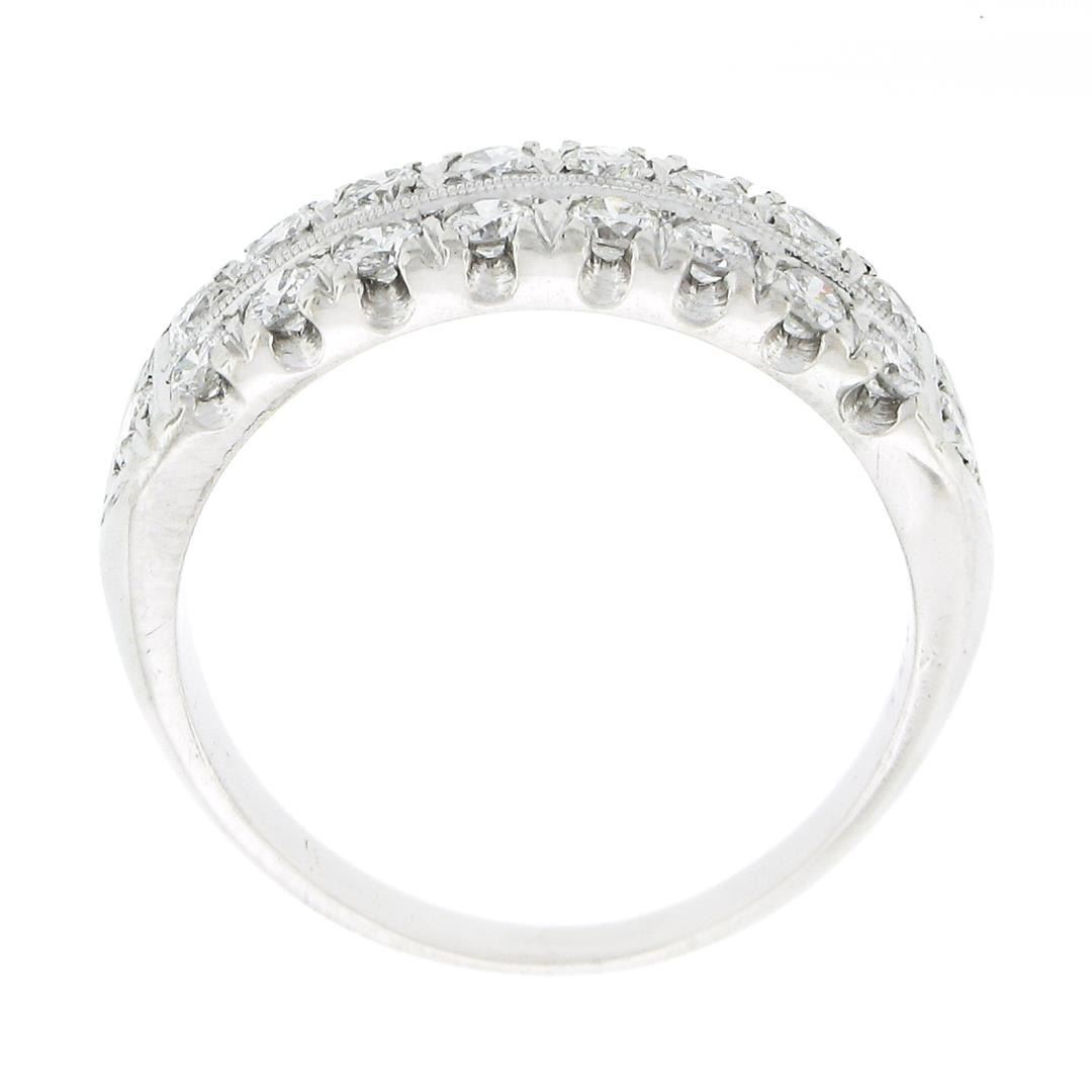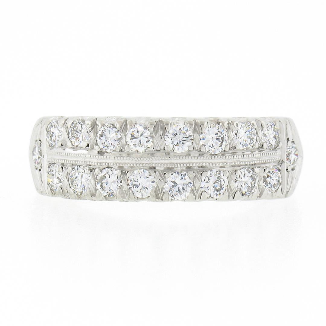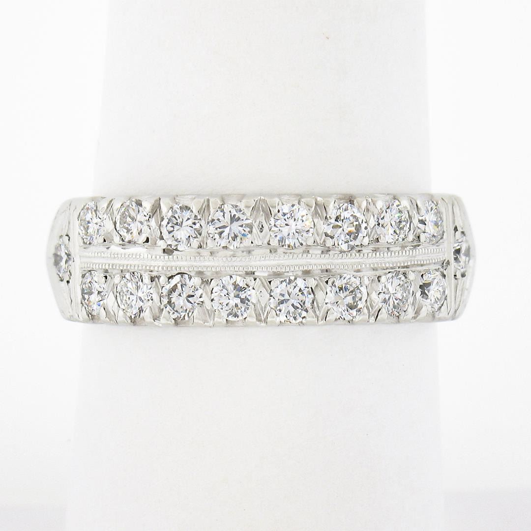 A vintage solid platinum band ring, with 18 round brilliant cut natural diamonds (F/G - VS1/VS2 ; 1ctw). The ring is size 7.5, weighs a total of 7.31 grams, and measures 6.6mm wide.