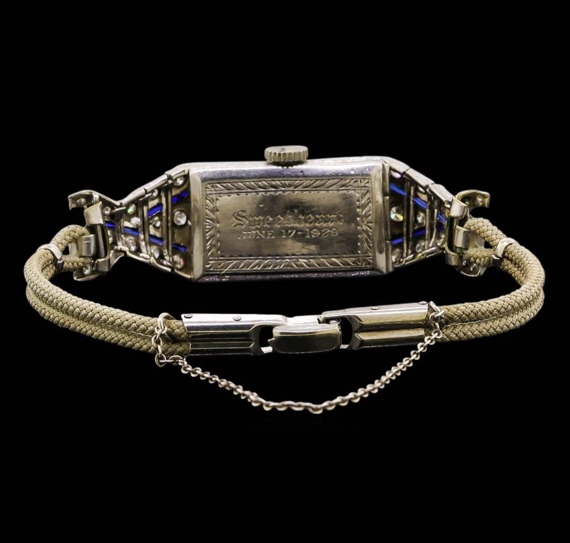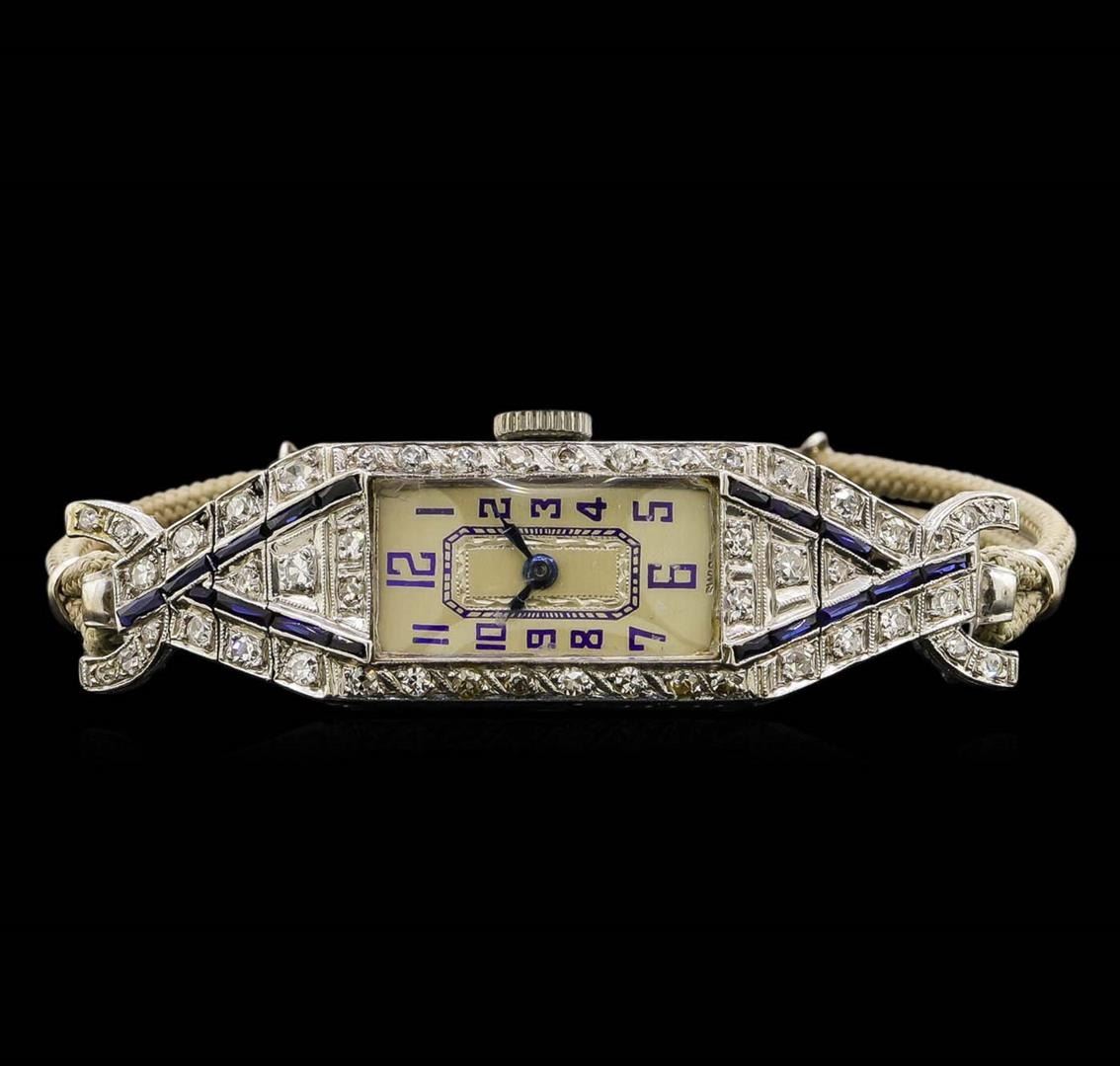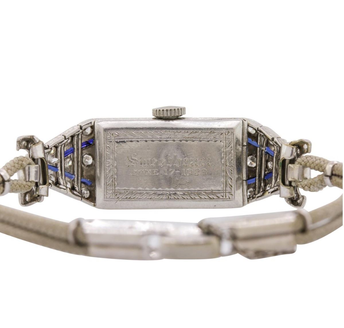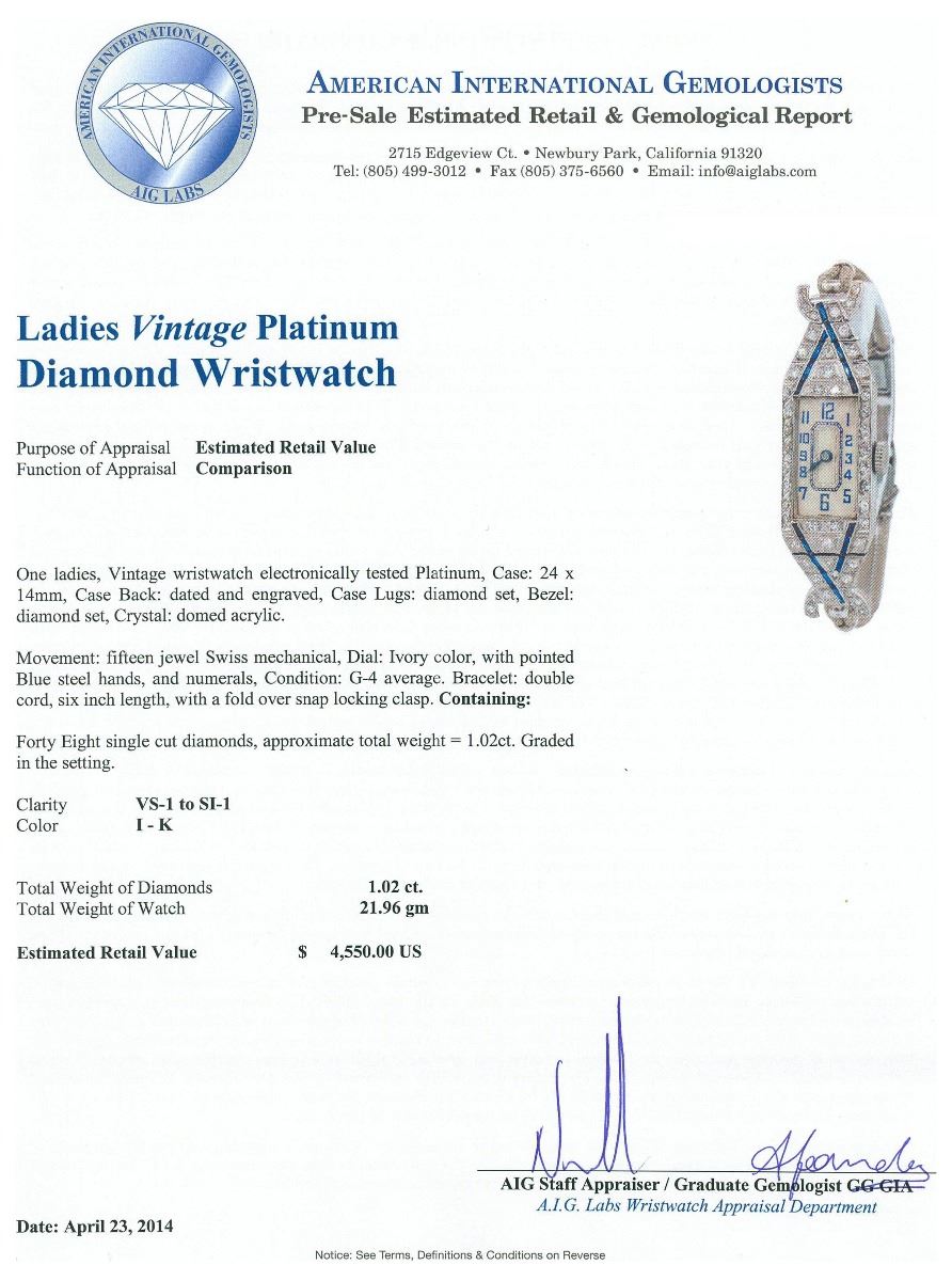 One ladies, Vintage wristwatch electronically tested Platinum, Case: 24 x 14mm, Case Back: dated and engraved, Case Lugs: diamond set, Bezel: diamond set, Crystal: domed acrylic. Movement: fifteen jewel Swiss mechanical, Dial: Ivory color, with pointed Blue steel hands, and numerals, Condition: G-4 average. Bracelet: double cord, six inch length, with a fold over snap locking clasp. Containing: Forty Eight single cut diamonds, approximate total weight = 1.02ct. Graded in the setting. Clarity: VS-1 to SI-1. Color: I - K. Total Weight of Diamonds 1.02ct. Total Weight of Watch 21.96 grams. AIG Appraised at $4,550.00.