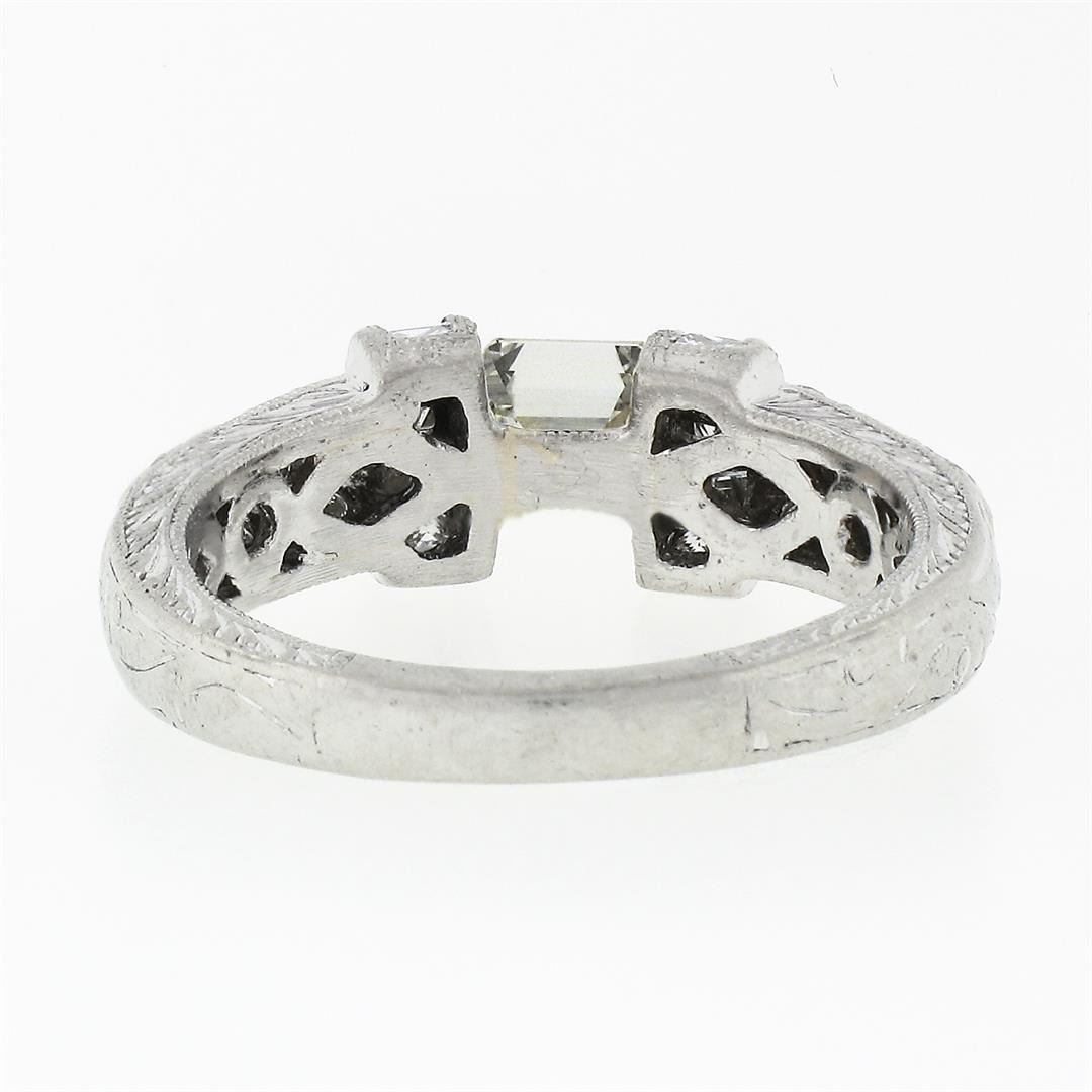 A vintage solid platinum floating band ring, with 1 emerald cut natural diamond (G - VS1 ; 0.50ct ), and 10 princess cut natural diamonds (G/H - VS1/VS2 ; 0.50ct), with 30 round brilliant cut natural diamonds (G/H - VS1/VS2 ; 0.35ct). The ring is size 6.5, weighs a total of 7.76 grams, and measures 6.6mm wide.