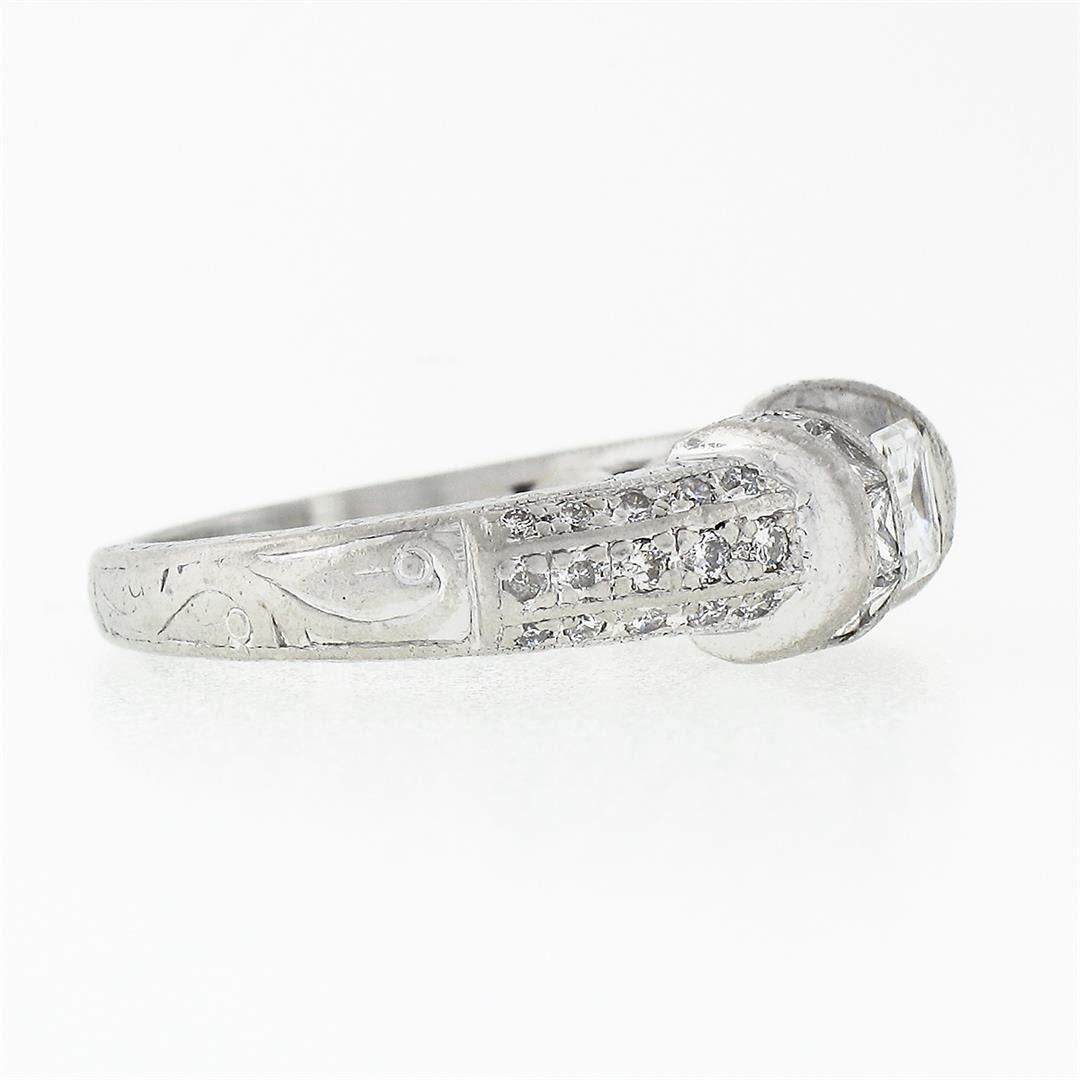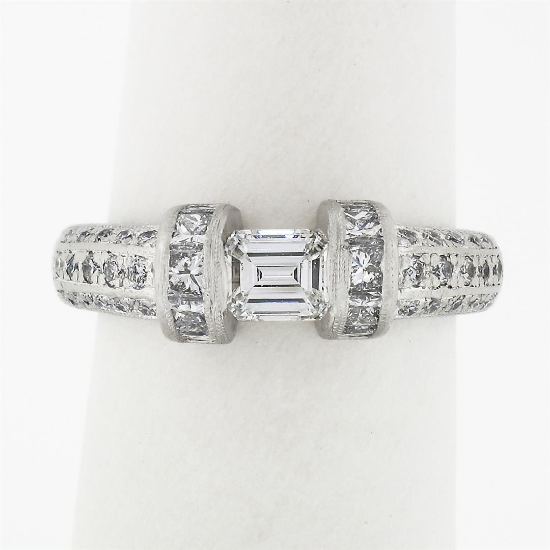 A vintage solid platinum floating band ring, with 1 emerald cut natural diamond (G - VS1 ; 0.50ct ), and 10 princess cut natural diamonds (G/H - VS1/VS2 ; 0.50ct), with 30 round brilliant cut natural diamonds (G/H - VS1/VS2 ; 0.35ct). The ring is size 6.5, weighs a total of 7.76 grams, and measures 6.6mm wide.