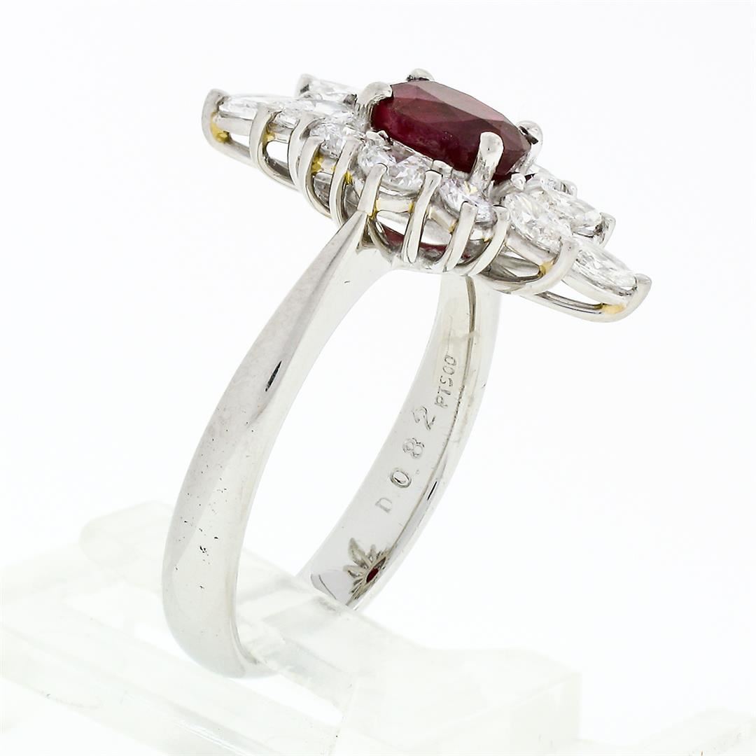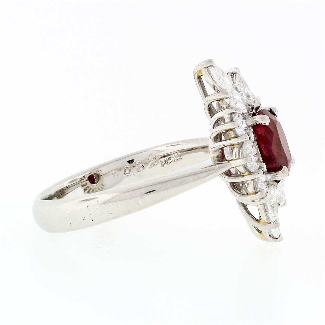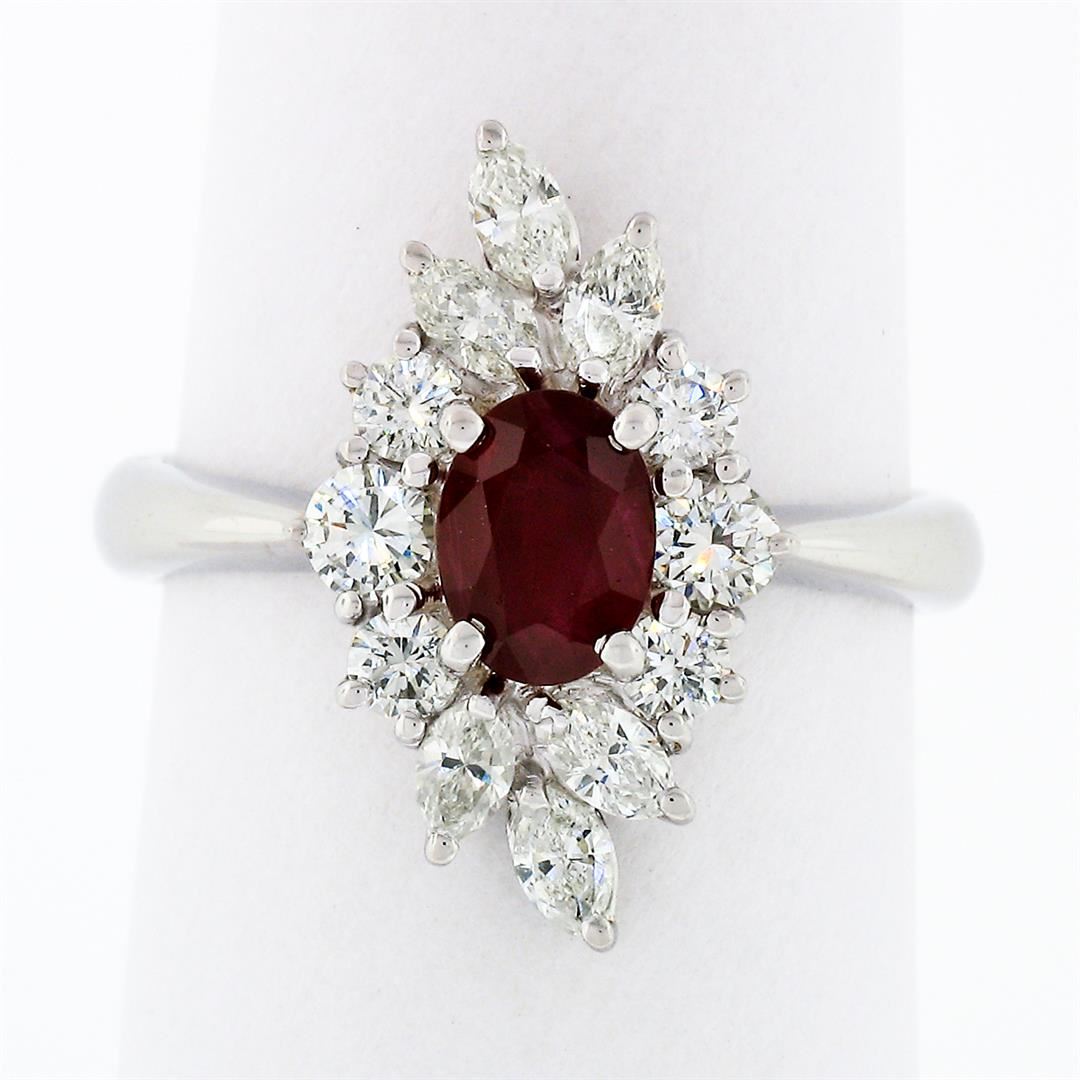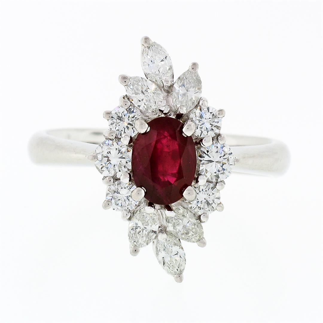 A vintage solid platinum dinner ring with 1 GIA certified oval brilliant cut natural ruby (6.44 x 4.81 - 1.20ct) surrounded by 12 natural dimaonds (F/G - VS1/VS2; 0.82ctw) -- 6 marquise cut and 6 round brilliant cut. The ring is size 6.5, weighs a total of 6.37 grams, and measures 18.4mm wide. Comes with all original relevant certifications.
