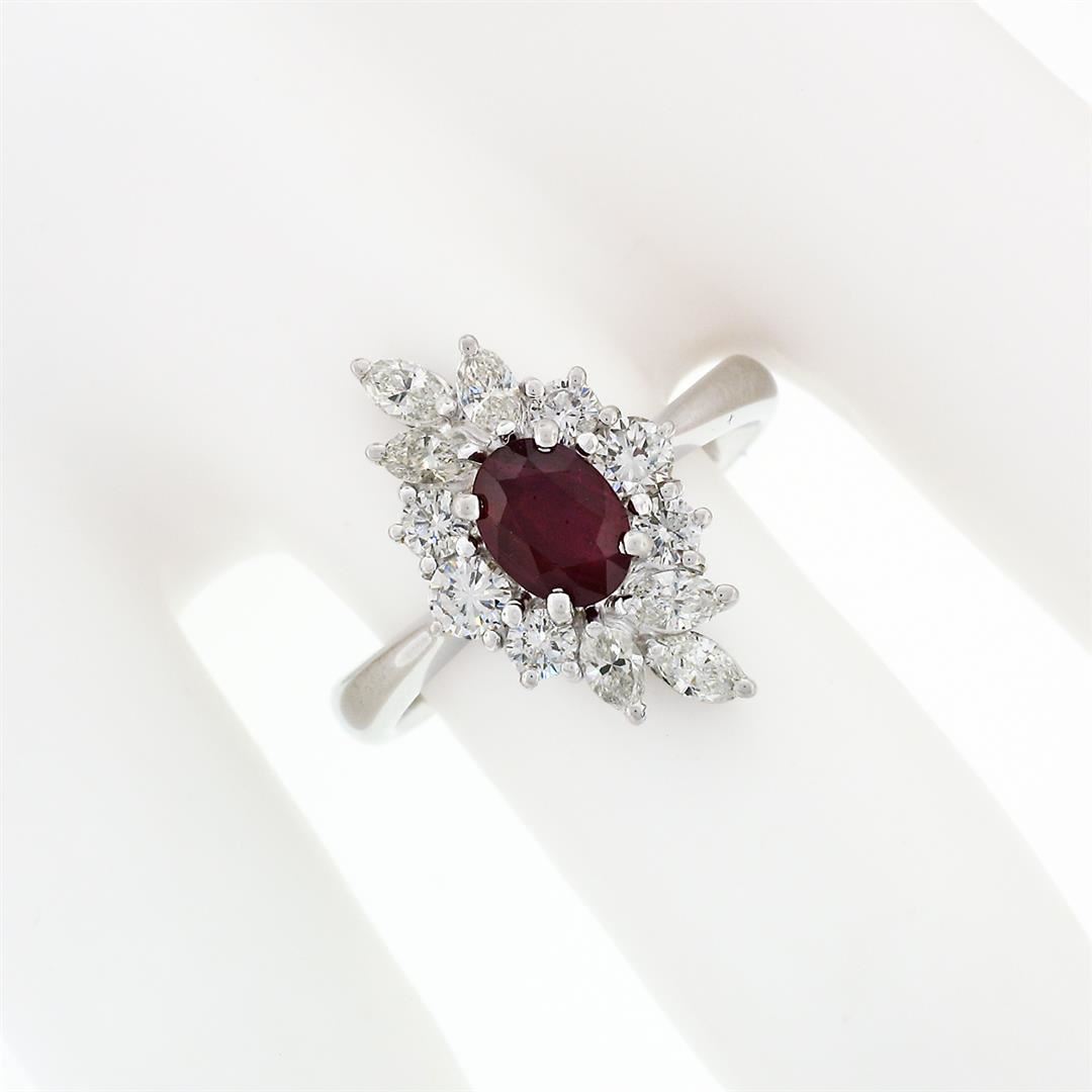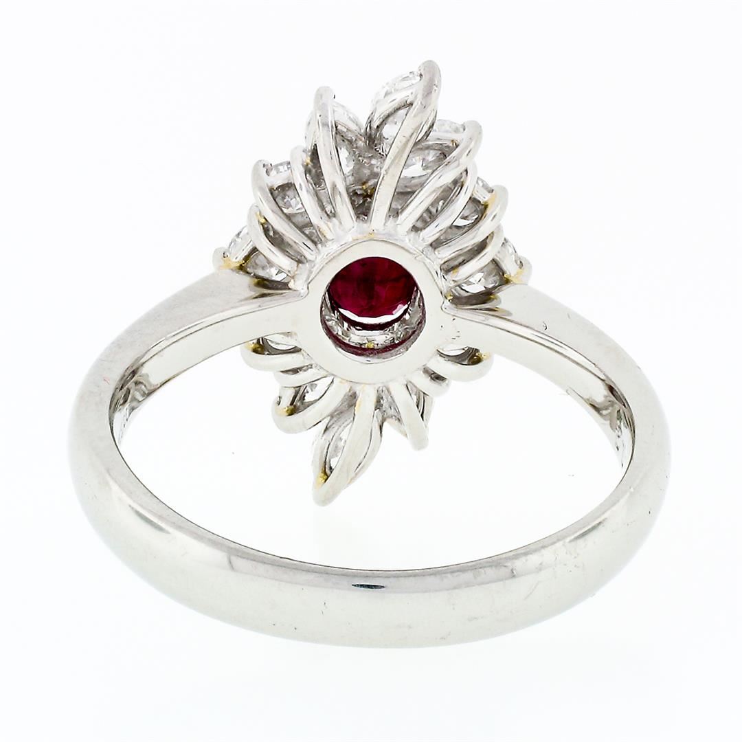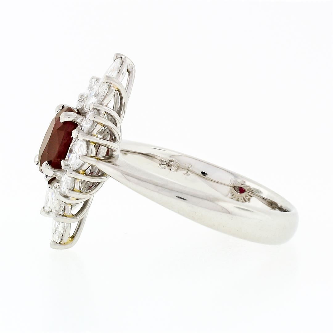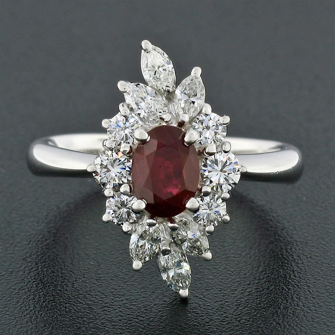 A vintage solid platinum dinner ring with 1 GIA certified oval brilliant cut natural ruby (6.44 x 4.81 - 1.20ct) surrounded by 12 natural dimaonds (F/G - VS1/VS2; 0.82ctw) -- 6 marquise cut and 6 round brilliant cut. The ring is size 6.5, weighs a total of 6.37 grams, and measures 18.4mm wide. Comes with all original relevant certifications.