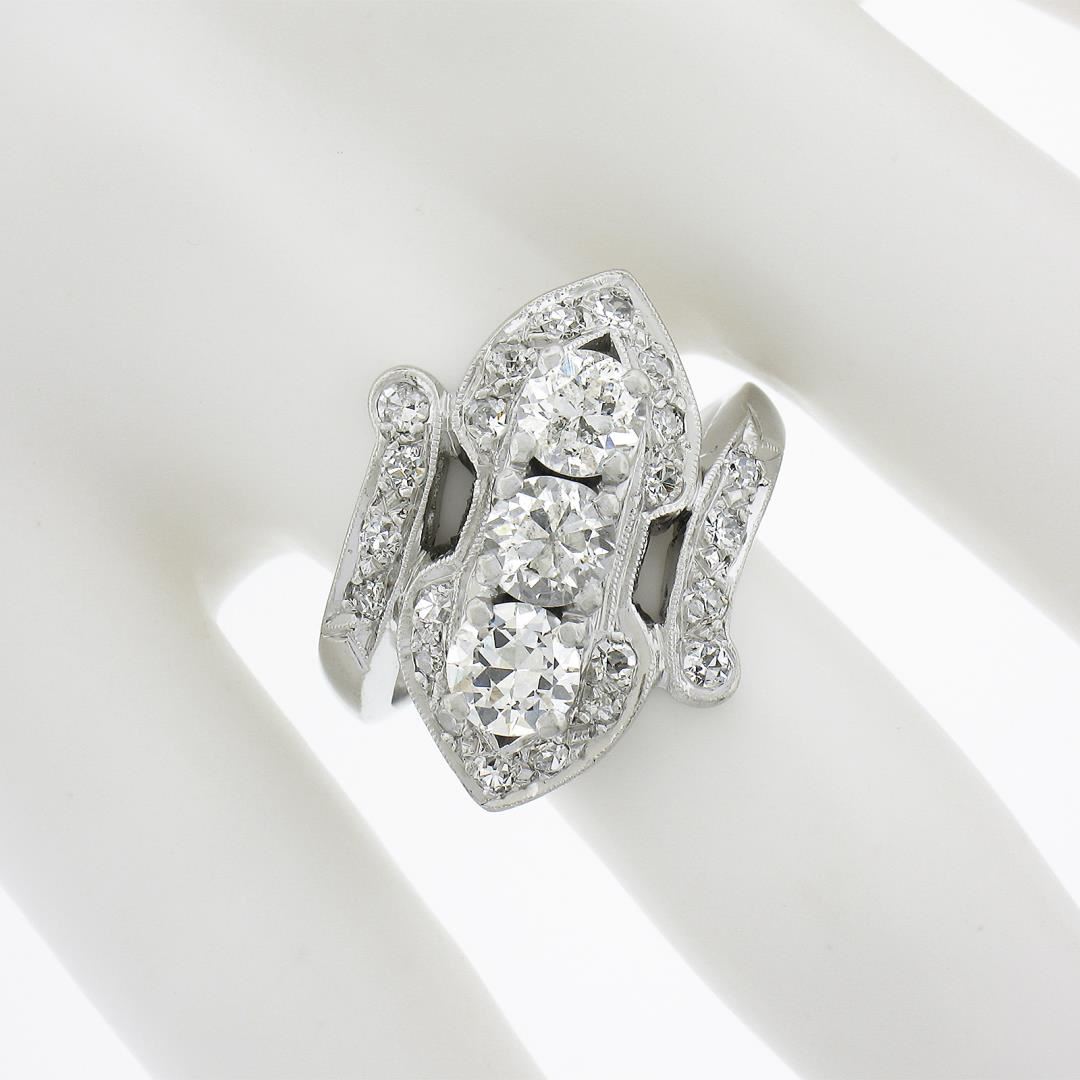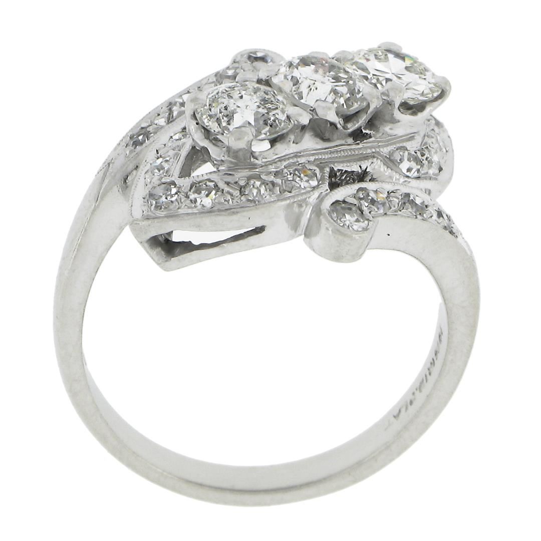 A vintage solid platinum bypass ring, with 3 old european cut natural diamonds (H-J - VS2-I1 ; 1.68ctw), and 22 old single cut natural diamonds (G/H - VS2-I1 ; 0.27ctw). The ring is size 9.0, weighs a total of 11.38 grams, and measures 18.7mm wide.