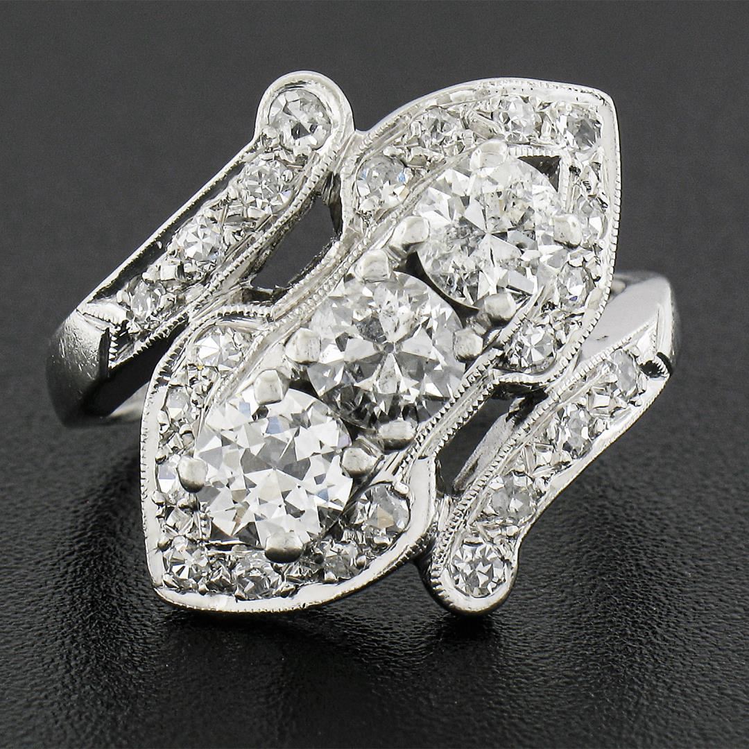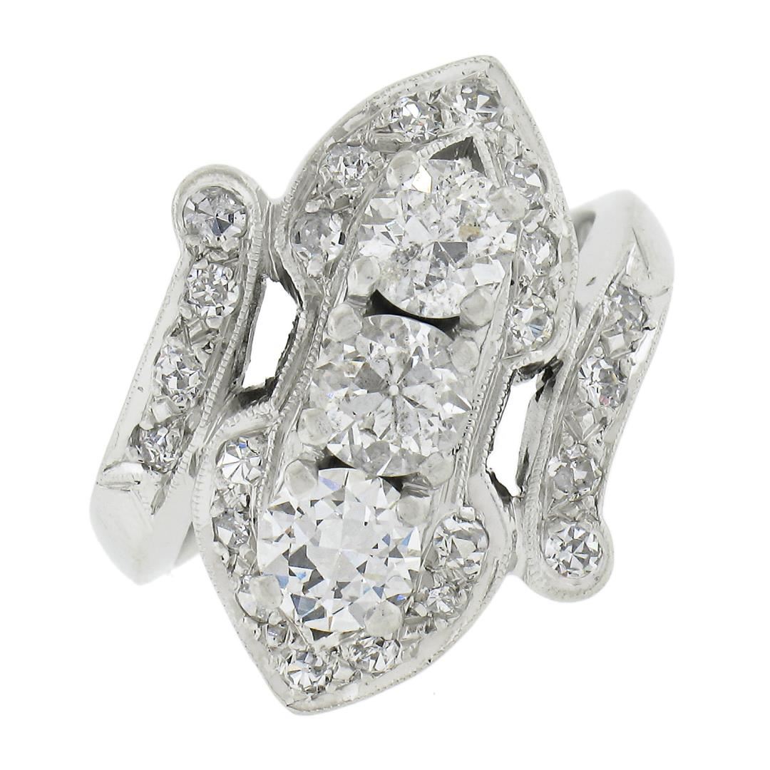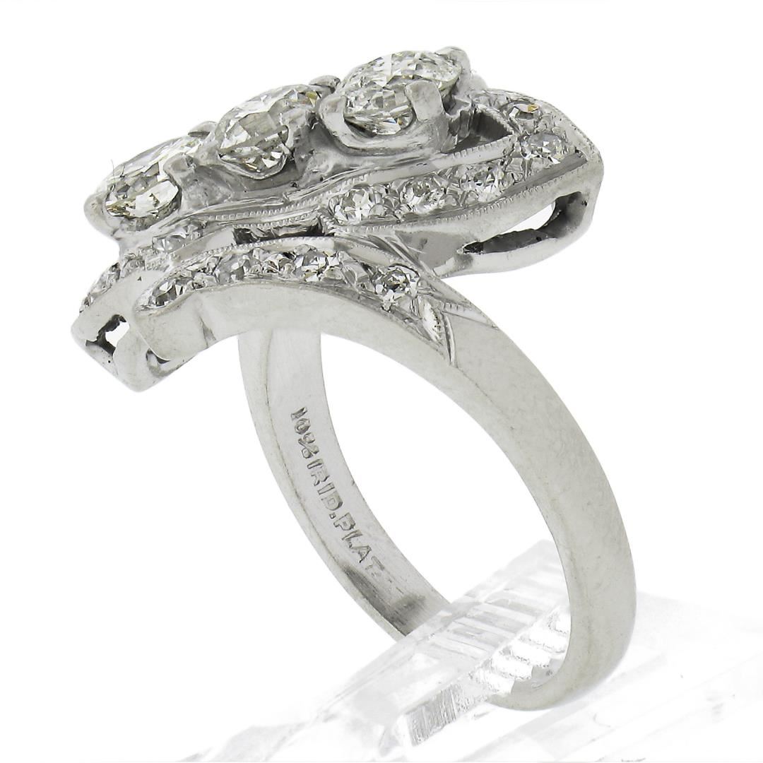 A vintage solid platinum bypass ring, with 3 old european cut natural diamonds (H-J - VS2-I1 ; 1.68ctw), and 22 old single cut natural diamonds (G/H - VS2-I1 ; 0.27ctw). The ring is size 9.0, weighs a total of 11.38 grams, and measures 18.7mm wide.
