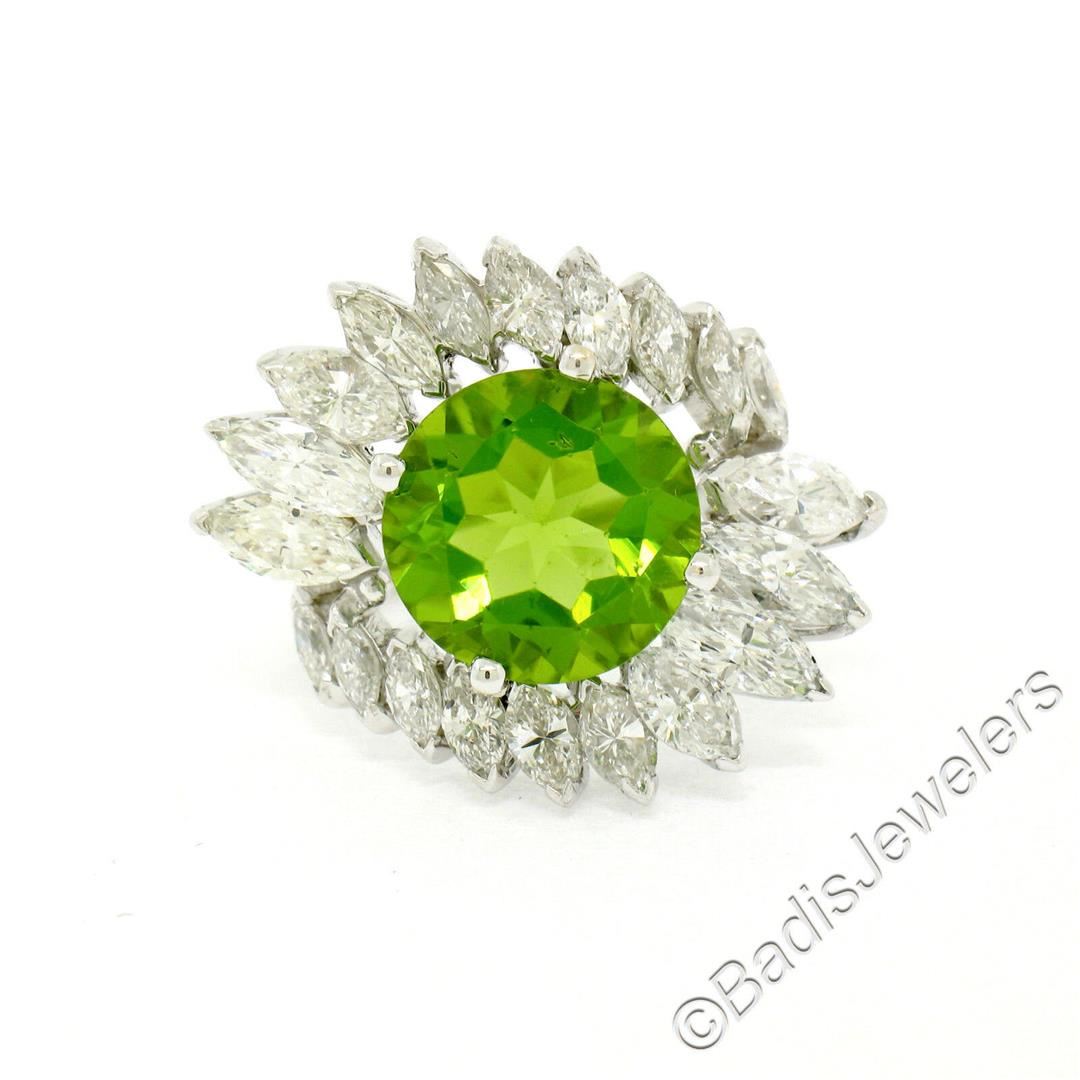 A like new vintage platinum ring with a round 6.70ct round peridot accented by 3.50ctw of marquise cut diamonds (F/G - VVS2/VS1). The ring is size 6.5, weighs a total of 12.57 grams, and the top measures approximately 24.35mm in diameter.