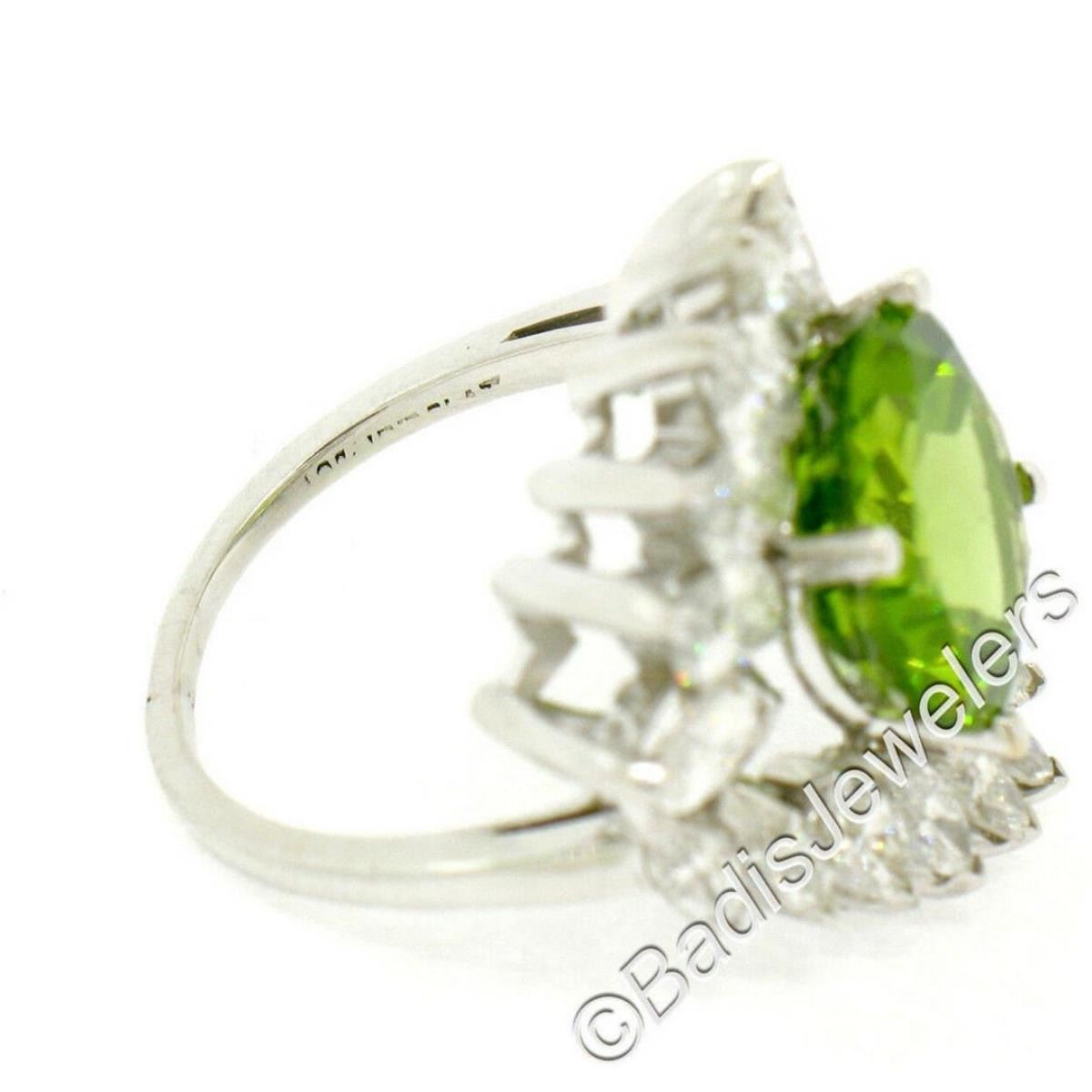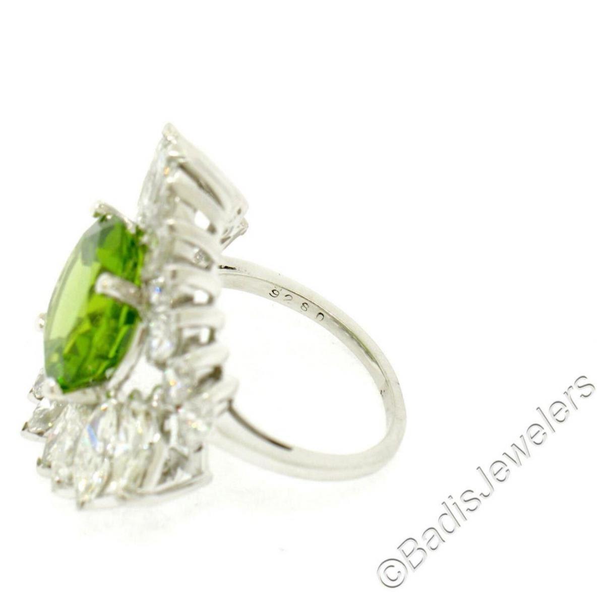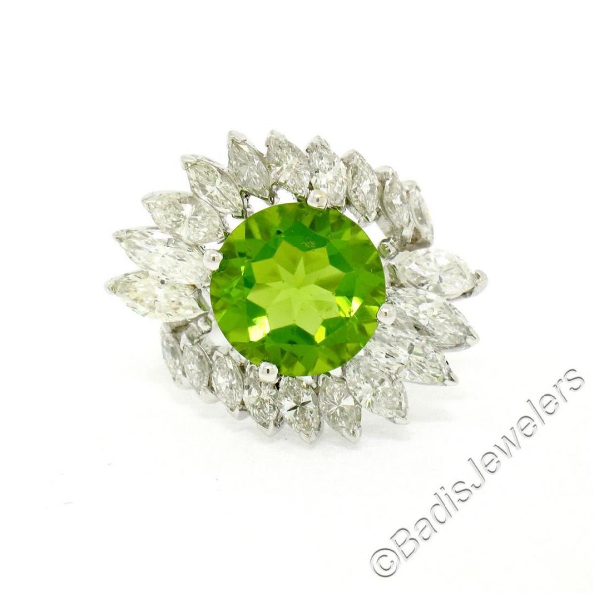 A like new vintage platinum ring with a round 6.70ct round peridot accented by 3.50ctw of marquise cut diamonds (F/G - VVS2/VS1). The ring is size 6.5, weighs a total of 12.57 grams, and the top measures approximately 24.35mm in diameter.