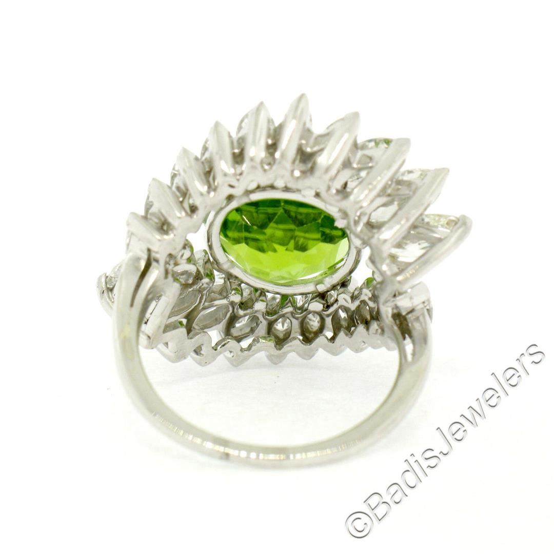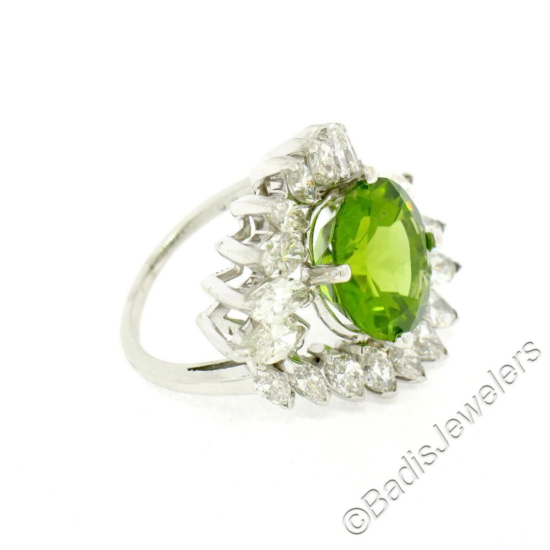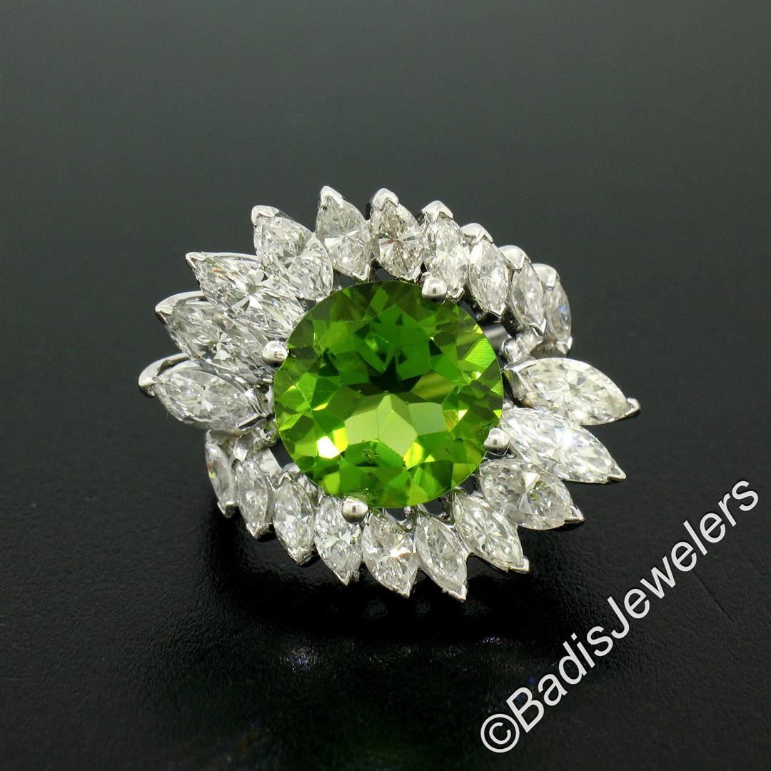 A like new vintage platinum ring with a round 6.70ct round peridot accented by 3.50ctw of marquise cut diamonds (F/G - VVS2/VS1). The ring is size 6.5, weighs a total of 12.57 grams, and the top measures approximately 24.35mm in diameter.