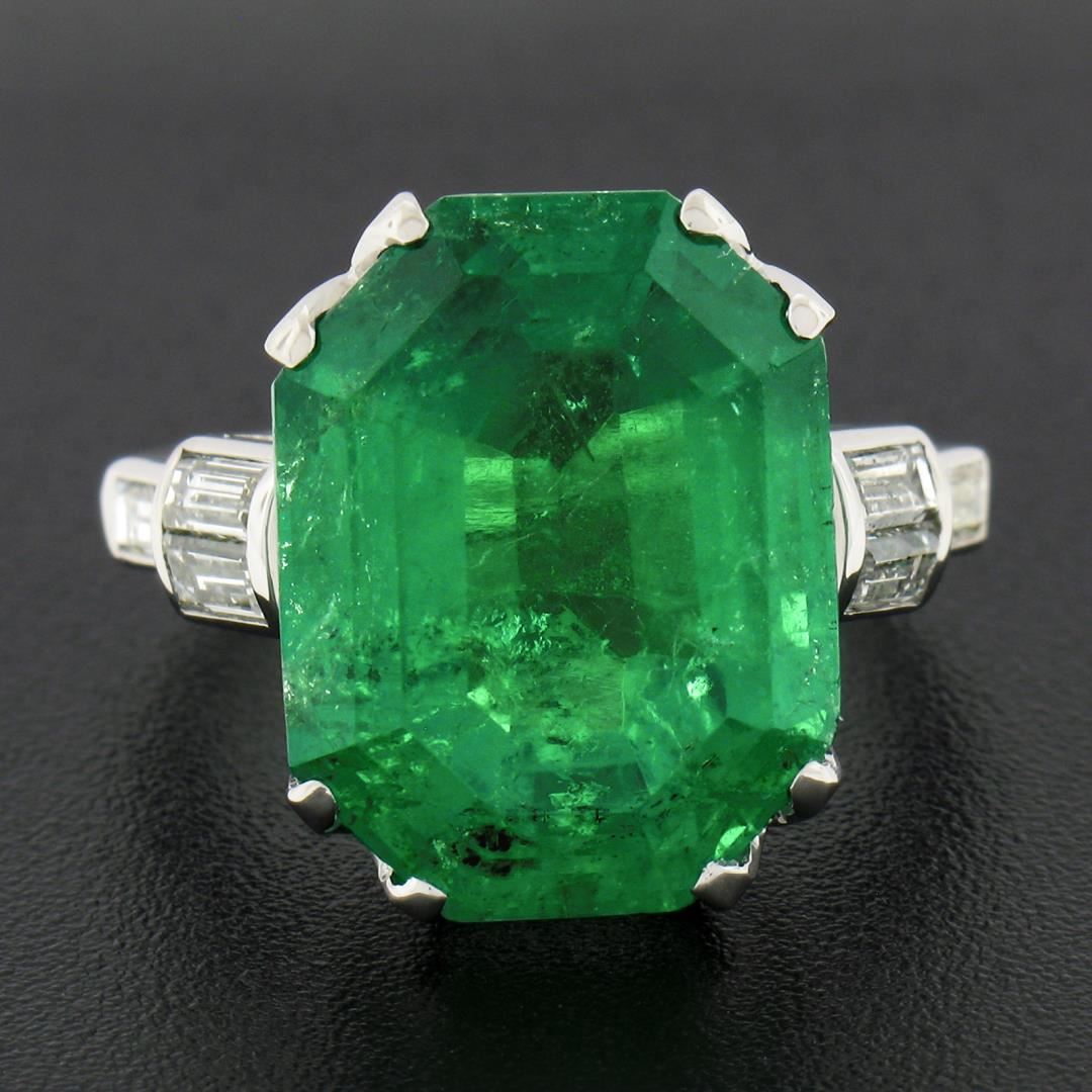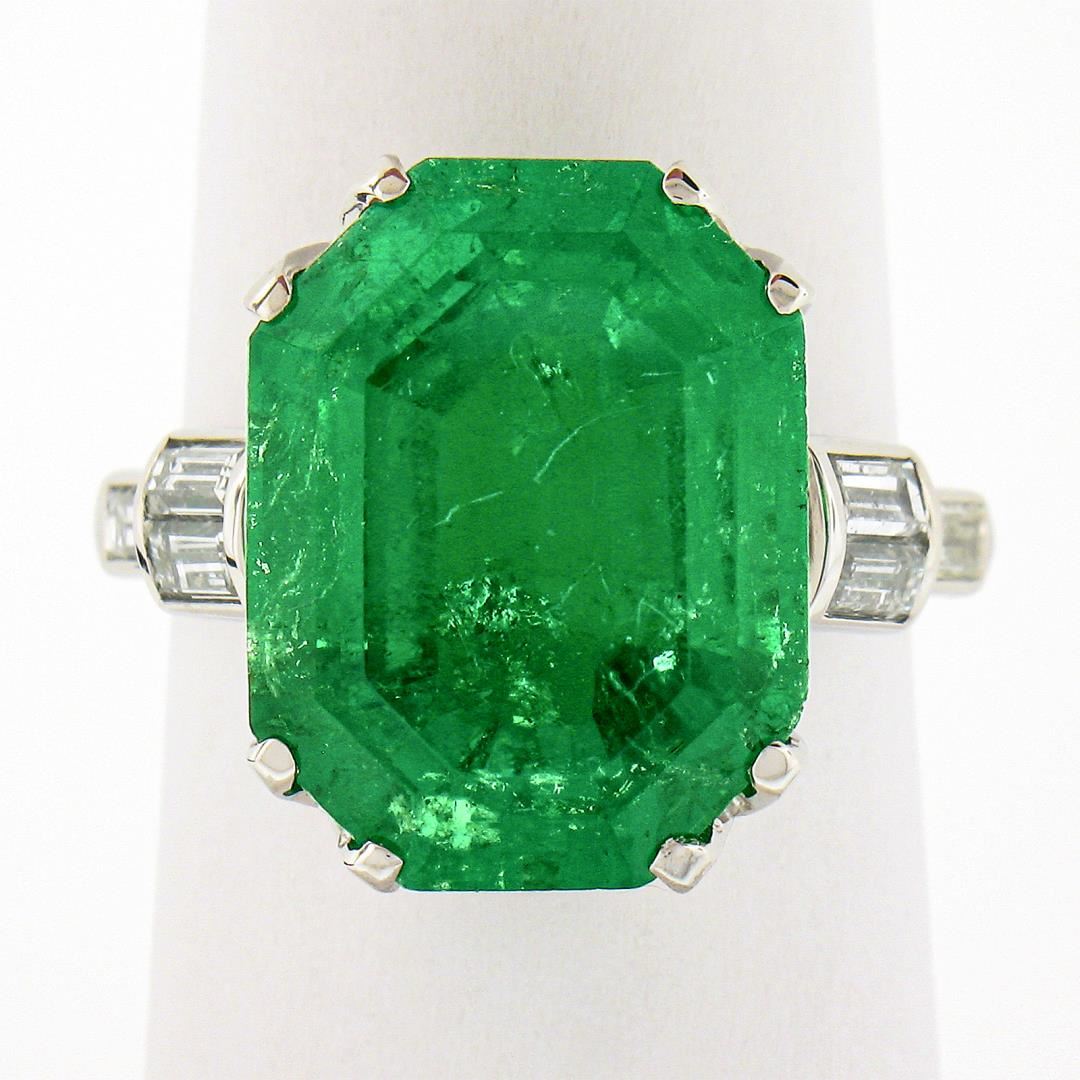 A vintage solid platinum ring, with 1 AGL graded emerald cut natural emerald (11.56ct), and 6 baguette cut natural diamonds (G/H - VS1-SI2 ; 0.60ctw). The ring is size 7.0, weighs a total of 9.40 grams, and measures 16.2mm wide. Comes with all original relevant certifications.