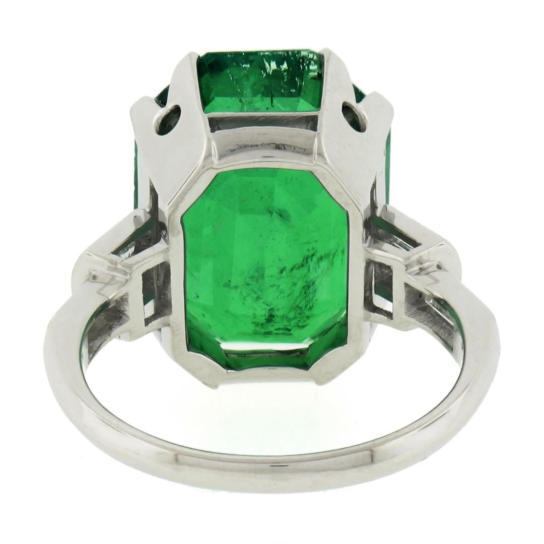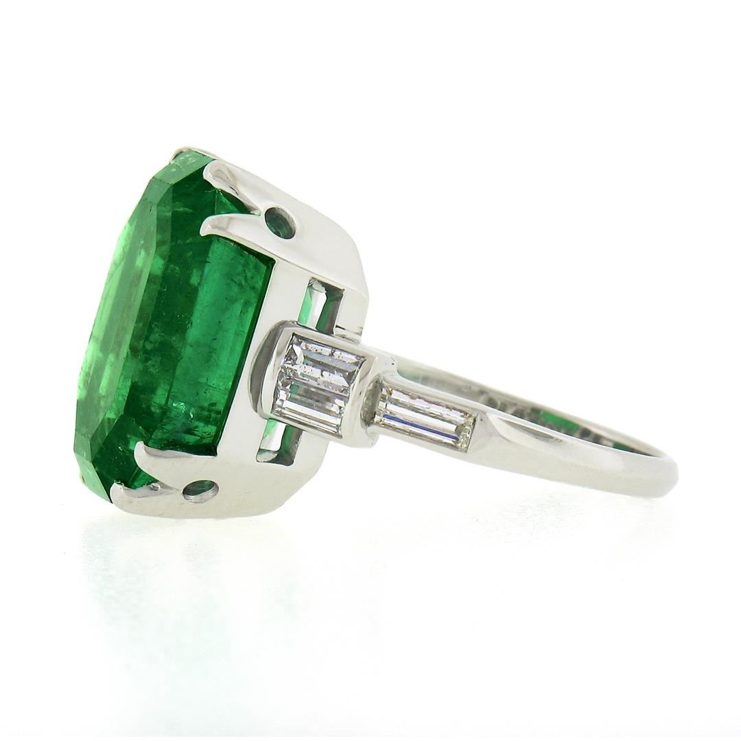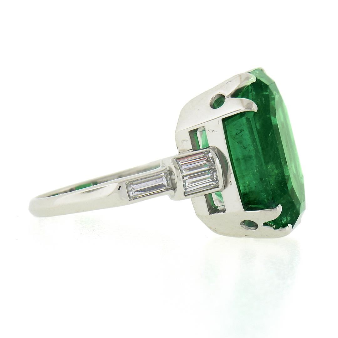 A vintage solid platinum ring, with 1 AGL graded emerald cut natural emerald (11.56ct), and 6 baguette cut natural diamonds (G/H - VS1-SI2 ; 0.60ctw). The ring is size 7.0, weighs a total of 9.40 grams, and measures 16.2mm wide. Comes with all original relevant certifications.