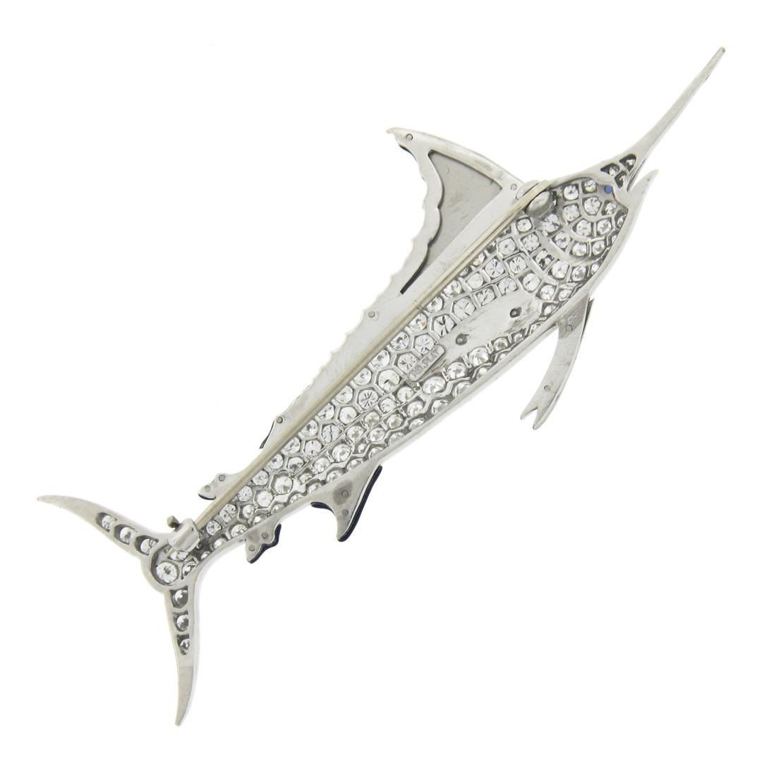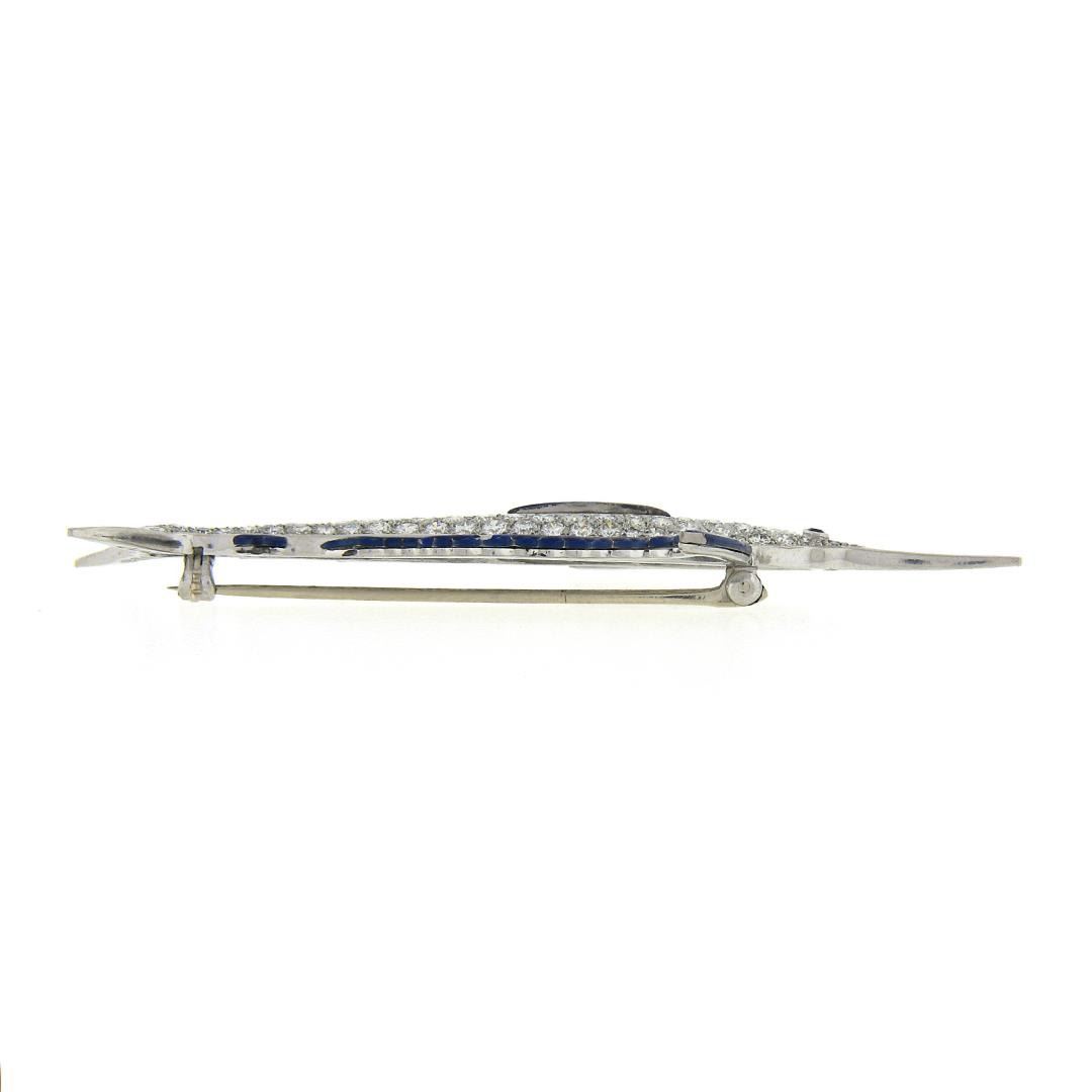 A vintage solid platinum & enamel work large brooch, with 119 round brilliant & single cut natural diamonds (E/F - VVS2/VS2 ; 3.50-4.0ctw), and 1 round brilliant cut natural sapphire (0.02ctw ). Measures 77.60x29.3mm and weighs a total of 13.01 grams.