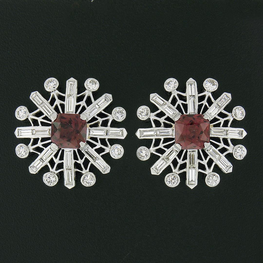 A vintage solid platinum pair of stud earrings, with 2 radiant cut natural garnets (2.0ctw), surrounded with 16 old transitional & 32 straight baguette cut natural diamonds (G/H - VS1/VS2 ; 2.02ctw). The earrings measure approximately 20.0mm in diameter and weigh a total of 10.24 grams.