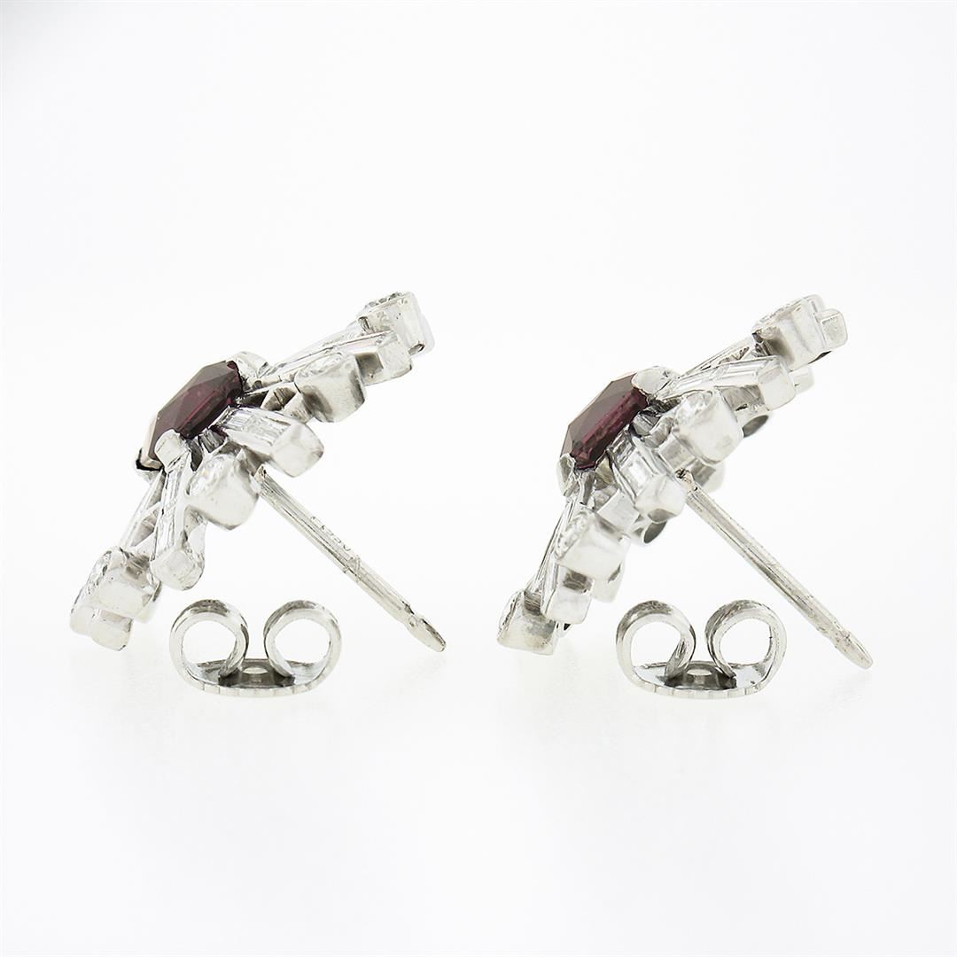 A vintage solid platinum pair of stud earrings, with 2 radiant cut natural garnets (2.0ctw), surrounded with 16 old transitional & 32 straight baguette cut natural diamonds (G/H - VS1/VS2 ; 2.02ctw). The earrings measure approximately 20.0mm in diameter and weigh a total of 10.24 grams.
