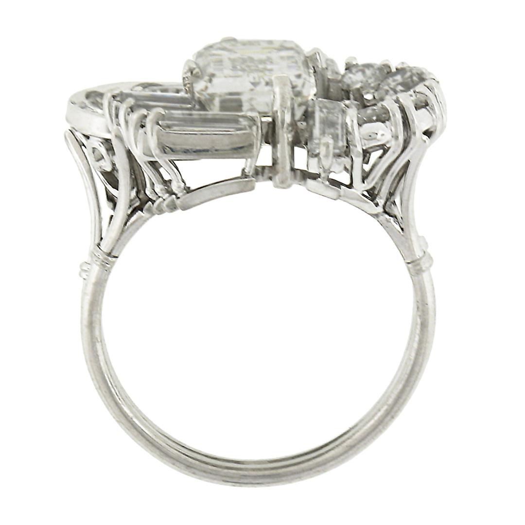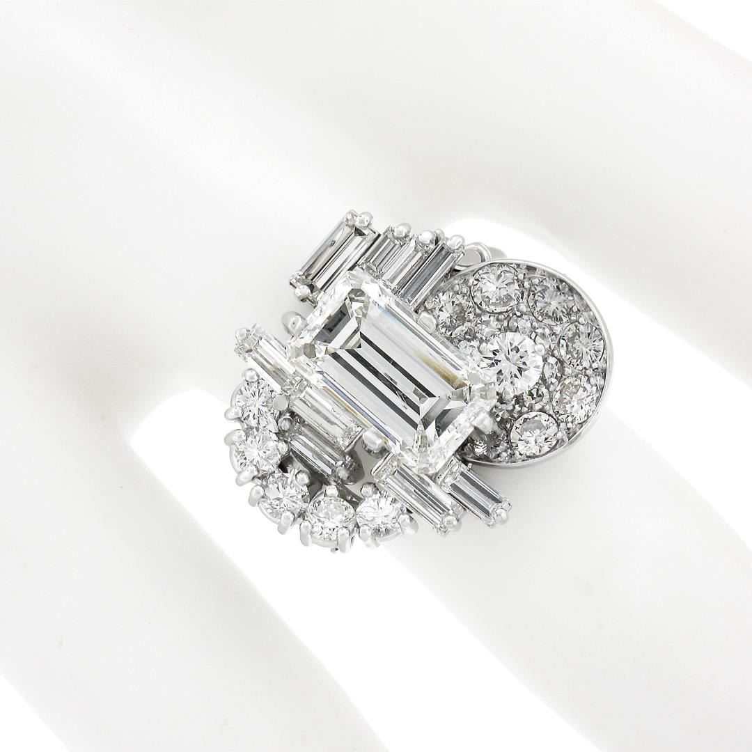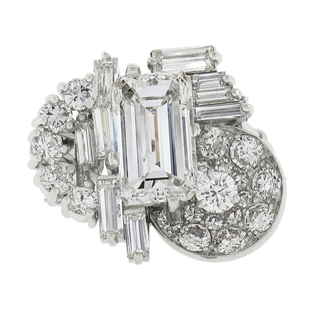 A vintage solid platinum cocktail ring, with 1 GIA graded emerald cut natural diamond (H - SI2 ; 3.00ct ), and 9 baguette cut, 21 round & single cut natural diamonds (G/H - VVS2/VS1 ; 2.10ctw). The ring is size 5.5, weighs a total of 9.08 grams, and measures 17.5mm wide. Comes with all original relevant certifications.