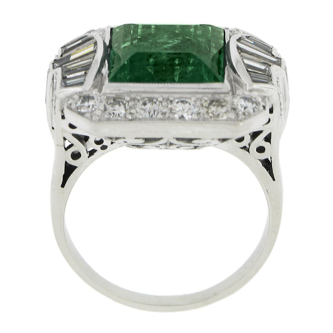 A vintage platinum ring, with AGL graded square cut natural ermerald ( 4ct ), 12 round cut natural diamonds ( G/H - VS1/VS2 ; 0.48ctw), 8 single cut natural diamonds (G/H - VS1/VS2 ; 0.12ctw), and 12 baguette cut natural diamonds (G/H - VS1/VS2 ; 0.60ctw ). The ring is size 6.0, weighs a total of 9.4 grams, and measures 17mm wide. Comes with all original relevant certifications.
