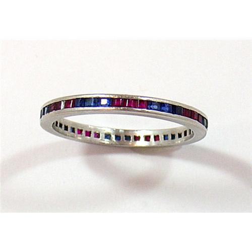 Platinum band with alternating 3 square cut rubies and 3 square cut sapphires. Size 6.75 and 2mm wide.