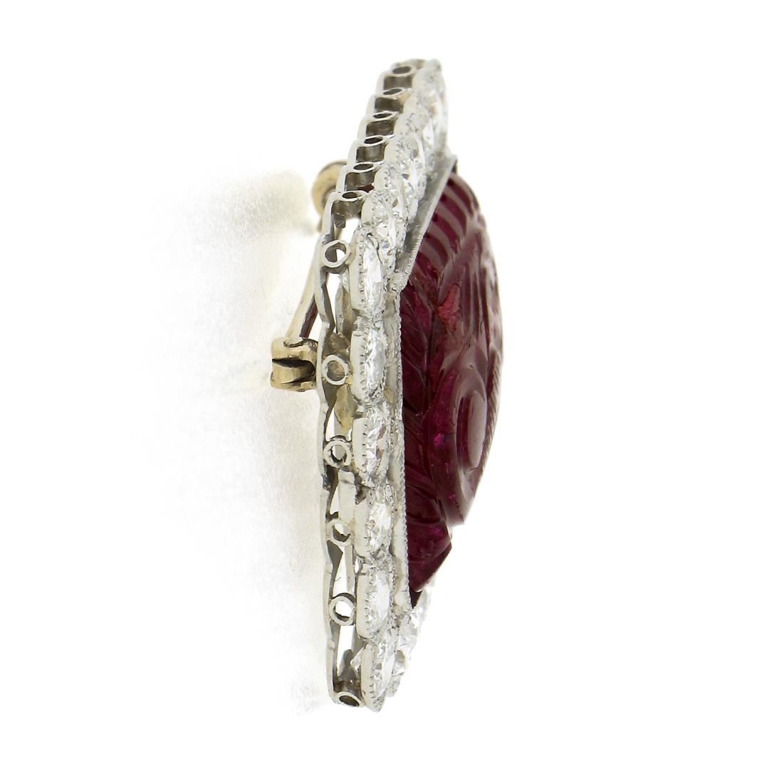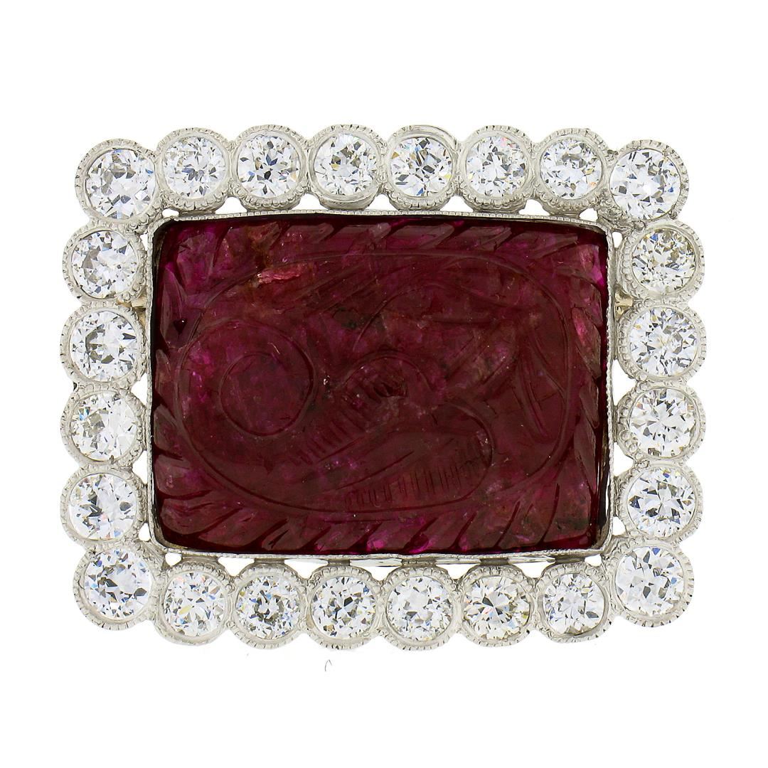 A vintage solid platinum brooch, with 1 carved rectangular cut natrual ruby (21x16mm), and 24 old european cut natural diamonds (G/H - VS1/VS2 few SI1 ; 2.88 ctw). Measures 24.7x30.6mm and weighs a total of 11.90 grams.