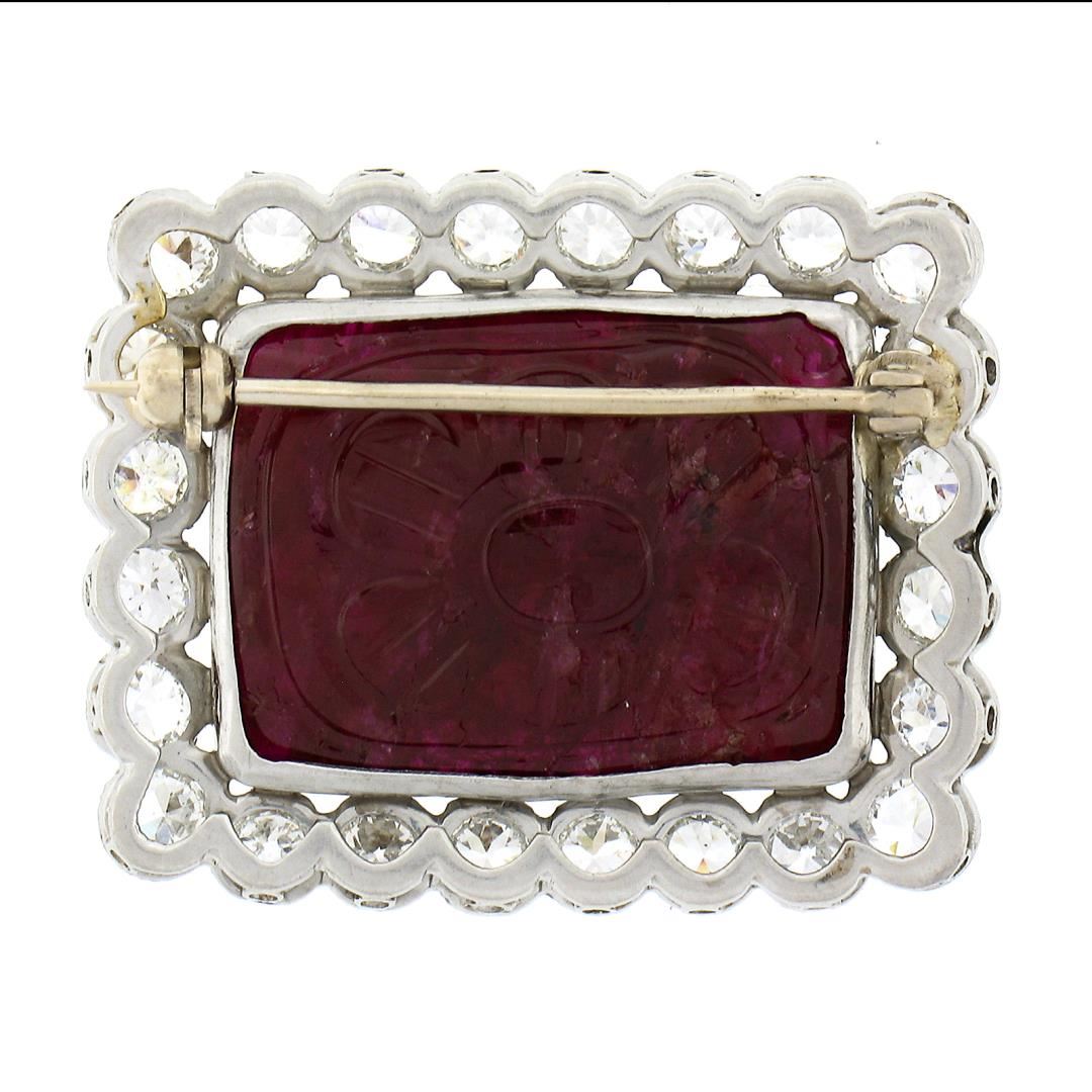 A vintage solid platinum brooch, with 1 carved rectangular cut natrual ruby (21x16mm), and 24 old european cut natural diamonds (G/H  - VS1/VS2 few SI1 ; 2.88 ctw). Measures 24.7x30.6mm and weighs a total of 11.90 grams.