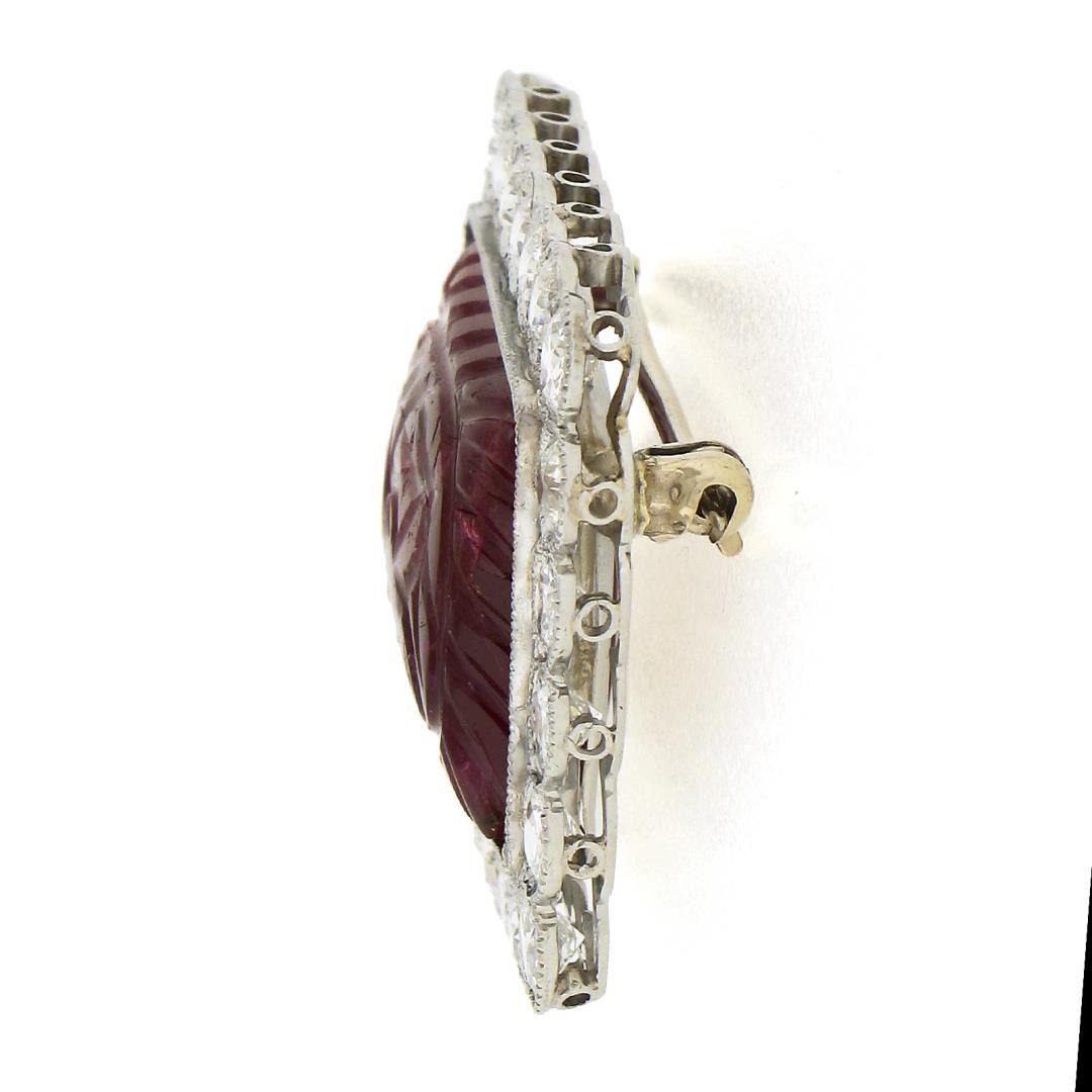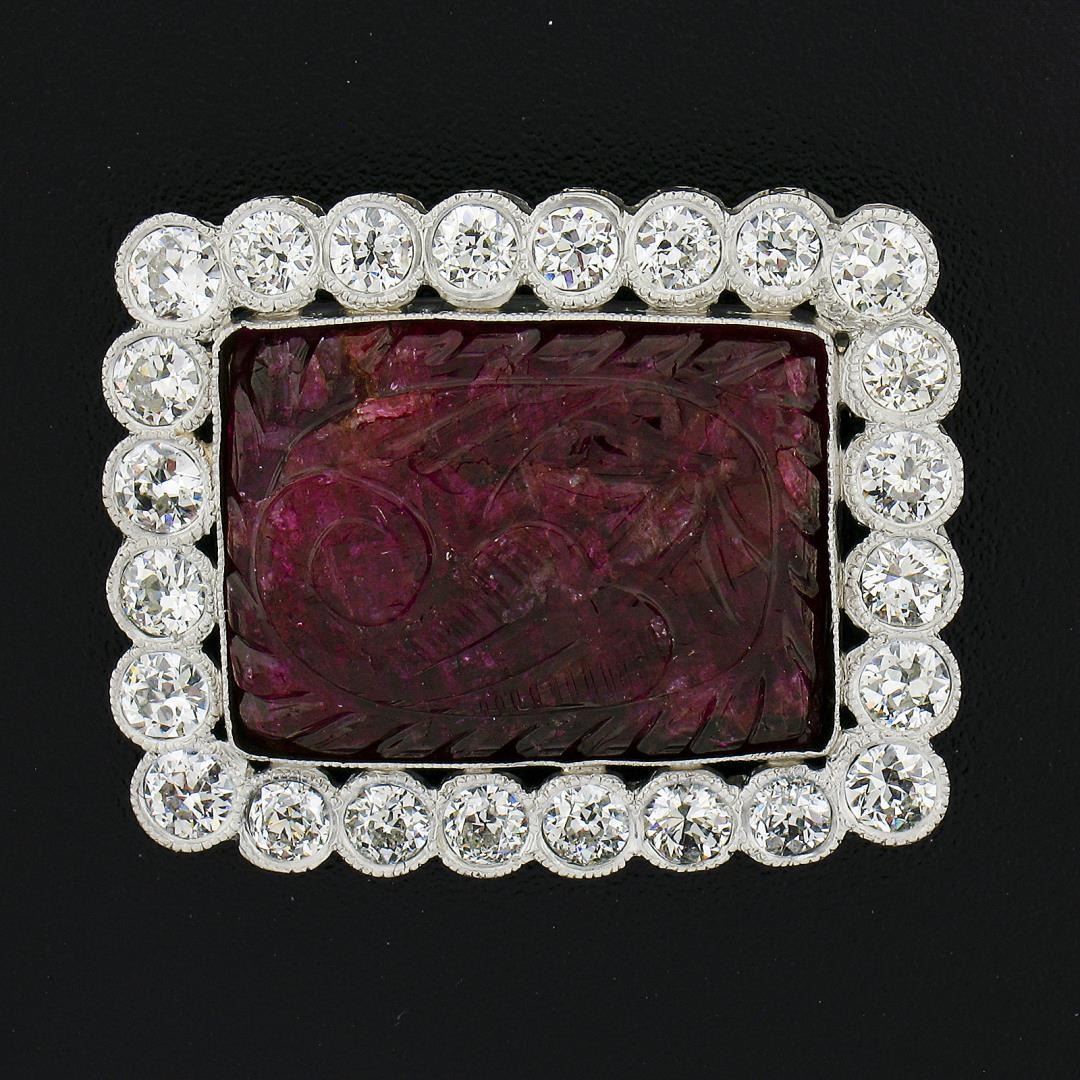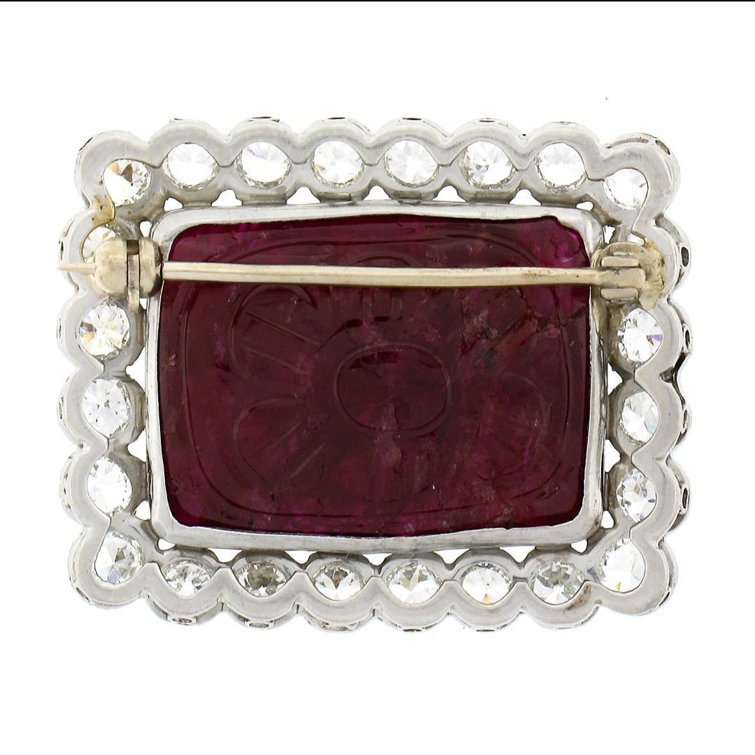 A vintage solid platinum brooch, with 1 carved rectangular cut natrual ruby (21x16mm), and 24 old european cut natural diamonds (G/H - VS1/VS2 few SI1 ; 2.88 ctw). Measures 24.7x30.6mm and weighs a total of 11.90 grams.