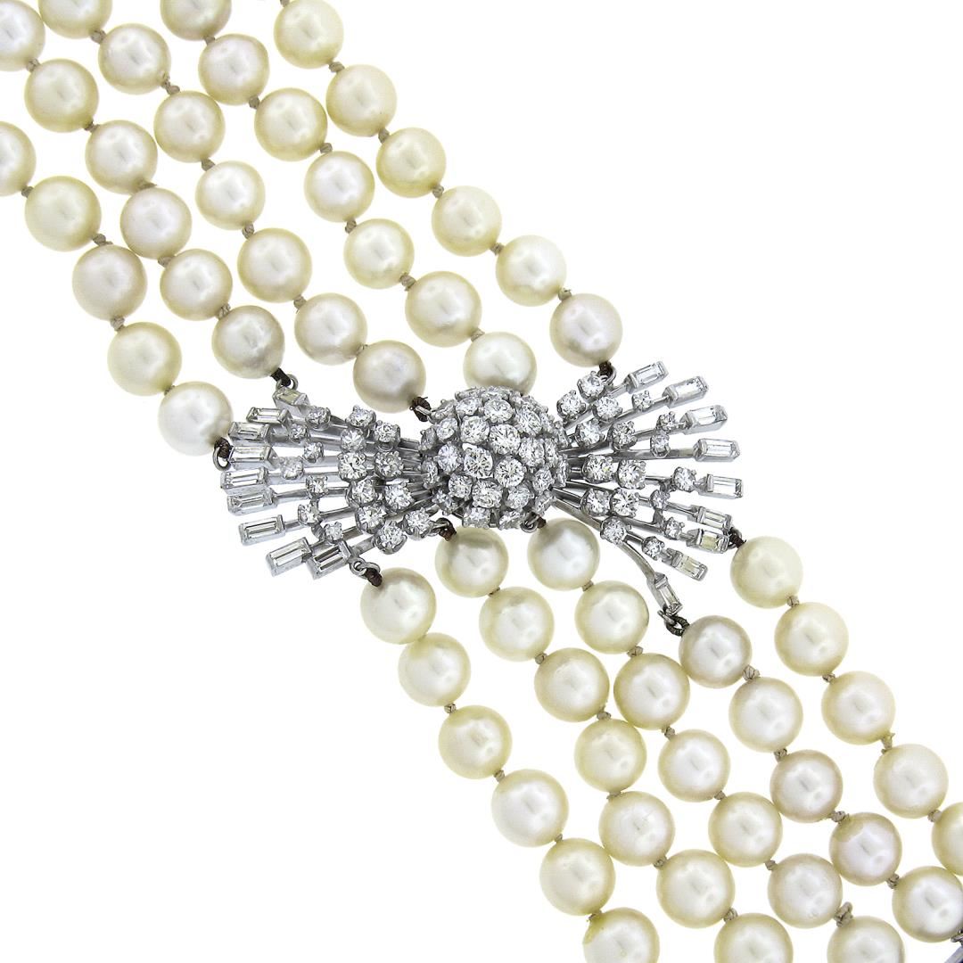 A vintage 5 strand bracelet with platinum & white gold clasp, featuring 74 round shape cultured pearls (8 to 8.5mm each ), and numerous baguette, old single & round cut natural diamonds (G-I - VS1-SI1 ; 7ctw). It weighs a total of 95.06 grams, measures 56.2mm wide, and measures 6.0 inches in length.