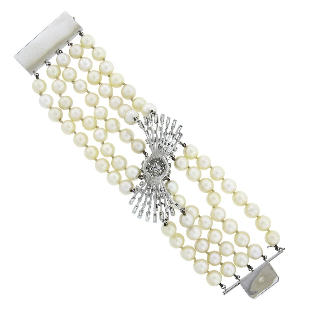 A vintage 5 strand bracelet with platinum & white gold clasp, featuring 74 round shape cultured pearls (8 to 8.5mm each ), and numerous baguette, old single & round cut natural diamonds (G-I - VS1-SI1 ; 7ctw). It weighs a total of 95.06 grams, measures 56.2mm wide, and measures 6.0 inches in length.