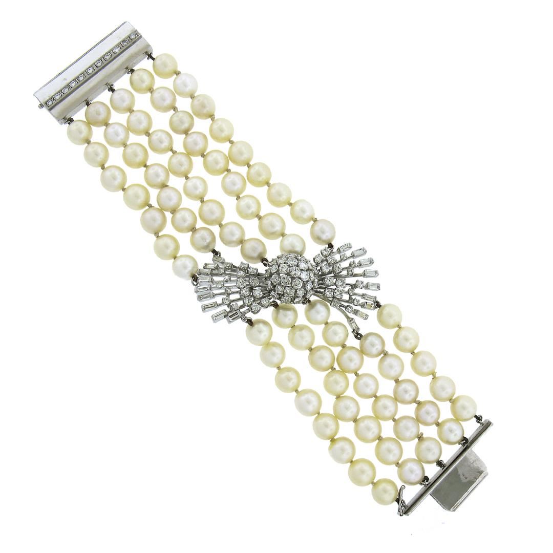 A vintage 5 strand bracelet with platinum & white gold clasp, featuring 74 round shape cultured pearls (8 to 8.5mm each ), and numerous baguette, old single & round cut natural diamonds (G-I - VS1-SI1 ; 7ctw). It weighs a total of 95.06 grams, measures 56.2mm wide, and measures 6.0 inches in length.