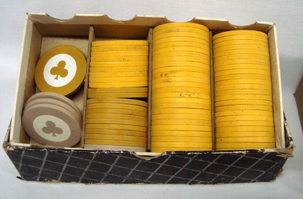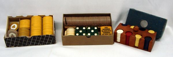 Vintage Poker Chips and Backgammon Dice Pieces. Three boxes of chips and large dice are ready for the lucky player. Backgammon pieces were won at a tournament in 1978 and have extra large dice. Largest box 7'' x 3.75''.