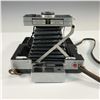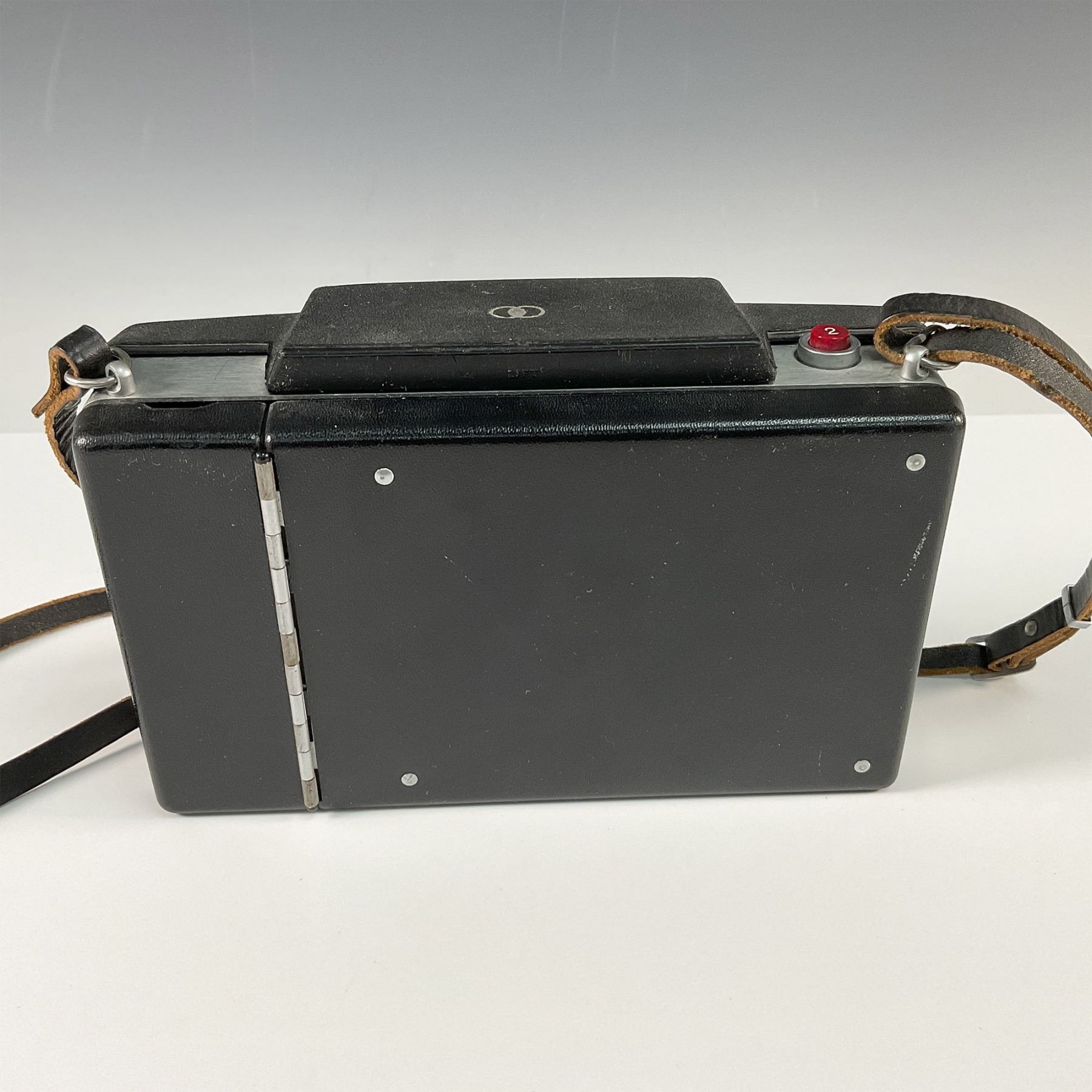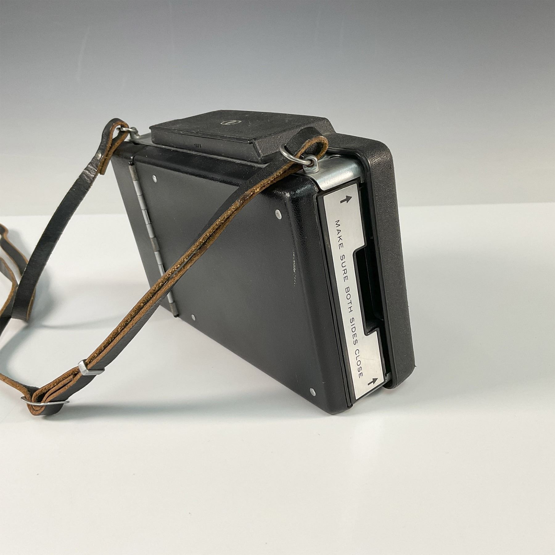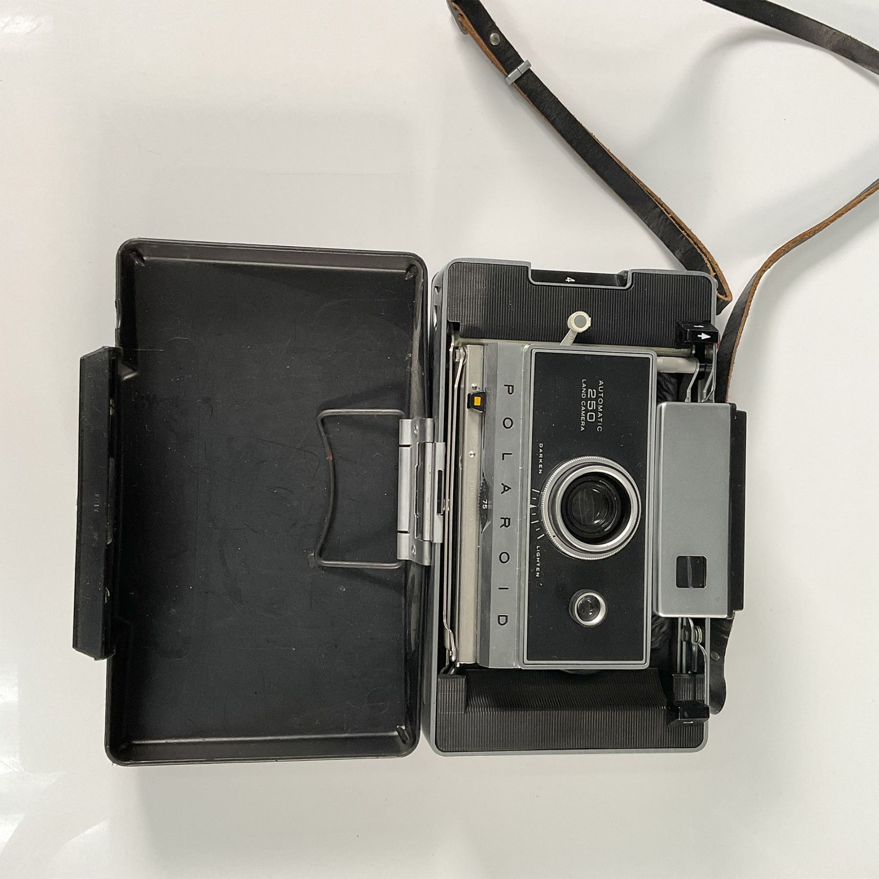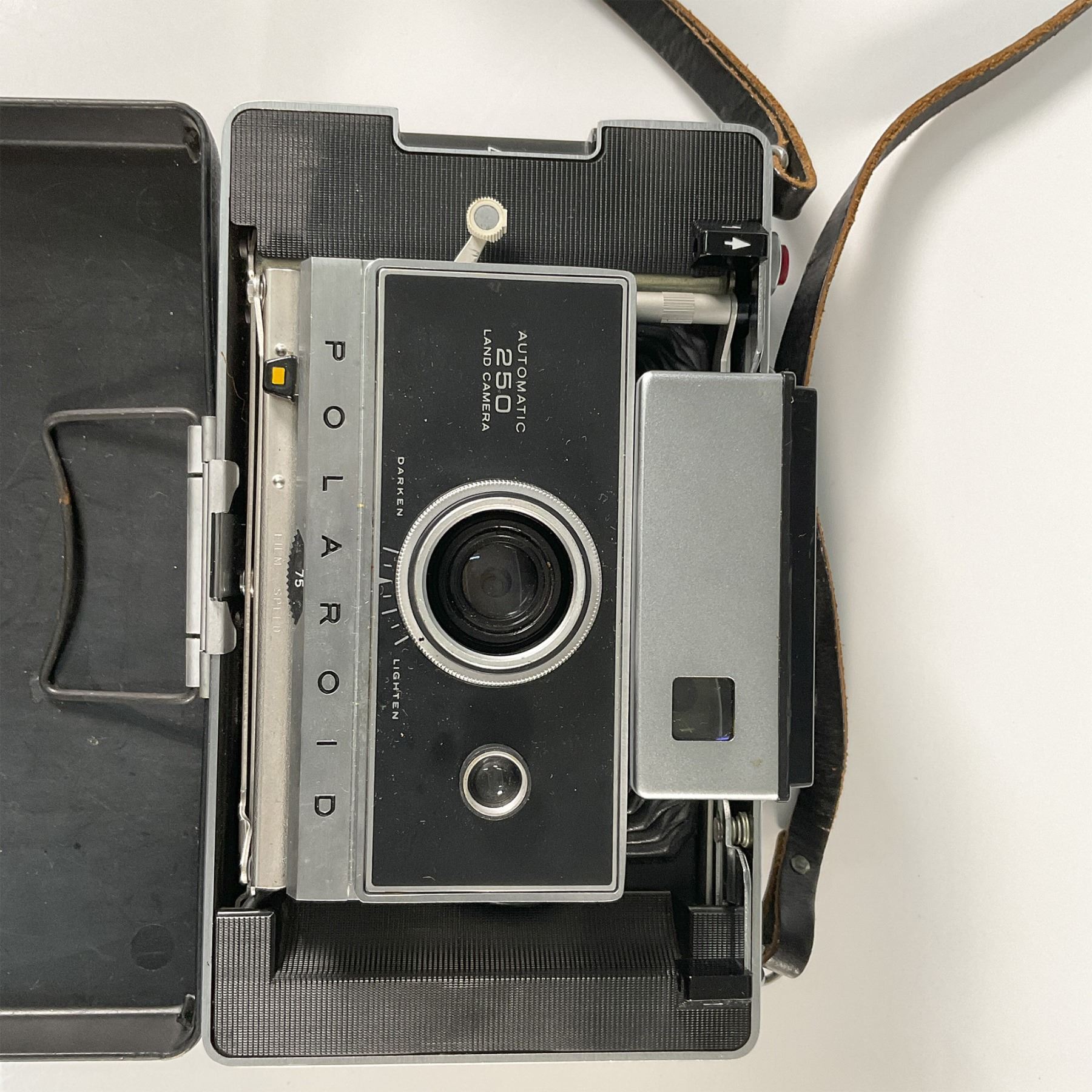This vintage Polaroid 250 Land Camera, measuring 7.75"L x 4.75"H, is a classic instant camera from the 1960s. The camera and its protective case are intricately intertwined, forming a single, functional unit. The Polaroid 250 was designed for use with Polaroid’s Type 100 film, allowing users to instantly view their photos as they developed. The camera features a folding design, adjustable exposure settings such as the "darken" and "lighten" controls, and a built-in flash. Its bellows design enables the lens to extend and retract for focusing. The camera's sturdy metal construction and clean, retro aesthetic make it a sought-after piece for collectors and photography enthusiasts. Some signs of wear are present, but it remains in good condition, with the leather strap and lens in clean, working order. This unique item makes an excellent addition to any vintage photography collection.