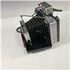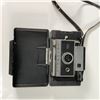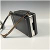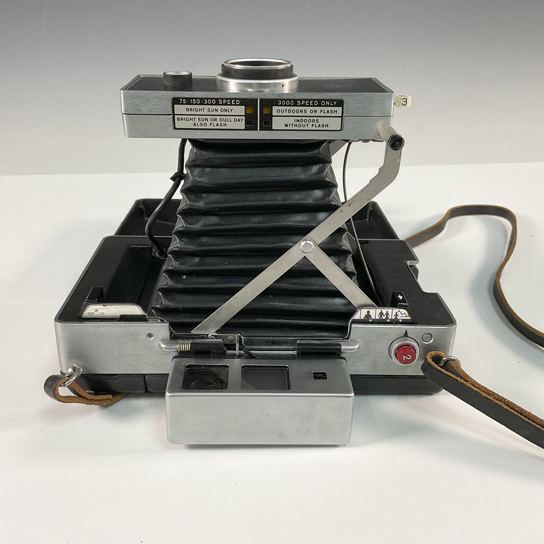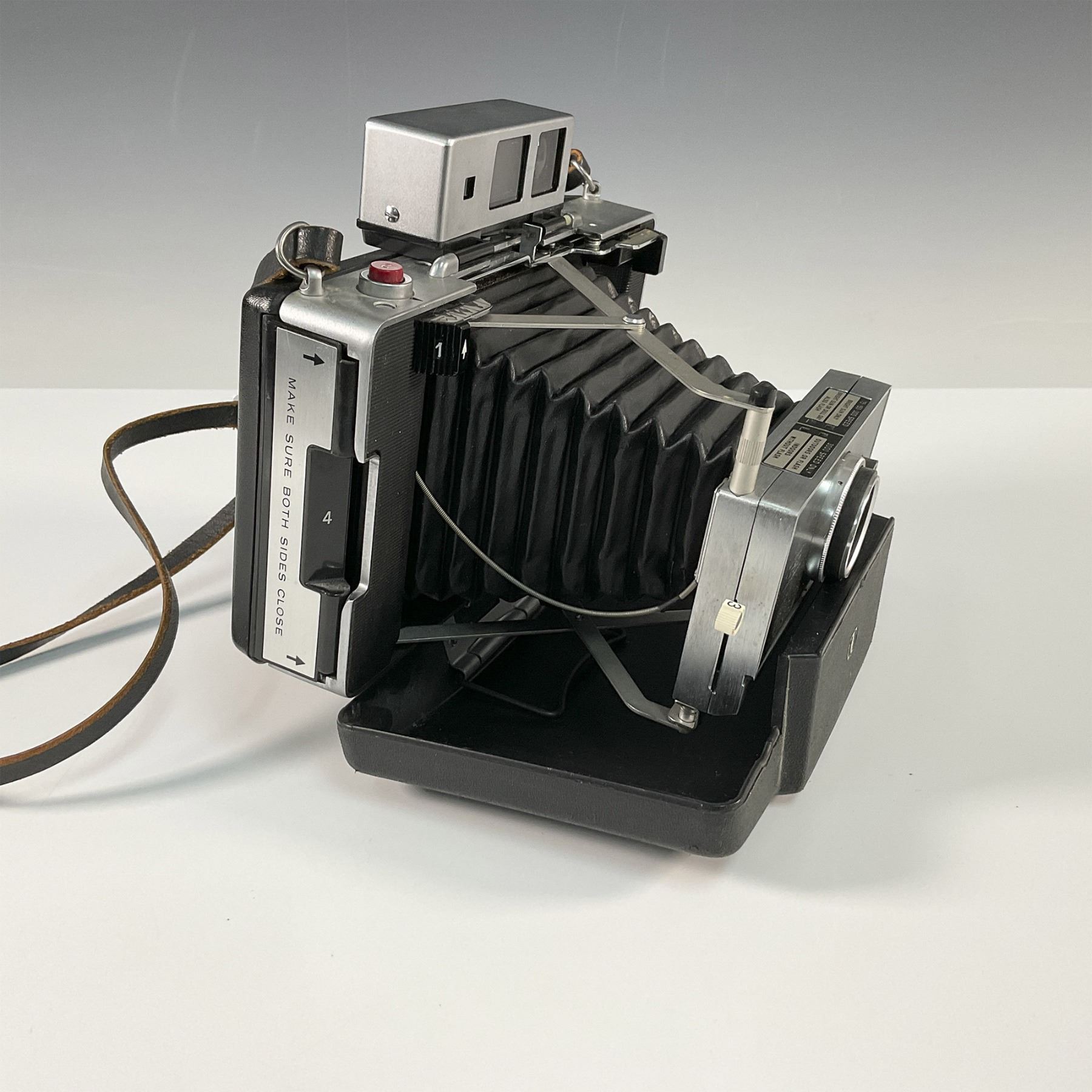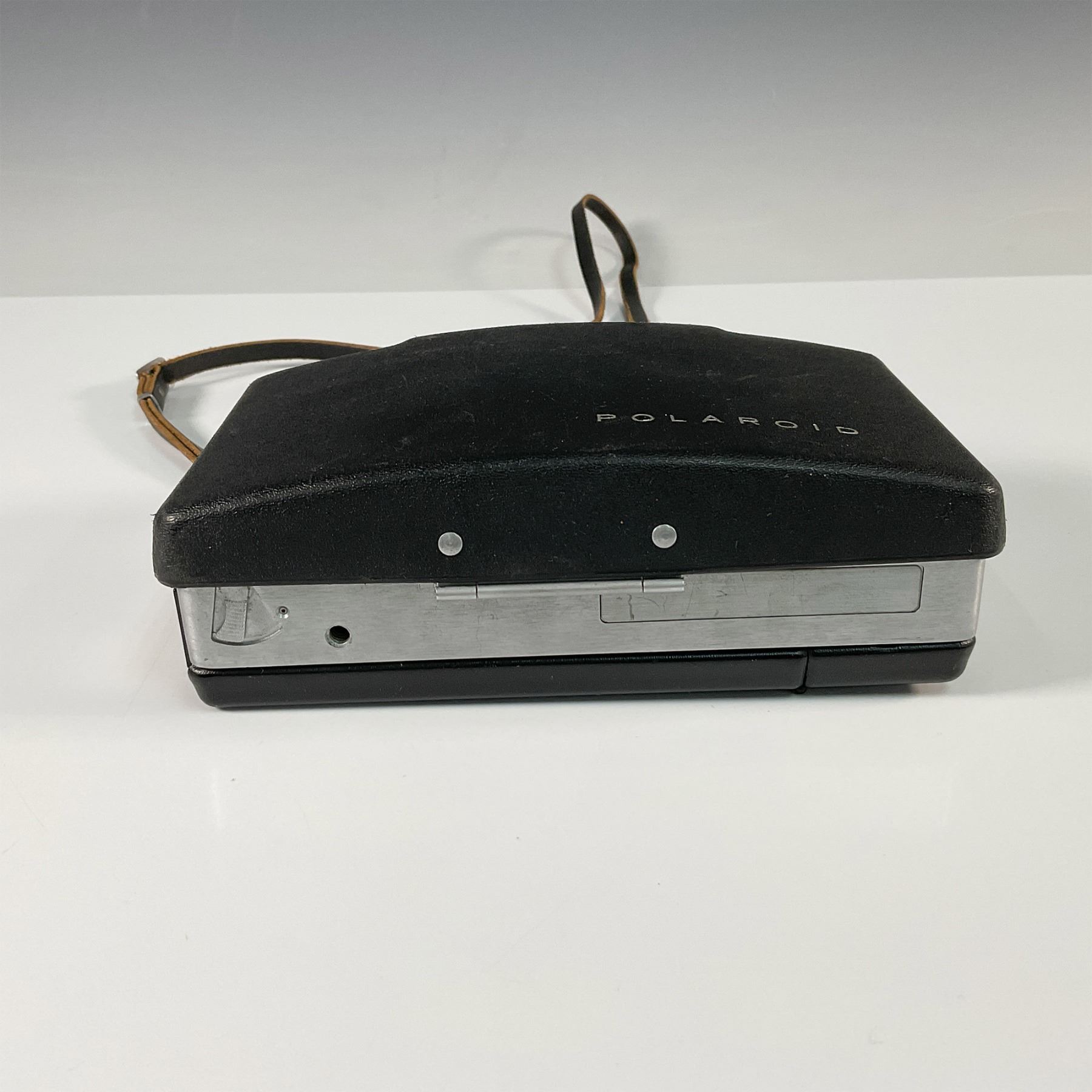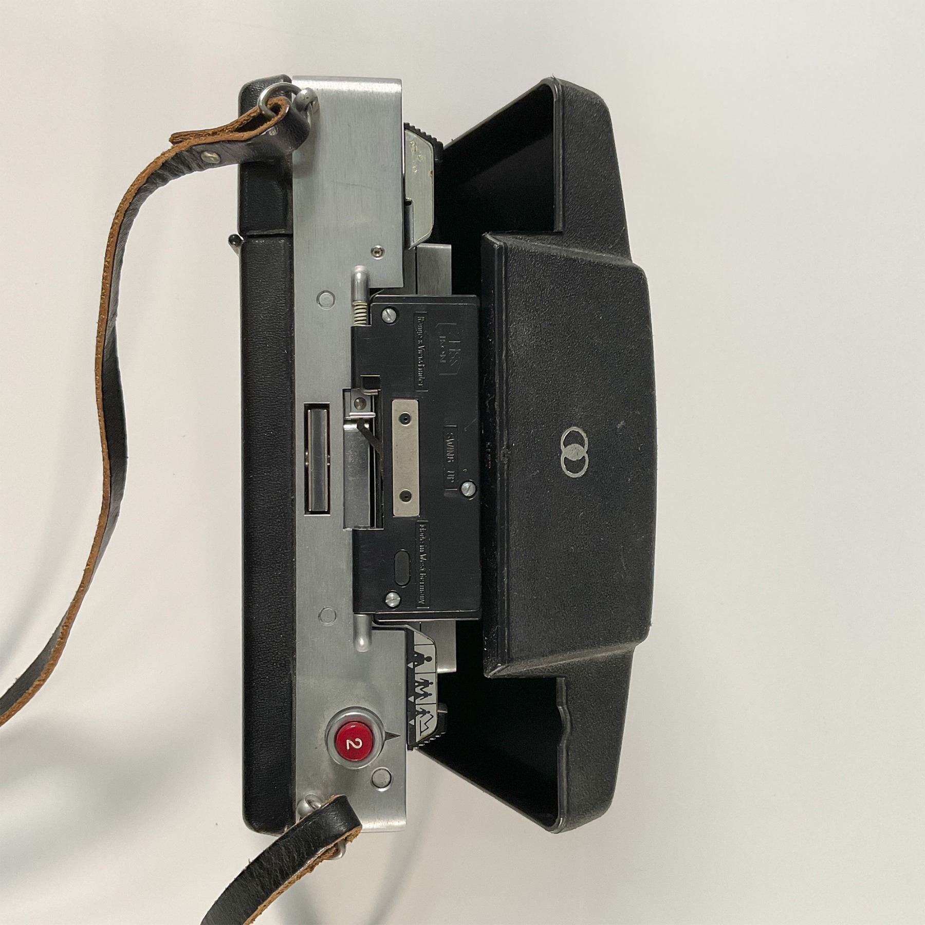 This vintage Polaroid 250 Land Camera, measuring 7.75"L x 4.75"H, is a classic instant camera from the 1960s. The camera and its protective case are intricately intertwined, forming a single, functional unit. The Polaroid 250 was designed for use with Polaroid’s Type 100 film, allowing users to instantly view their photos as they developed. The camera features a folding design, adjustable exposure settings such as the "darken" and "lighten" controls, and a built-in flash. Its bellows design enables the lens to extend and retract for focusing. The camera's sturdy metal construction and clean, retro aesthetic make it a sought-after piece for collectors and photography enthusiasts. Some signs of wear are present, but it remains in good condition, with the leather strap and lens in clean, working order. This unique item makes an excellent addition to any vintage photography collection.