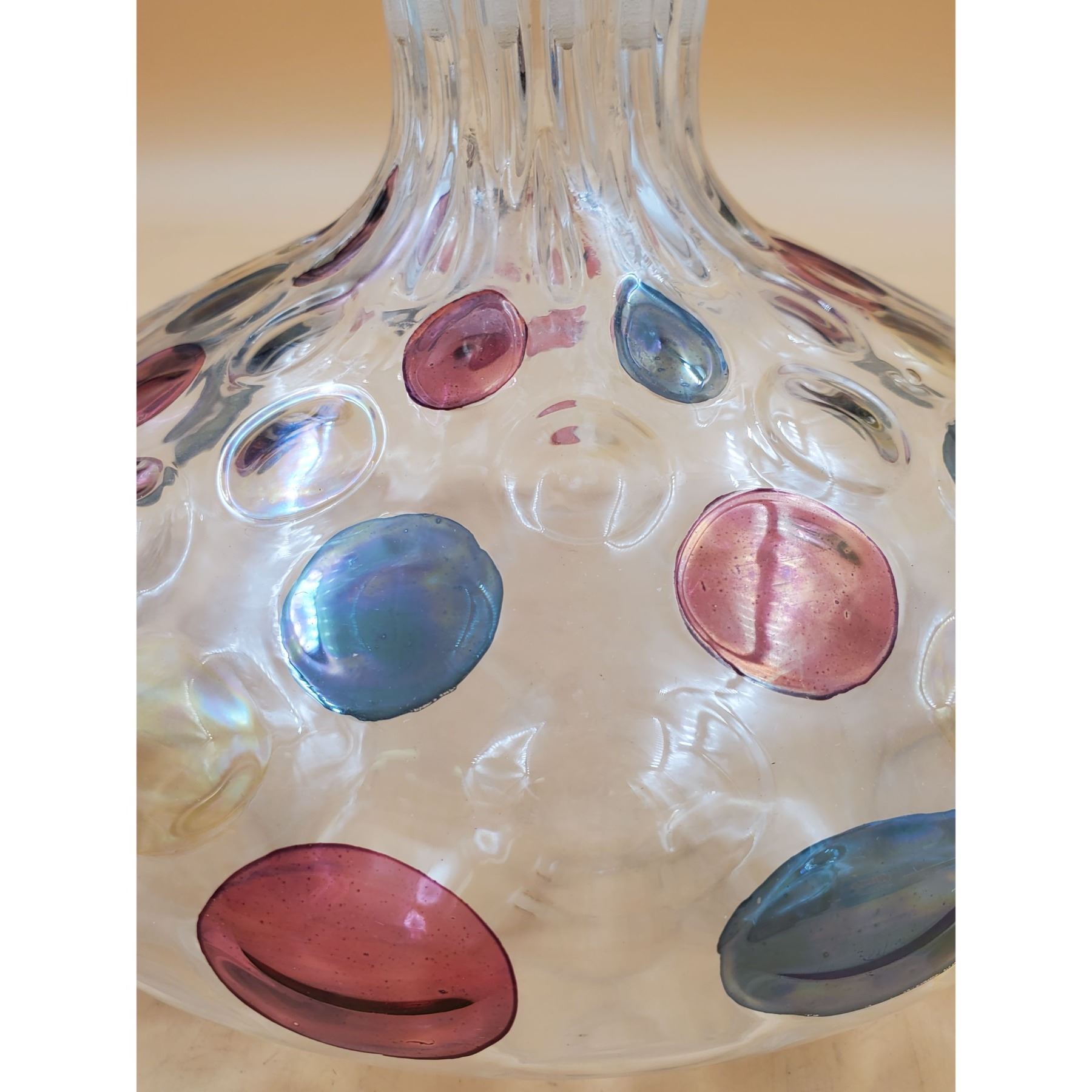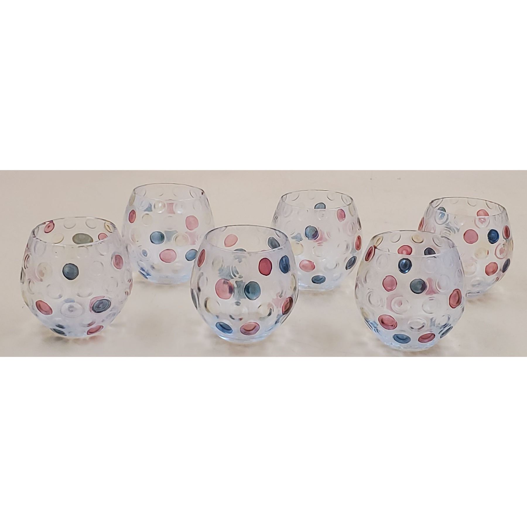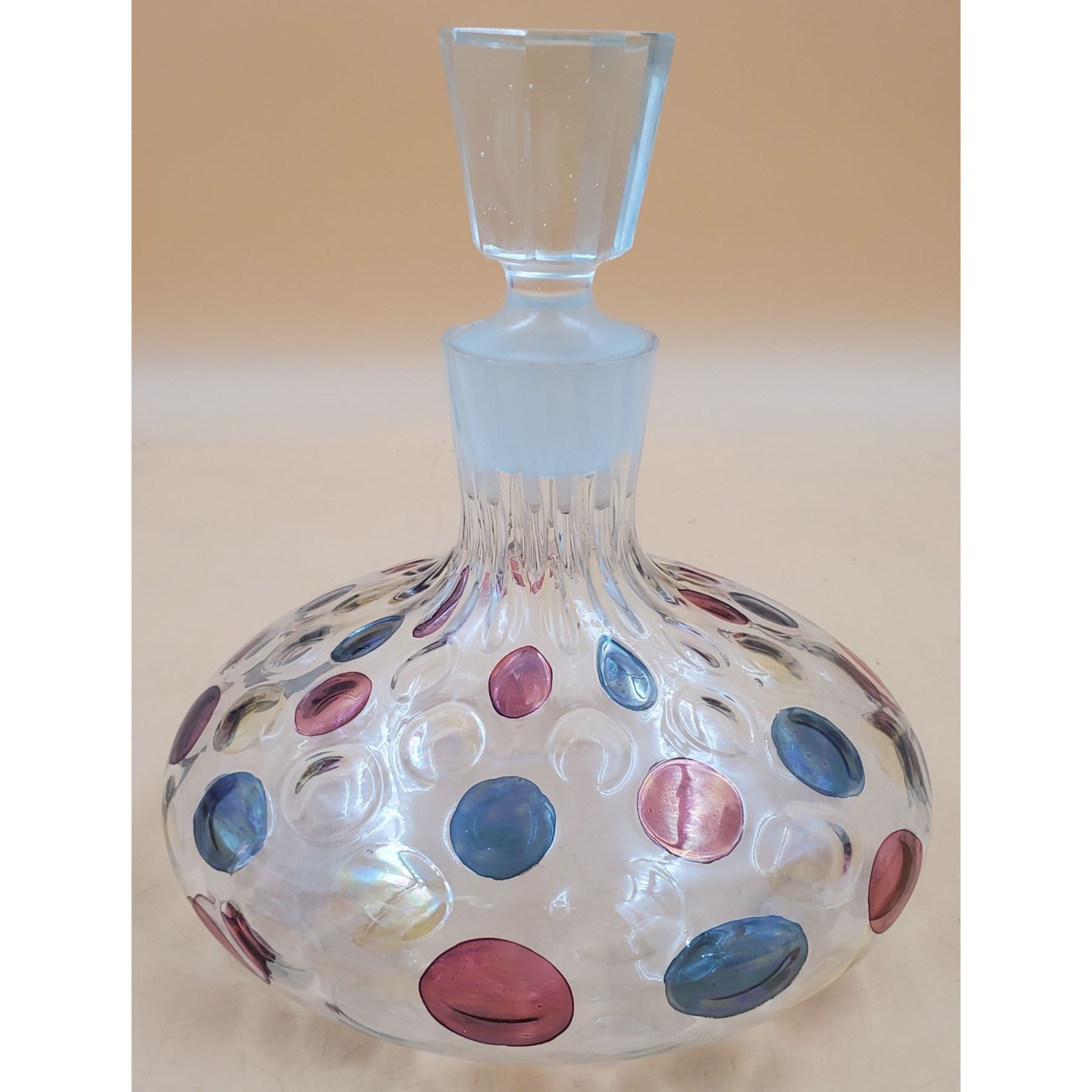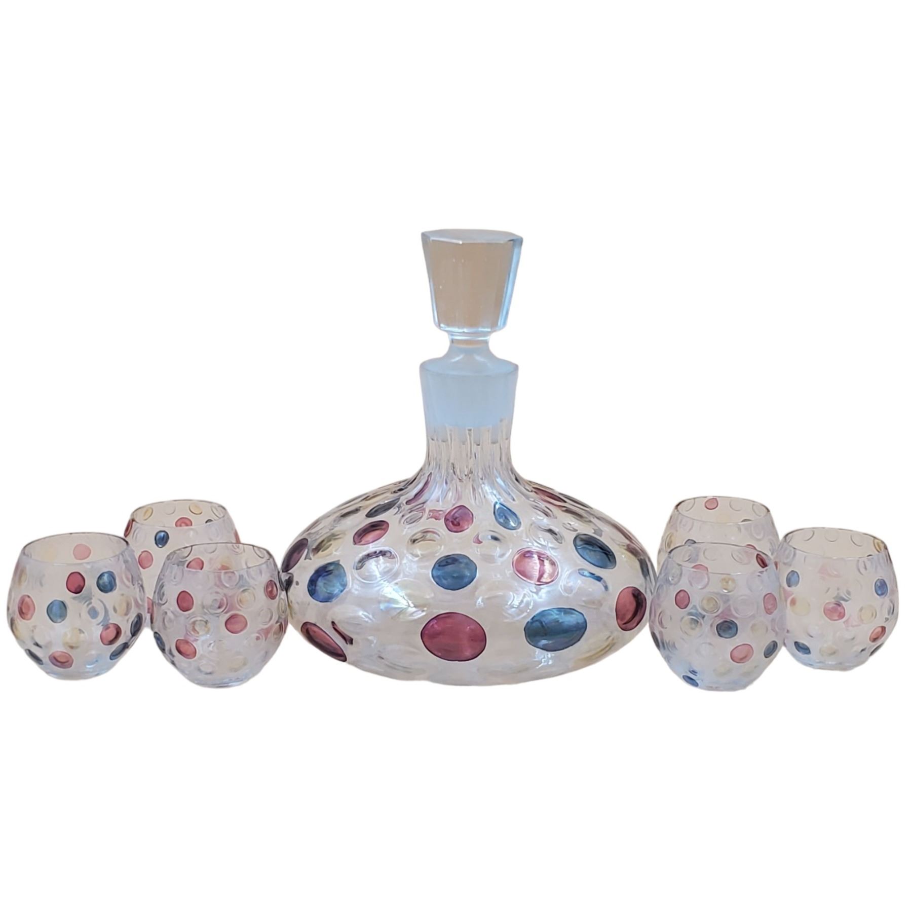 Vintage Polish Polka Dots Decanter and Glasses. The Decanter measures 8 1/8" x 8 1/8" x 6 7/8", and the stopper measures 2" x 2" x 4". Each of the cups measures 3" x 3" x 2 5/8". Provenance: One Person Private Estate Central Florida.