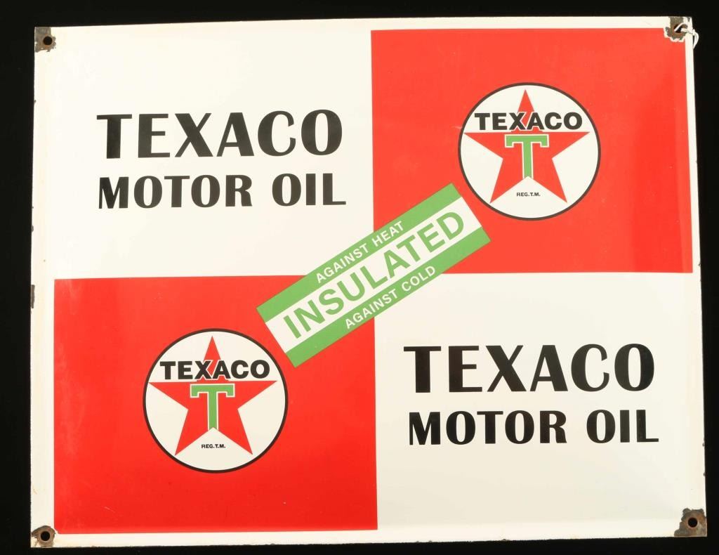 Texaco Motor Oil Porcelain advertising sign measures 16 /4" by 12 3/4". Says "Insulated Against Heat; Against Cold". Unknown age