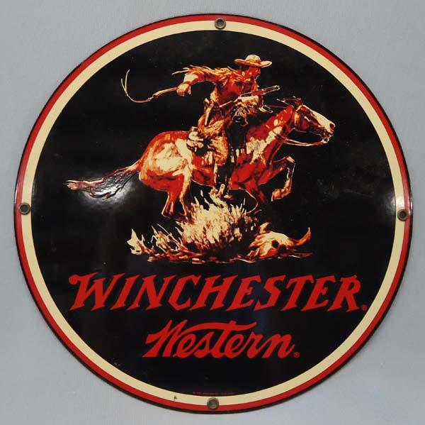 Vintage Porcelain Enamel Winchester Sign. Measures approx. 11''. ''WINCHESTER Western''. SHI $20.