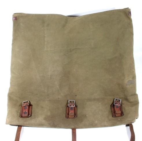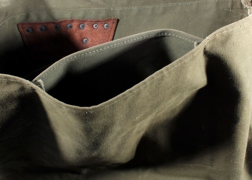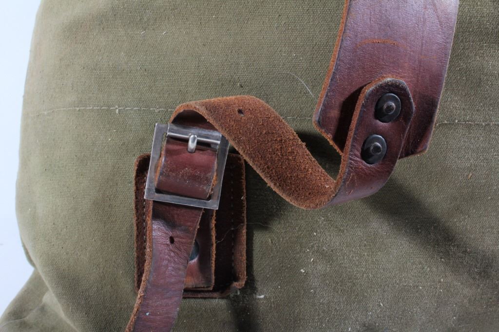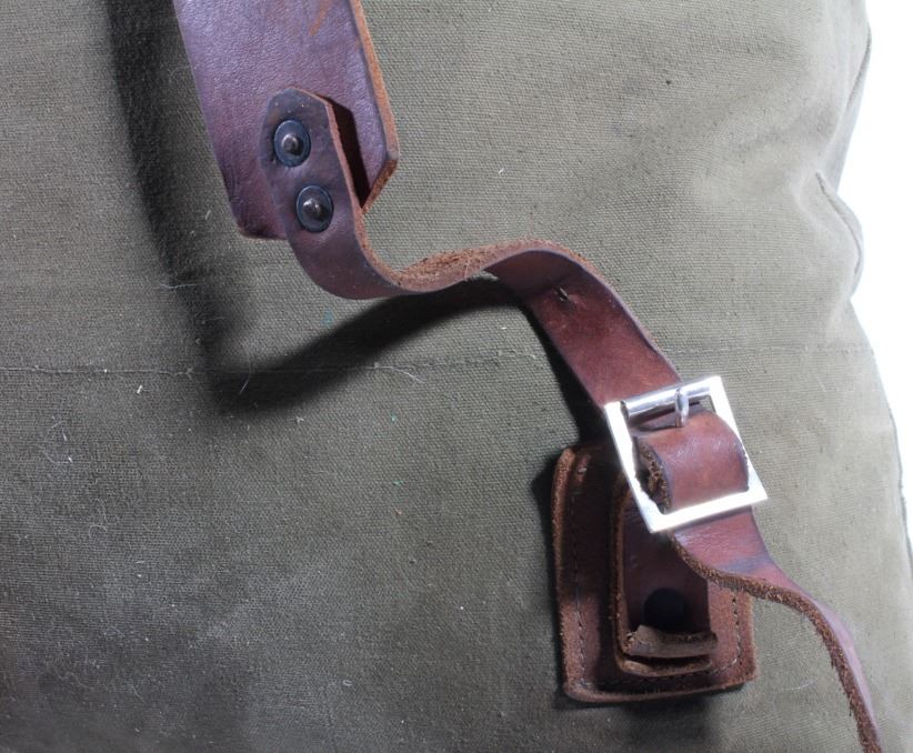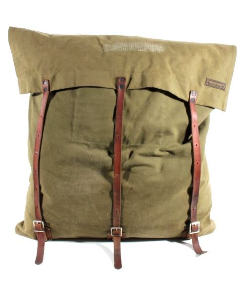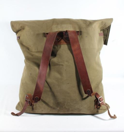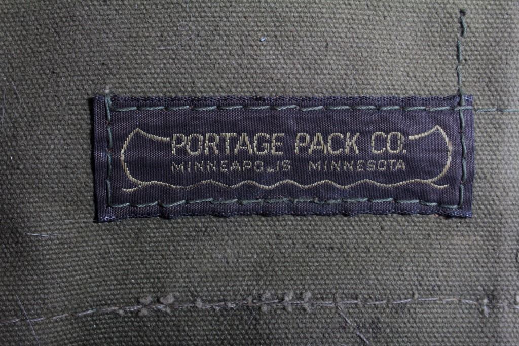 Vintage Portage Pack Co Made in Minneapolis Minnesota, green canvas & brown leather rucksack. Great for trips or backpacking anywhere on earth. One main interior compartment. Canvas lined. Adjustable leather shoulder straps. A few marks and scuffs throughout bag and light oxidation on rivets. A Duluth pack is a specialized type of backpack made of heavy canvas and leather. The packs are a traditional portage pack which are nearly square in order to fit easily in the bottom of a canoe.