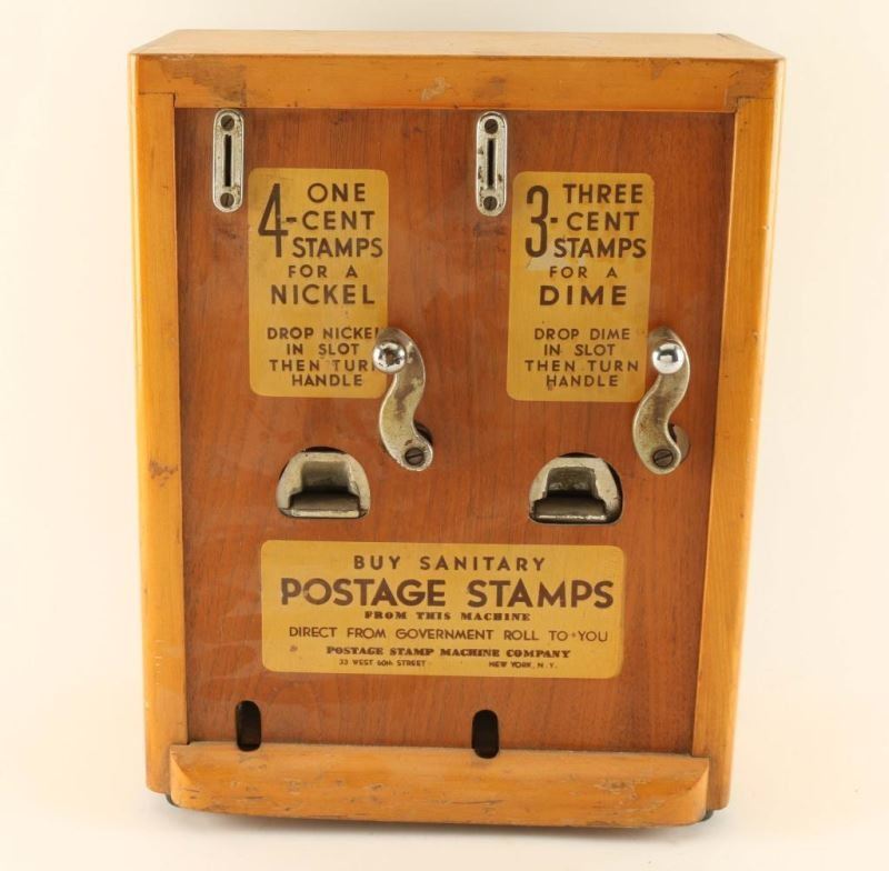 4 cent and 3 cent dispenser with wooden case made in NY, NY.