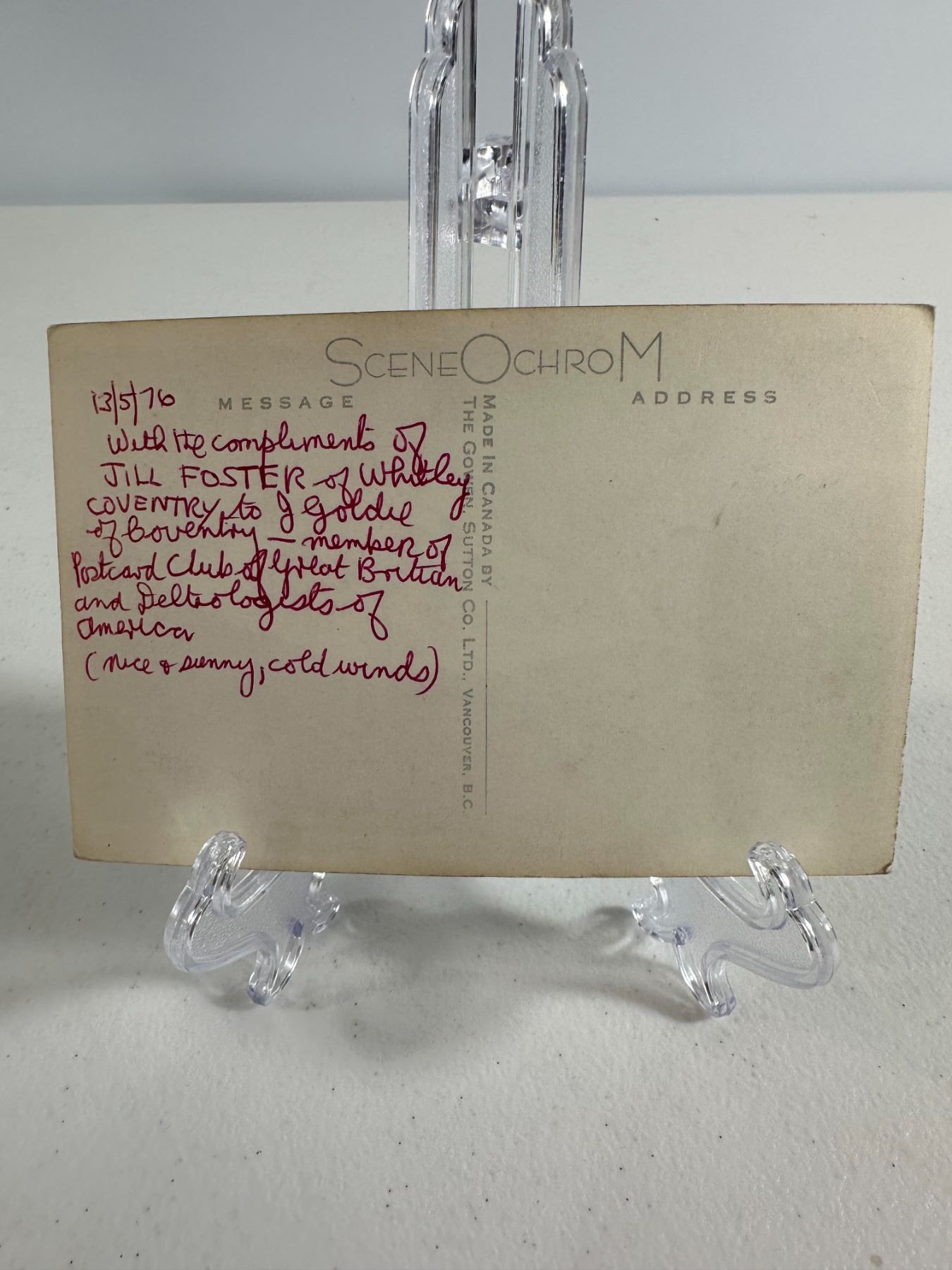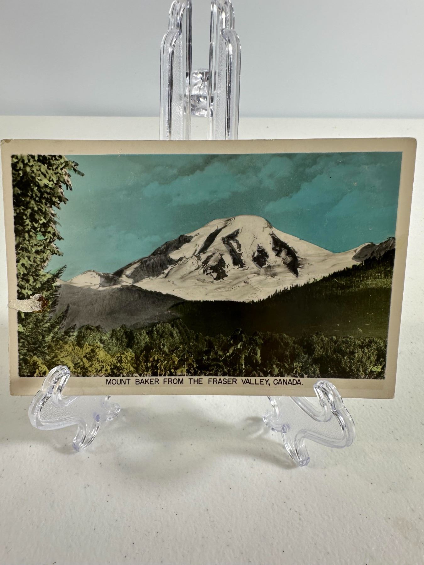 Early scenic postcard of Mount Baker from the Fraser Valley. Tinted greens and blues. Condition: Very good; small blemish at left edge.