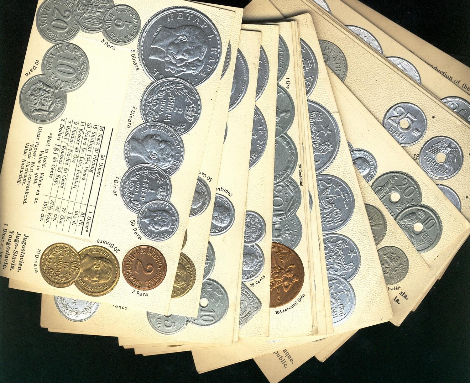 Vintage Postcards, World Coinage Money Cards. Includes cards from European Countires, includes 27 cards depicting copper, Silver and Gold coinage. Should be viewed.
