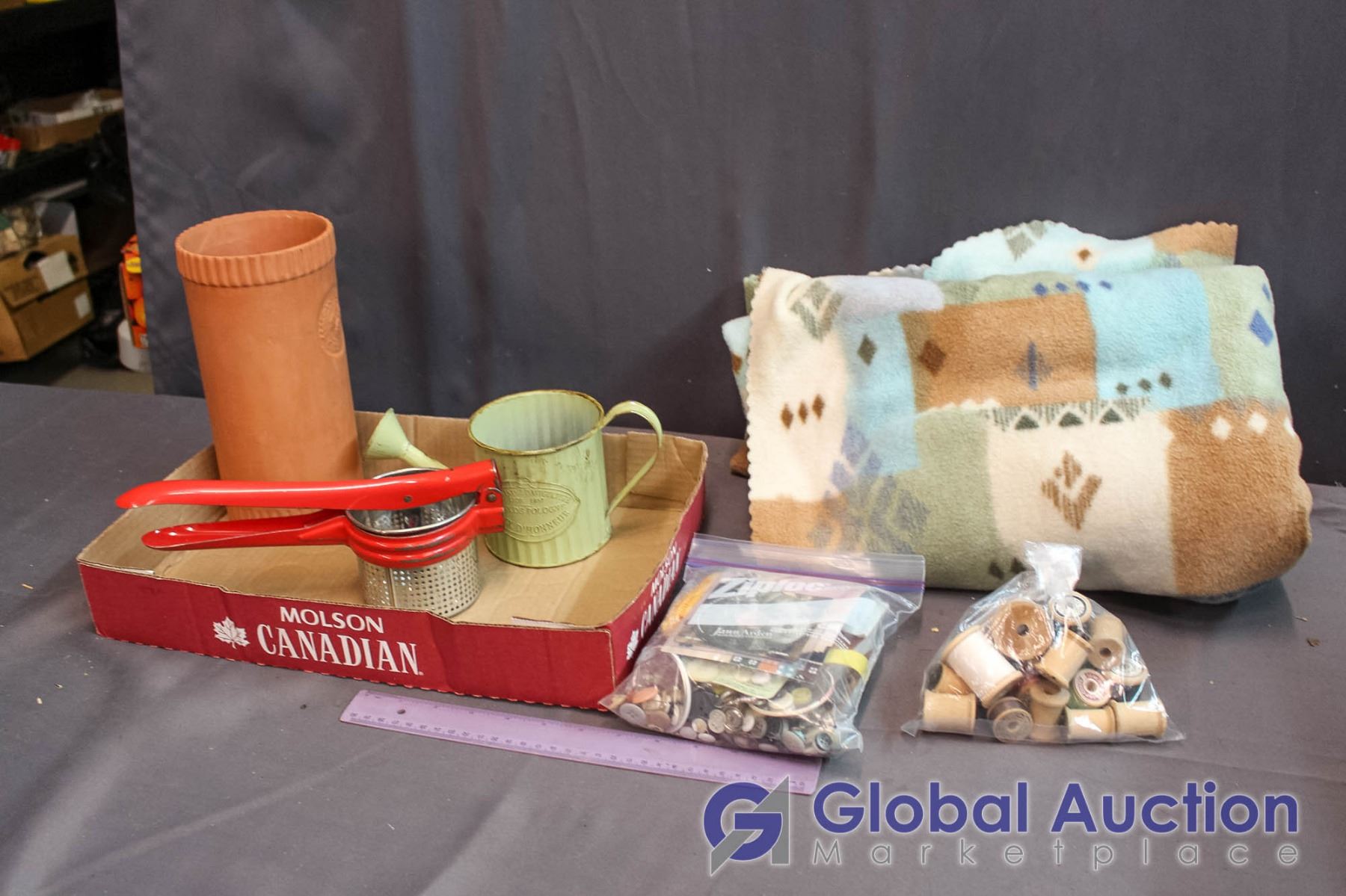 Vintage Potato Ricer, Assorted Craft Supplies, Fleece Blanket