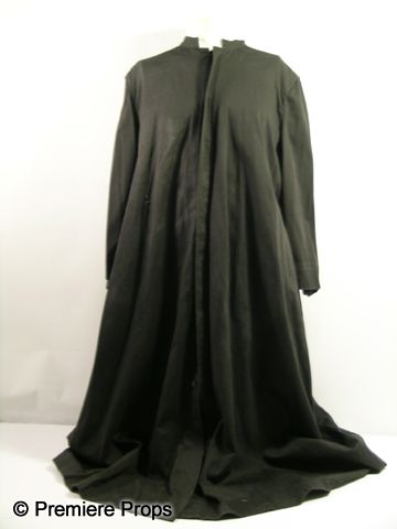 Black cassock costume for a priest, sourced from Warner Bros. wardrobe department and used in a Golden Age Hollywood production. Some wear to the back, possibly intentionally so for a film sequence.