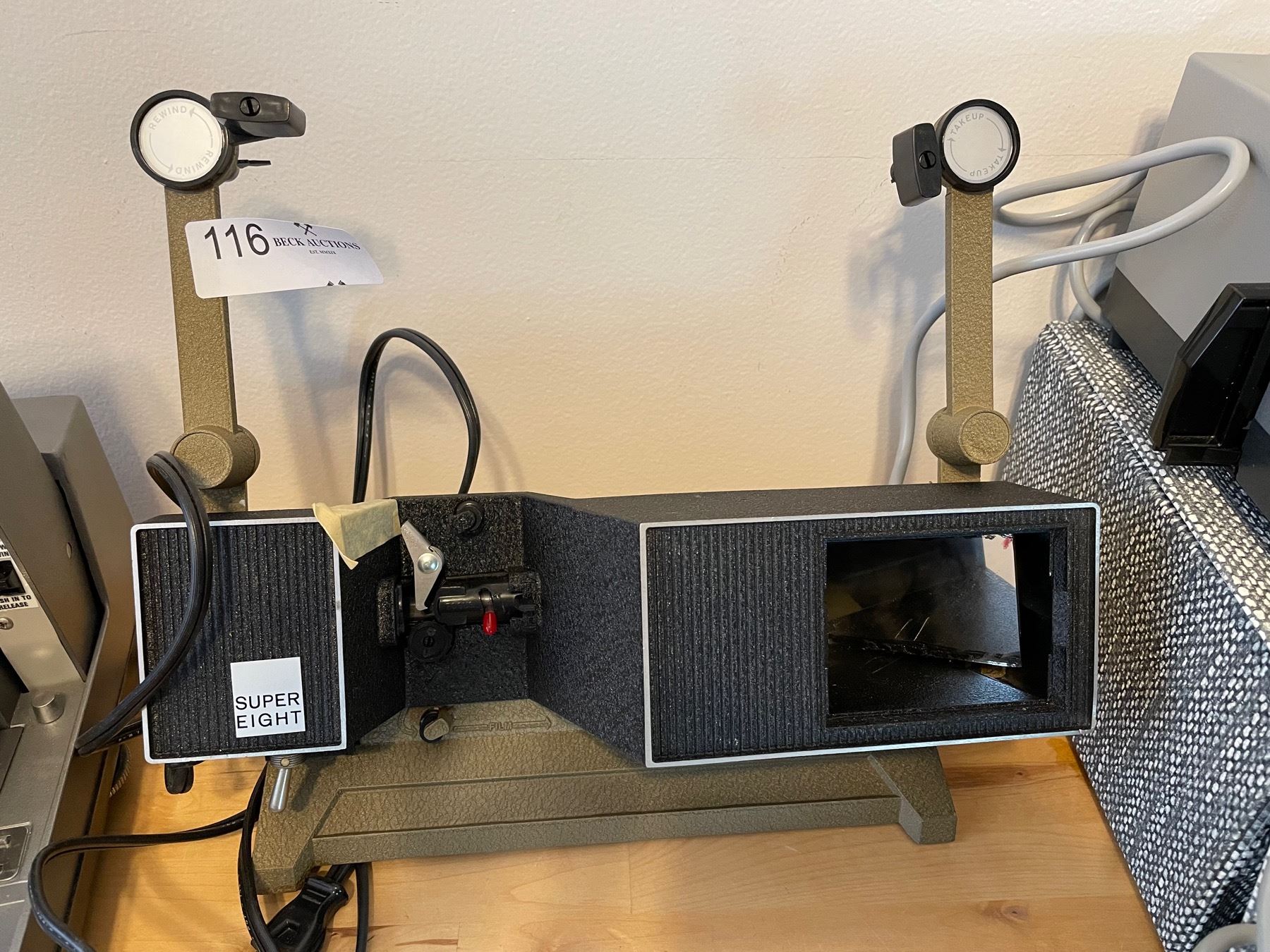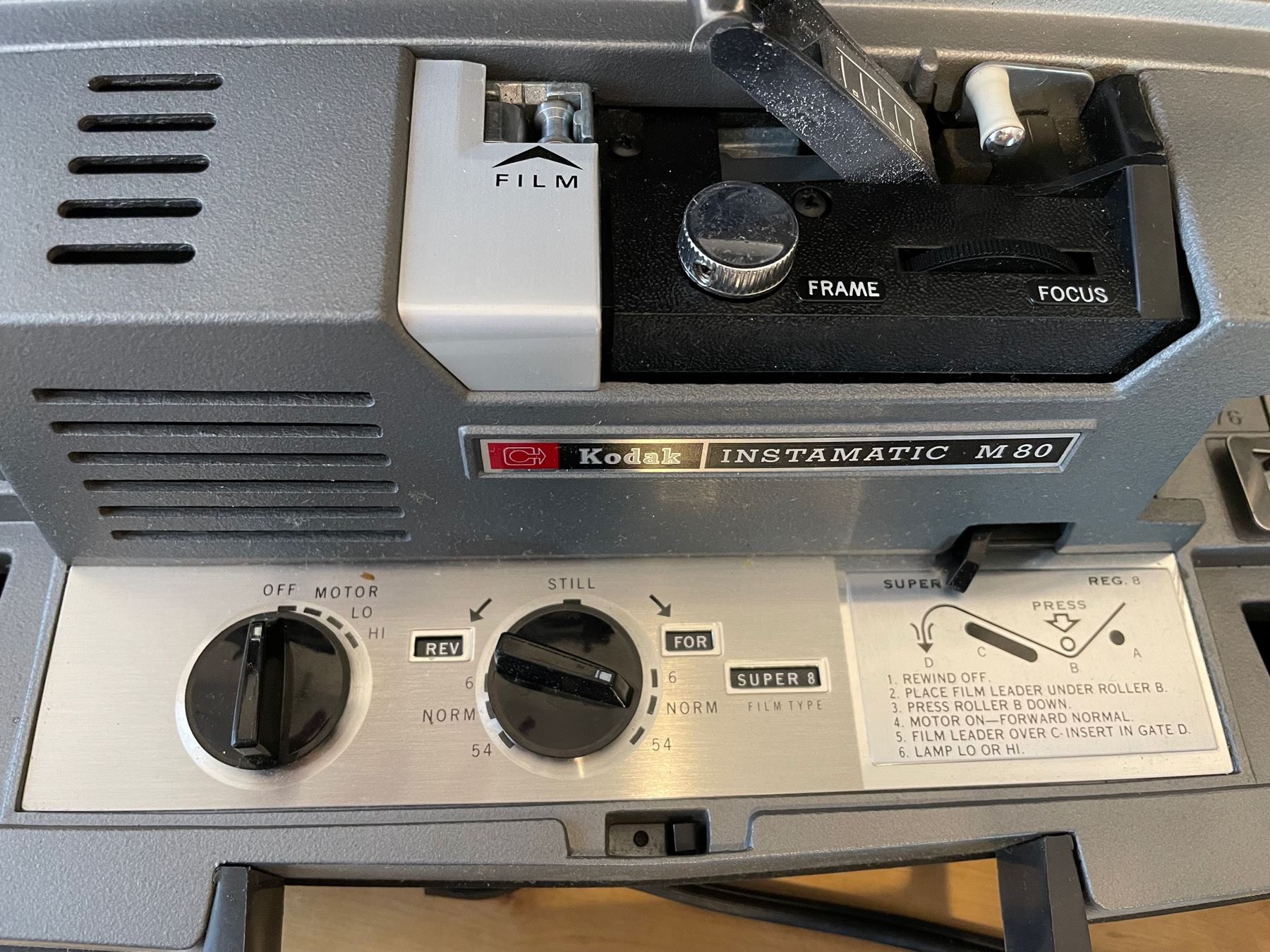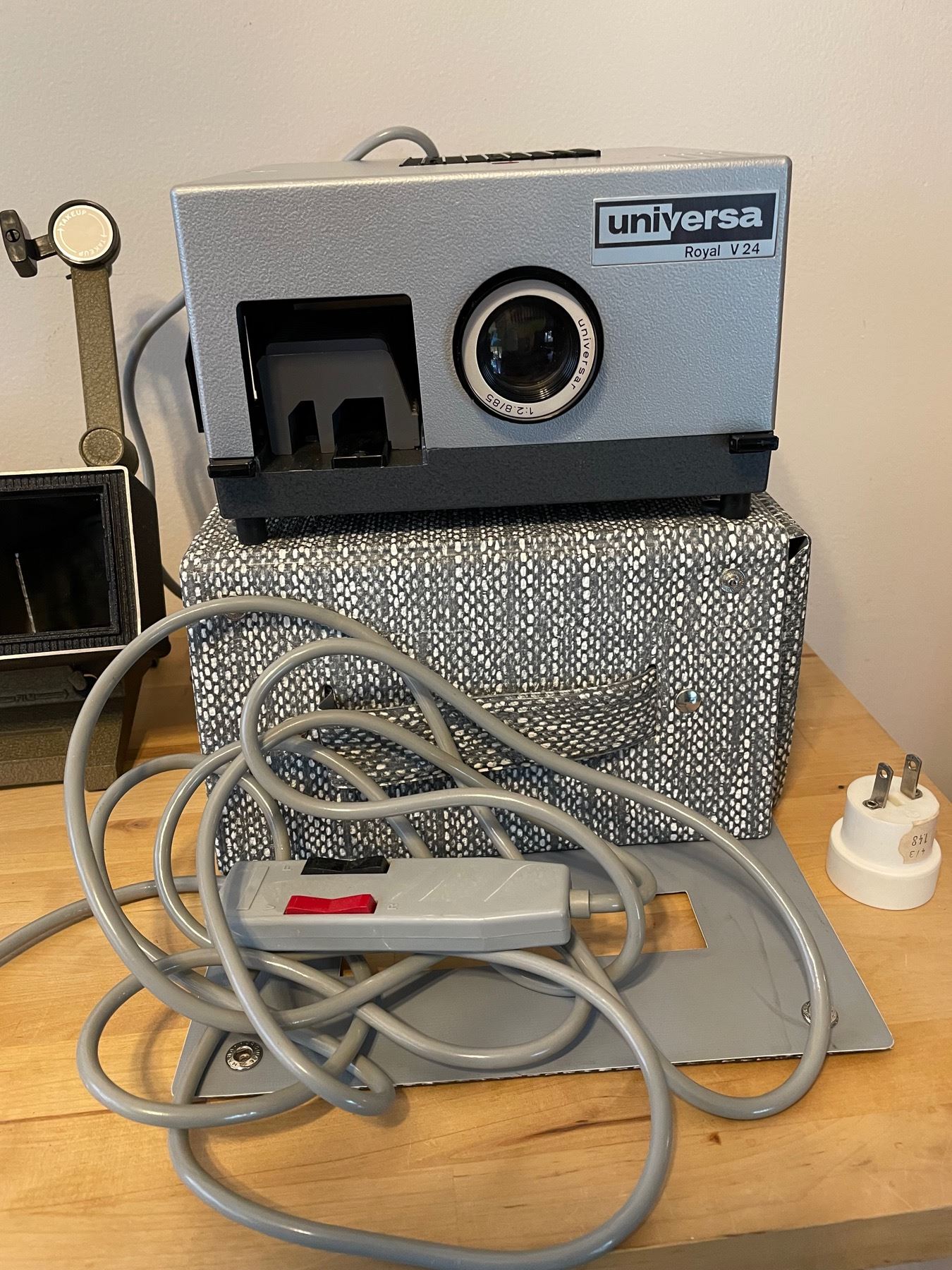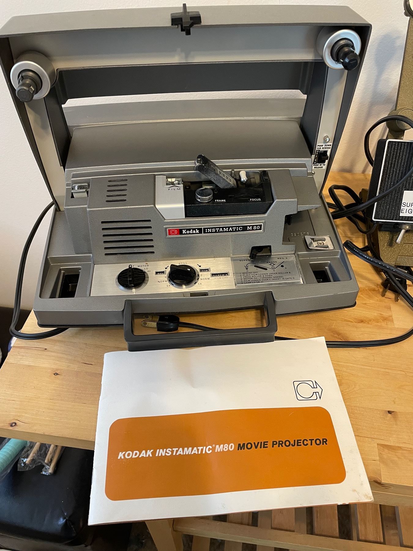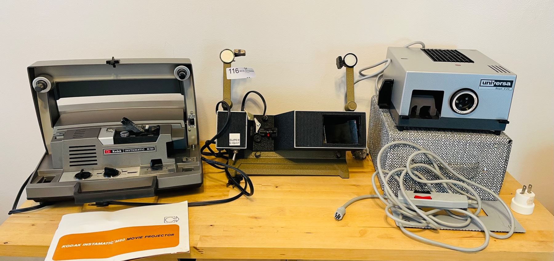 All with original boxes Kodak Instamatic M80 Movie Projector Super Eight 8mm movie editor, Universa Royal V24 movie projector with corded remote. Plug for the Universa is loose, please see pictures.
