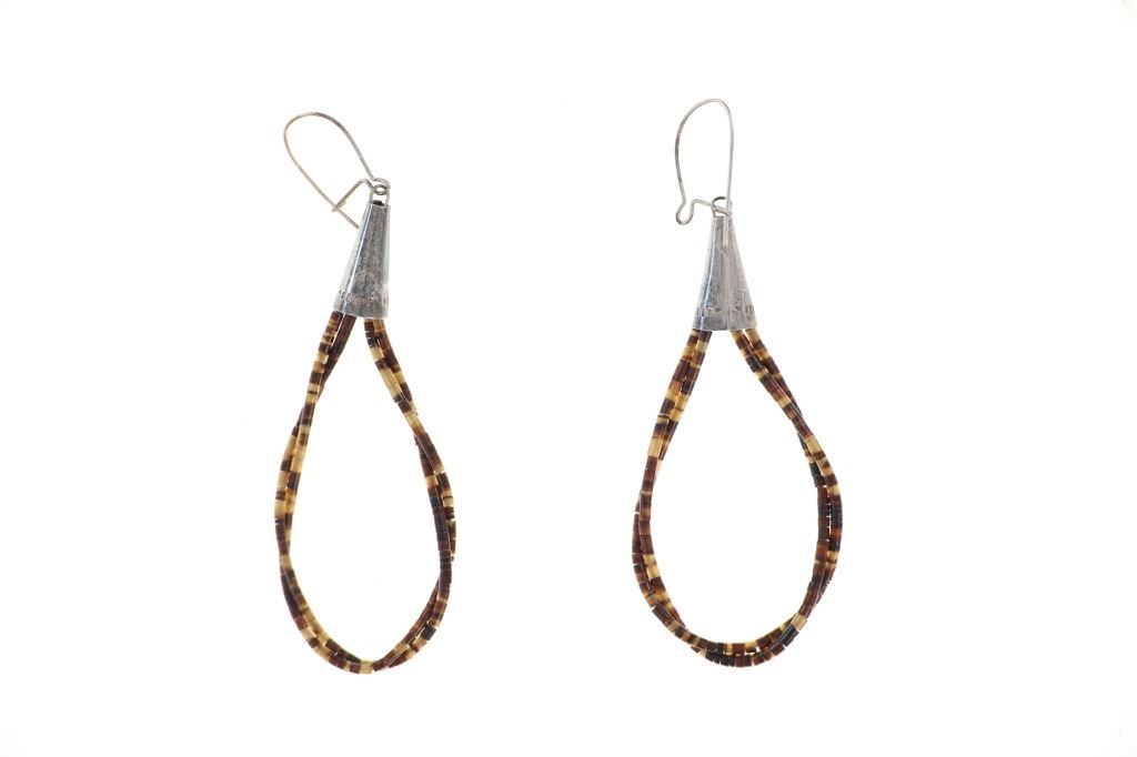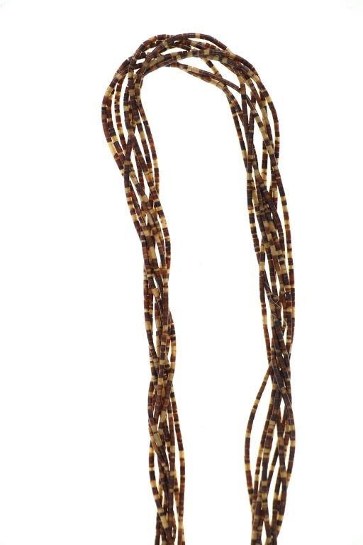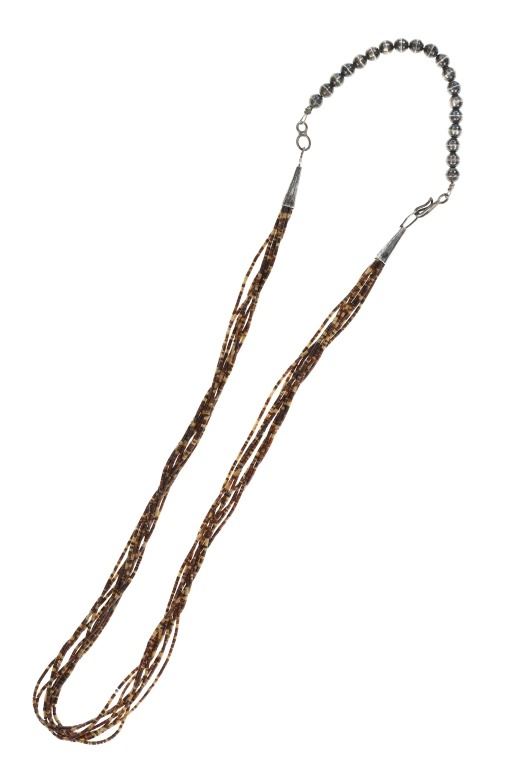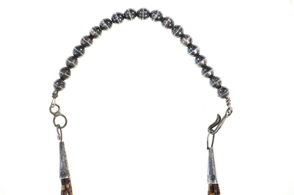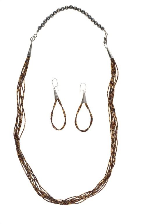 The lot features an original Pueblo heishi necklace with nice early vintage age from artists Paul & Mazie Taraino showing sterling silver and tortoise shell like Stromatolite agate, otherwise known as Turtle Shell Agate. The necklace features many small heishi turtle shell agate beads, hand rolled and strung onto thin twine. It shows colors of light brown, dark brown and black. Near the clasps of the necklace is a strand of nineteen sterling beads strung together on a metal rope. The ends of the strands are capped with sterling cones. The two strand earrings show the same hawk beak tortoise shells and are capped with sterling cones. The necklace and earrings show good condition overall with little wear and no damage present. Legal to own and sell. The necklace measures 24" L from clasp to clasp while the earrings measure 2 5/8" L x 3/4" W. They have a collective weight of 12.4 grams.* NOT TORTOISE SHELL.