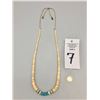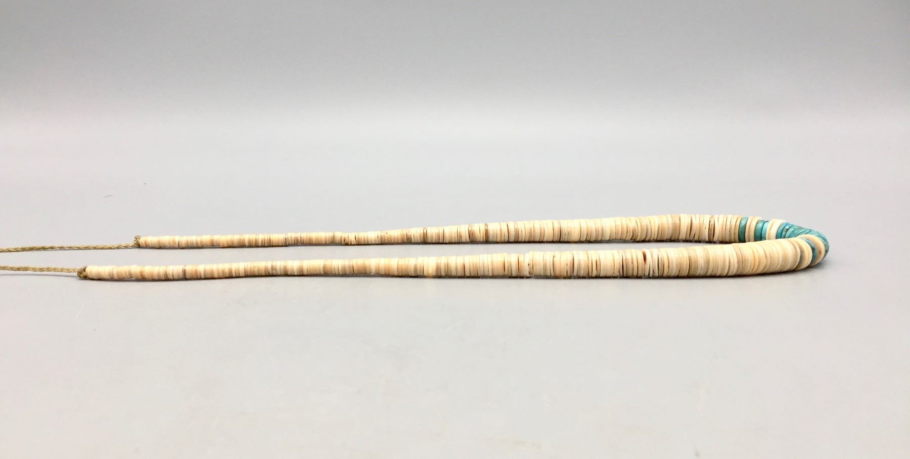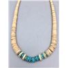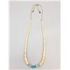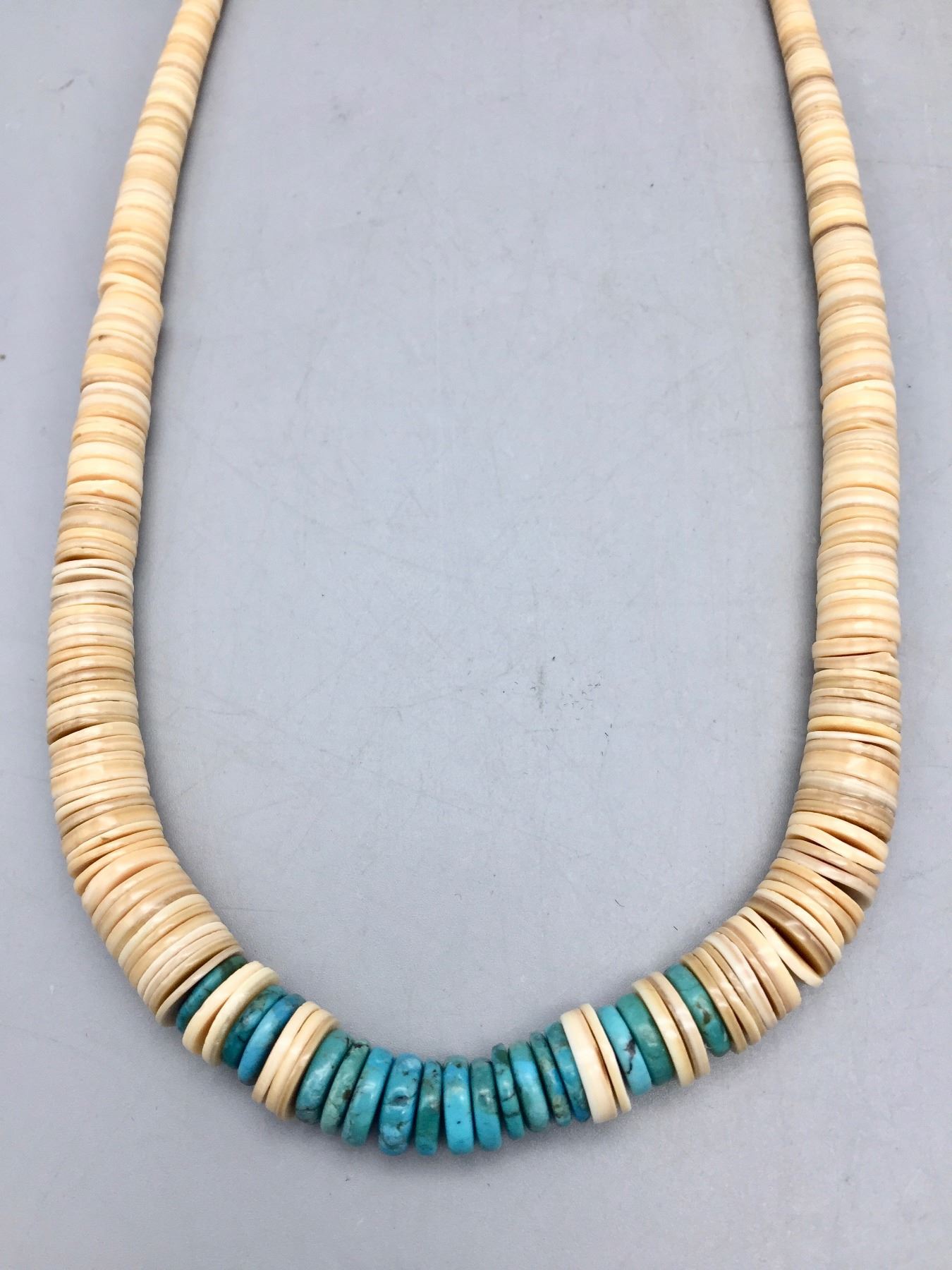 Description: For sale in this lot is a vintage, Pueblo shell necklace featuring turquoise as the accent stones in the center of the necklace. Maker: No hallmark. Approx. Age: Circa 1960s vintage. Size: Fits a 27” neck. Weighs 49.6 grams. Condition: Good for its age, normal wear expected. Please look closely at the pictures - they are an important part of our description. Shipping: There will be a $5 handling / packaging fee for shipping this lot. The actual cost of postage will be added on top of that.